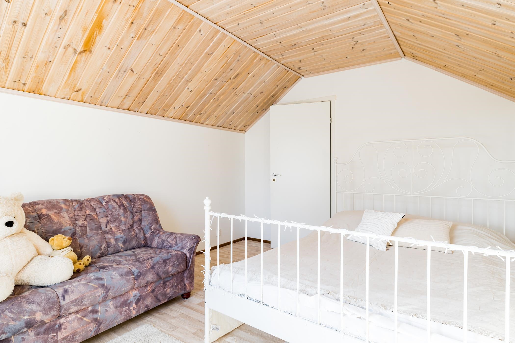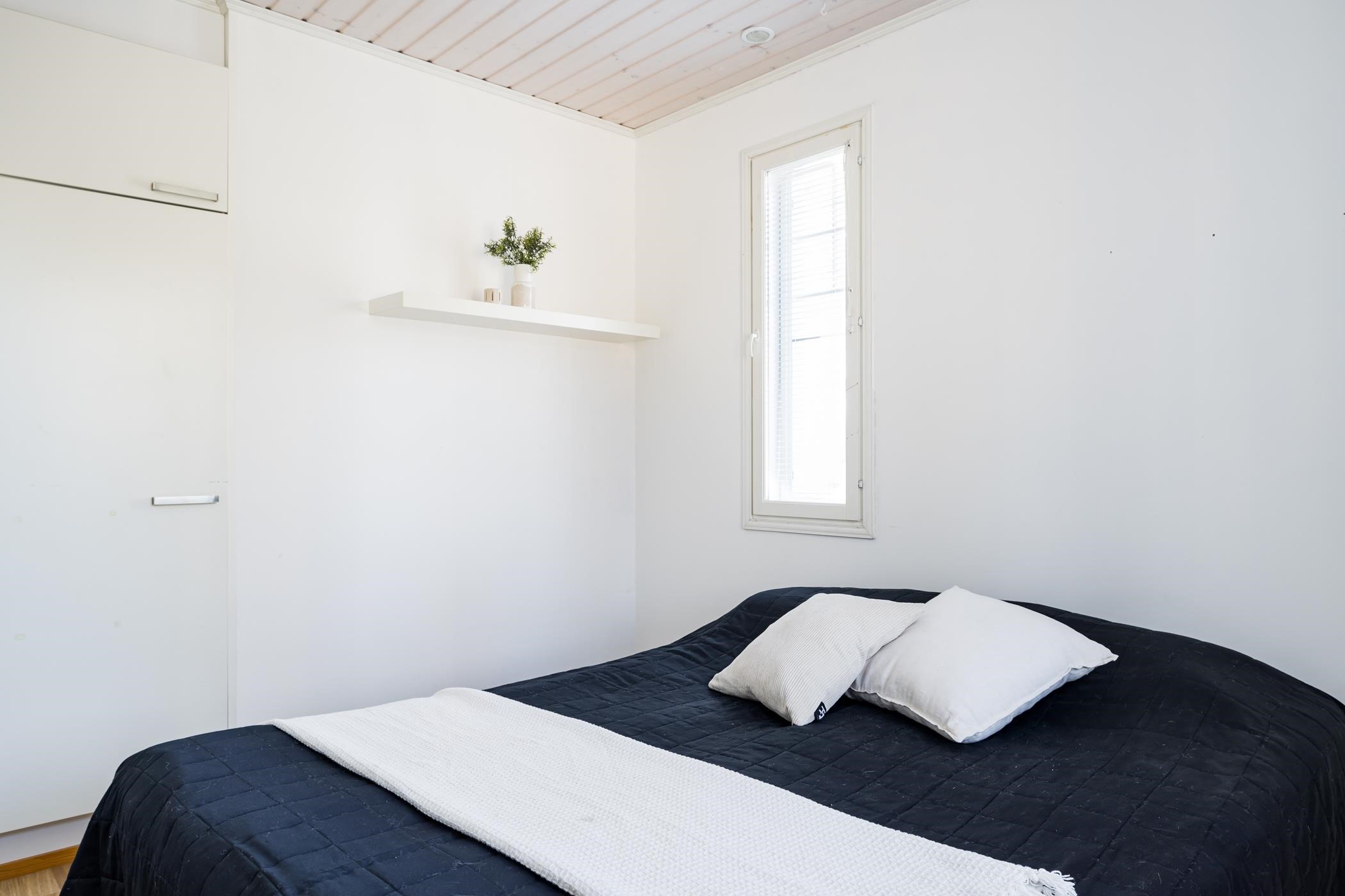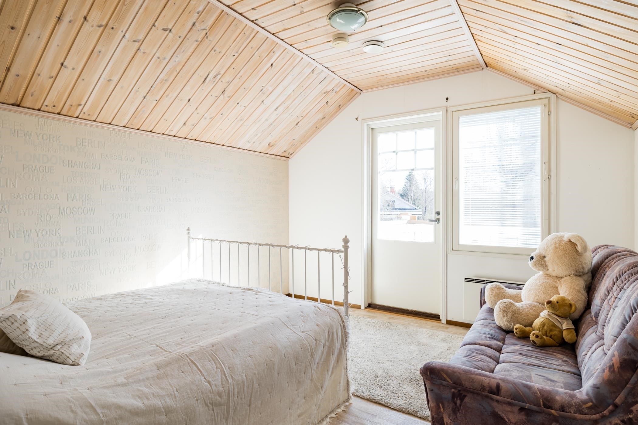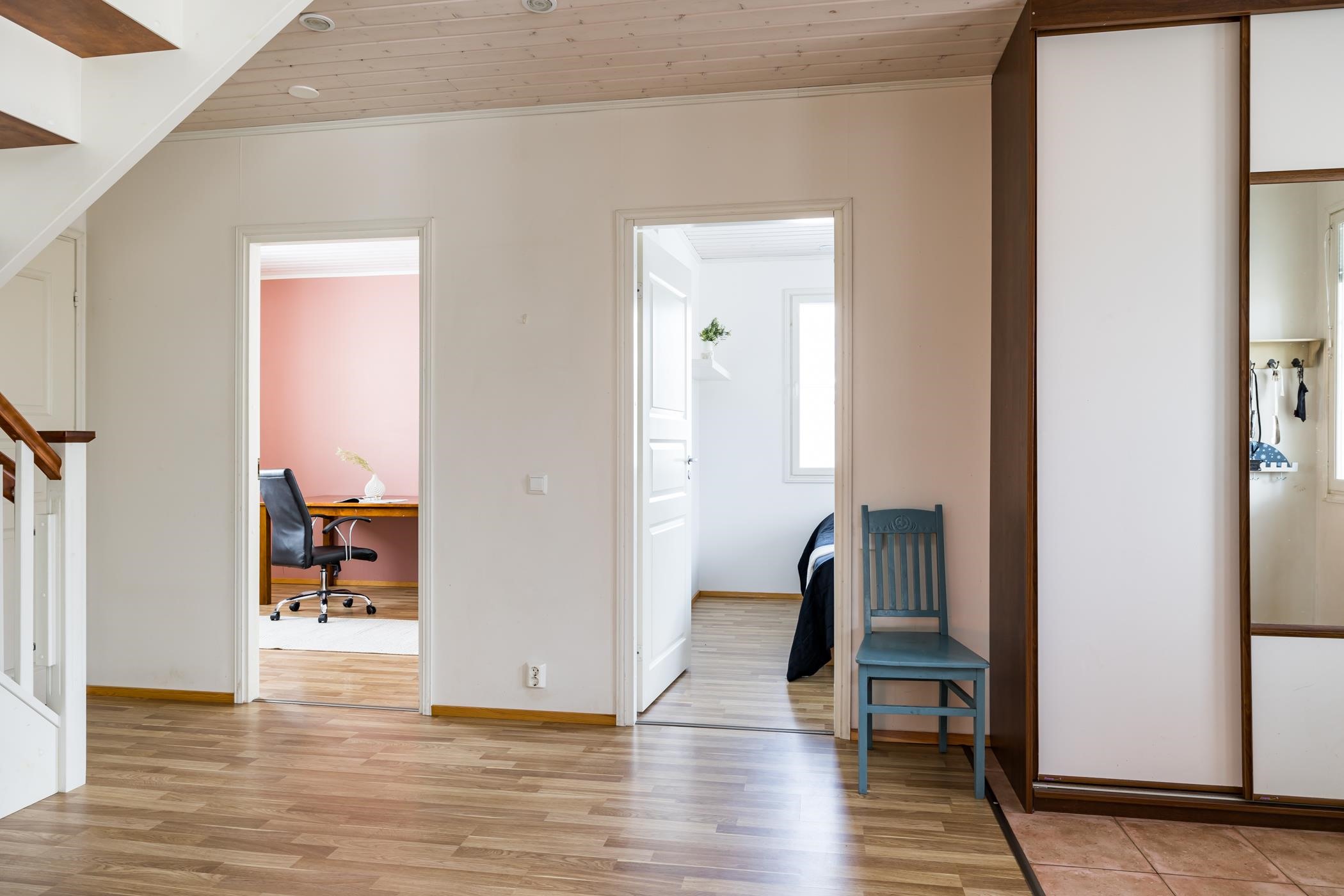 Yläkerrassa on kaksi makuuhuonetta, vaatehuone sekä varaus wc:lle. Säilytystilaa on runsaasti koko perheen tarpeisiin.