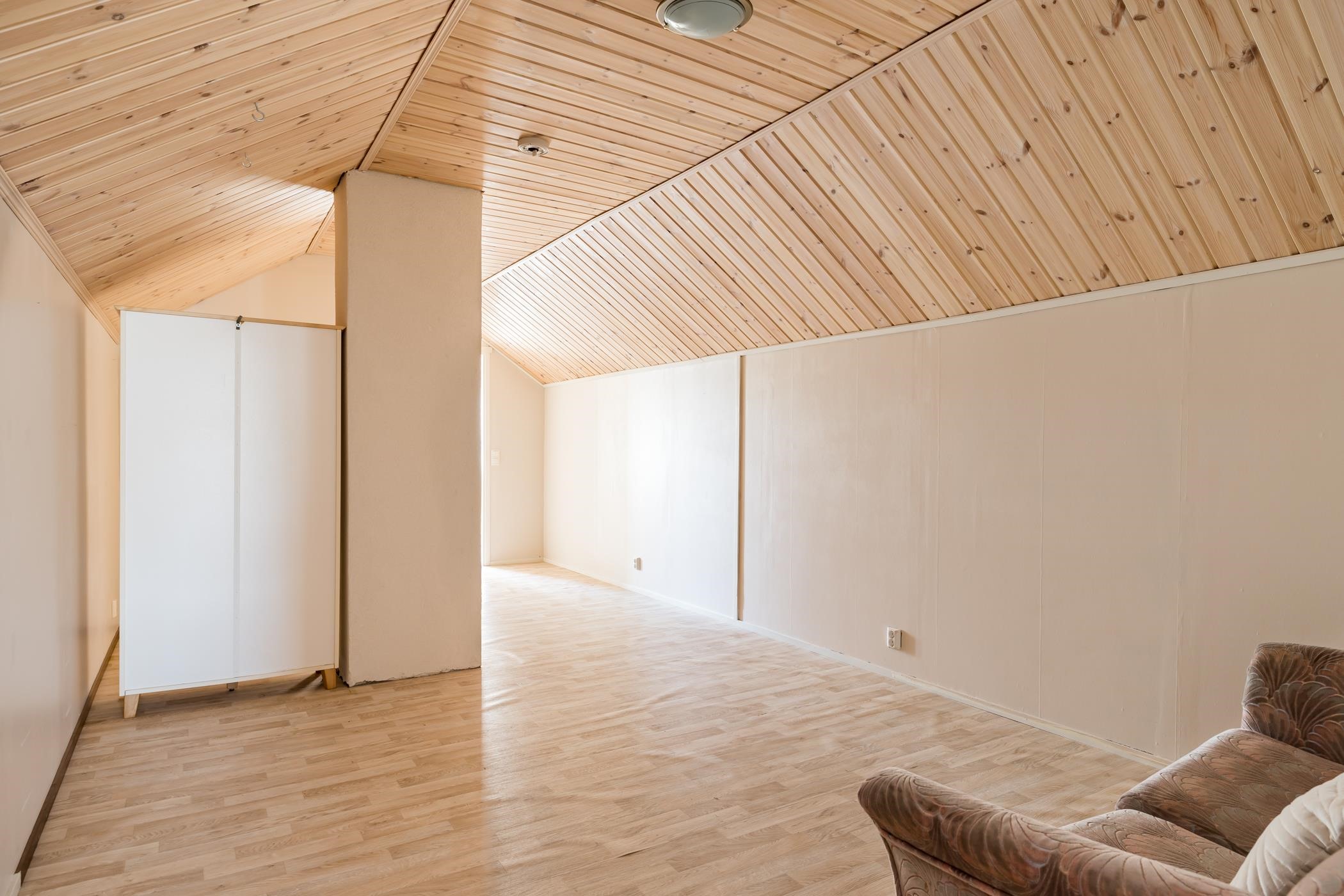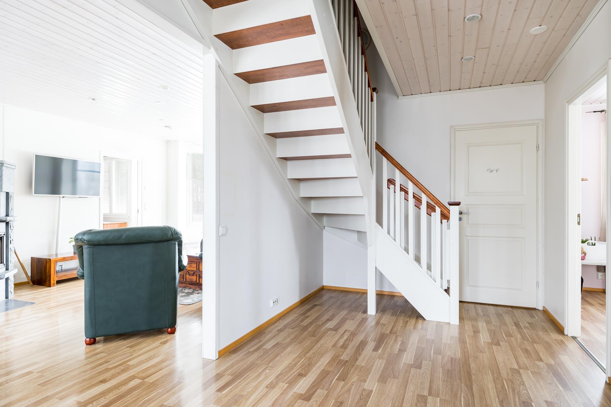 Keittiö: laatta, maali/laatta. Olohuone: laminaatti, maali/tapetti. Makuuhuone 1: laminaatti, maali. Makuuhuone 2: laminaatti, maali. Makuuhuone 3: laminaatti, maali/tapetti. Kodinhoitohuone: laatta, maali/laatta. Sauna: laattalattia, paneli. Kylpyhuone: laatta, laatta. Eteinen: laatta/laminaatti, maali. Wc: laatta, maali/tapetti. Yläkerran vaatehuone: muovimatto. Yläkerran makuuhuone: muovimatto, maali. Yläkerran aula: muovimatto, maali/tapetti.