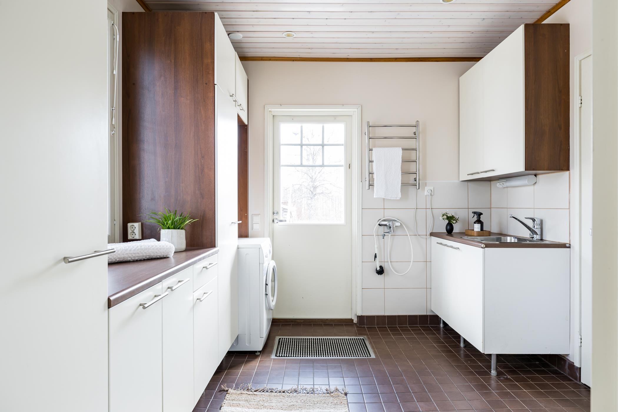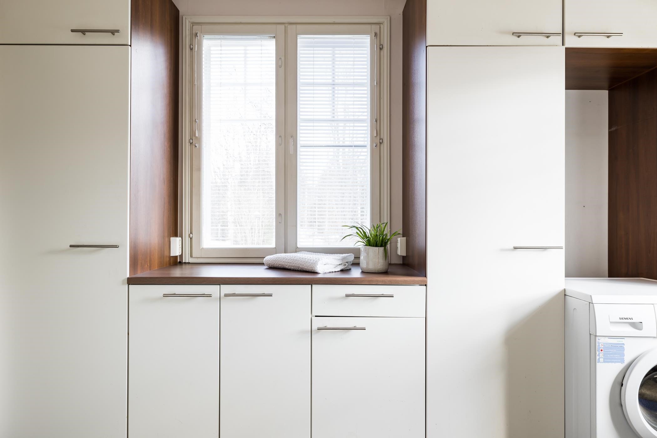 Alakerrasta löytyvät tilava keittiö ja ruokailutila, kolme makuuhuonetta, viihtyisä olohuone, sauna ja kylpyhuone sekä erillinen wc. Avaraan ja valoisaan ruokailutilaan mahtuu suuri ruokapöytä, jonka äärellä on mukava viettää aikaa perheen ja ystävien kanssa. Arjen sujuvuutta lisää sisääntulokerroksessa sijaitseva kodinhoitohuone omalla sisäänkäynnillä.