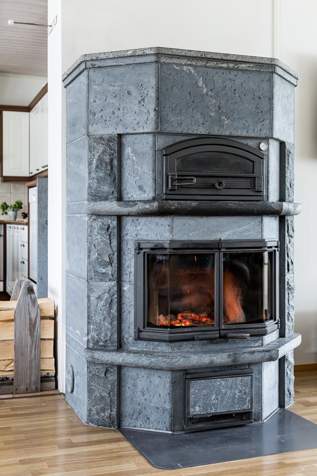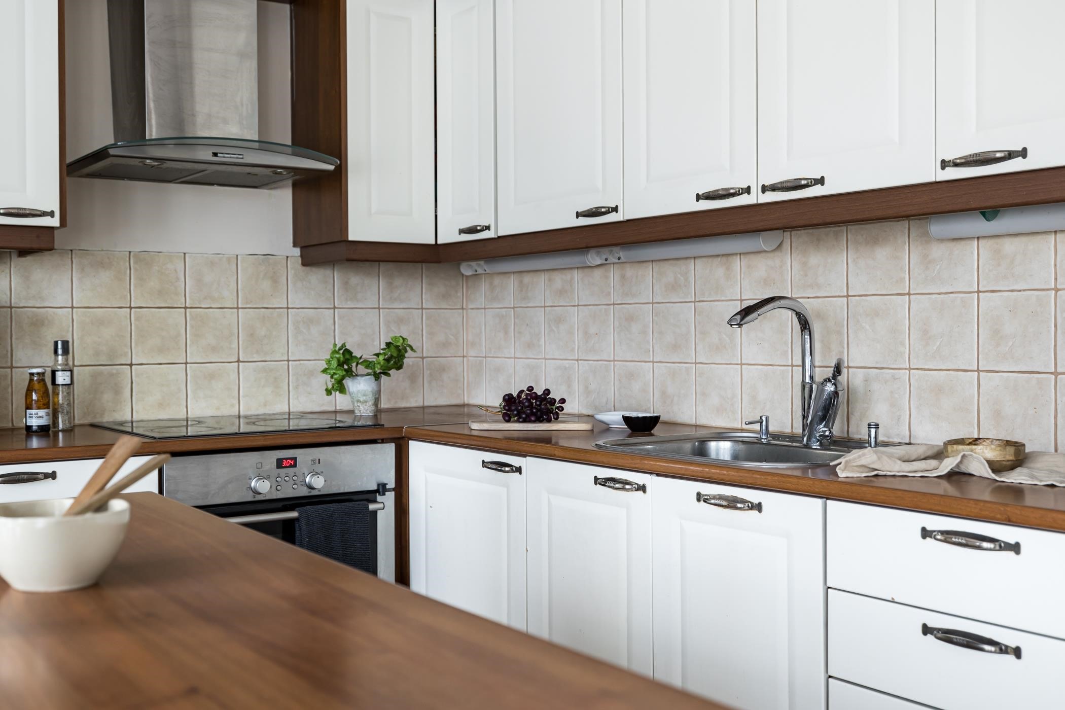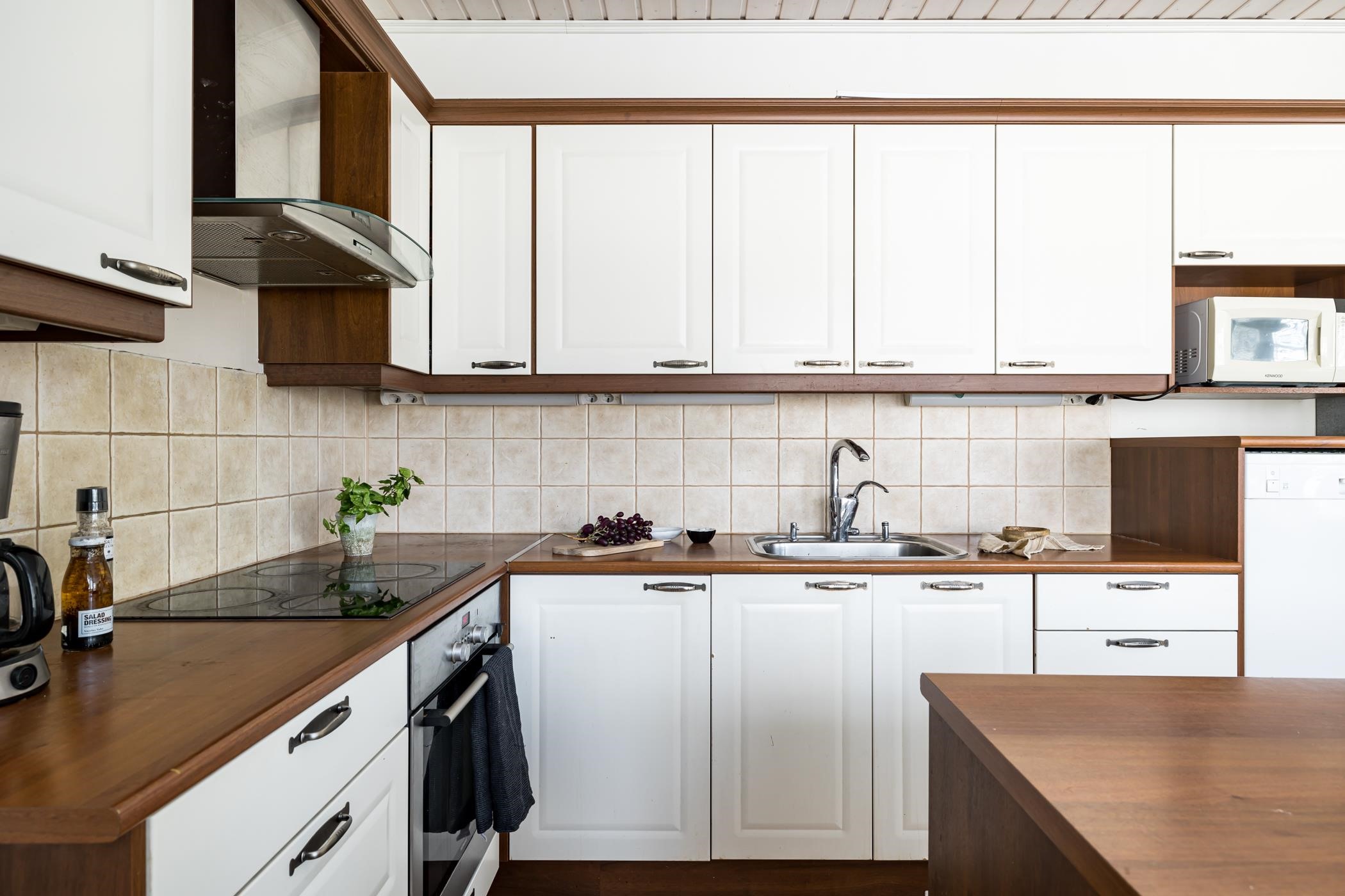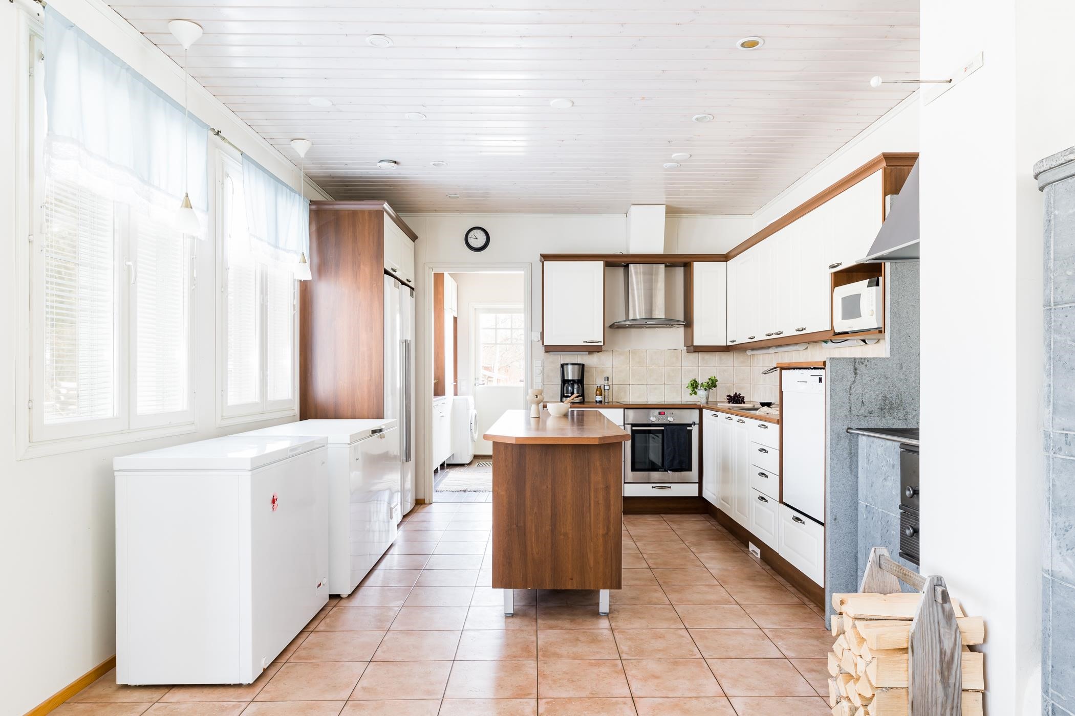 - Jääkaappi, pakastekaappi, erillisuuni, induktioliesitaso, liesituuletin, astianpesukone, kaapistot, irrallinen saareke, puuhella, kiinteät valaisimet.