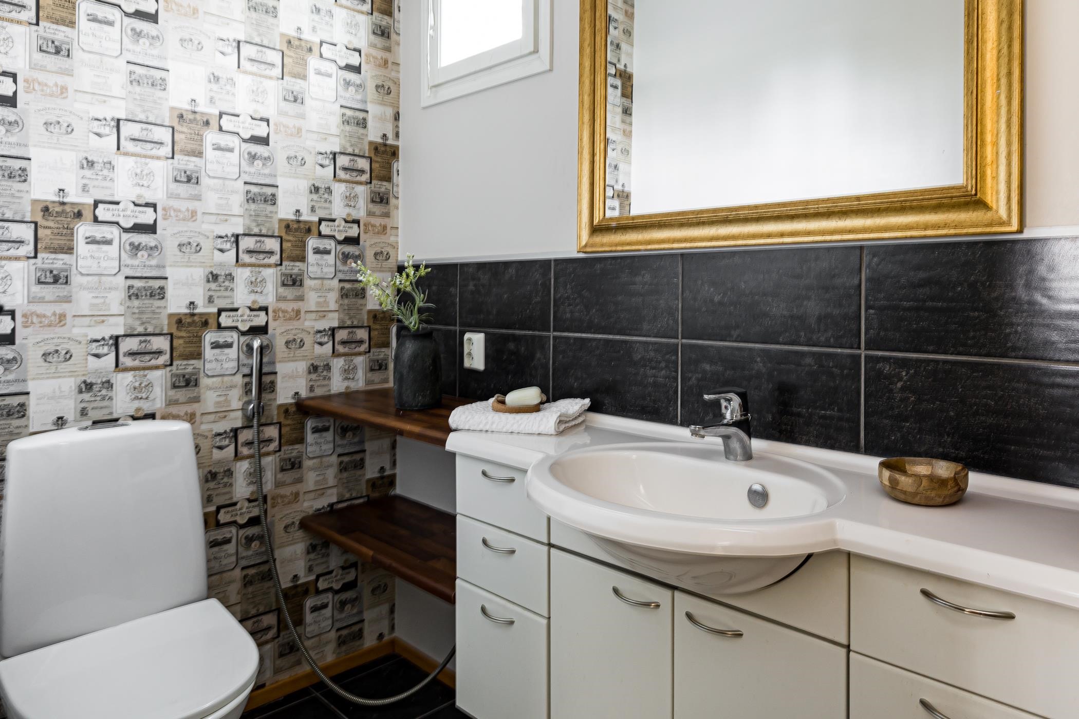 - Saunassa Harvia heti valmiskiuas. Kylpyhuoneessa suihku, wc istuin ja lavuaari. Erillinen wc alakerta: peilit,, allaskaappi, lattialämmitys. Kodinhoitohuoneessa kaapit, pesukoneliitäntä.