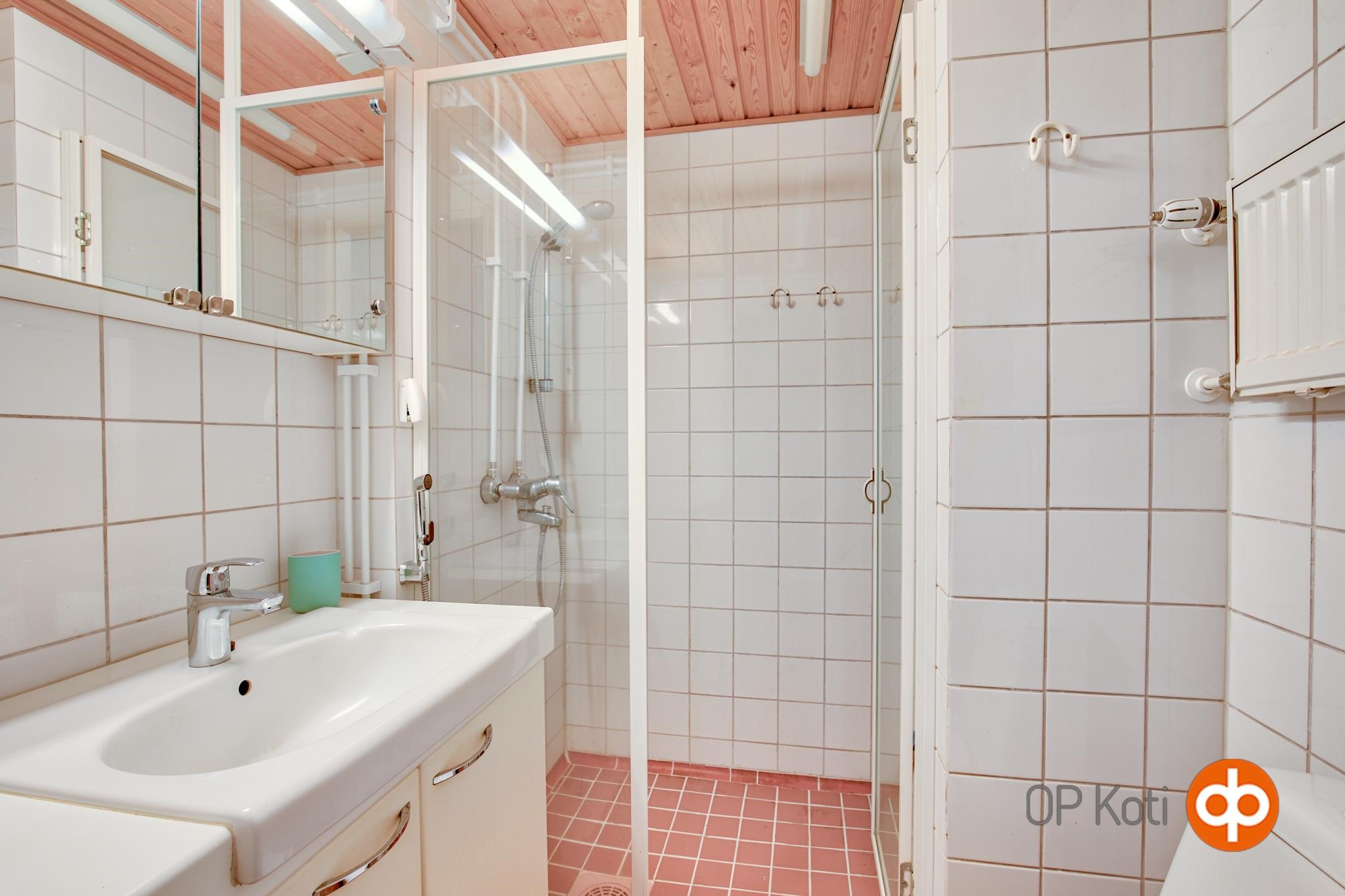 - Kylpyhuone, suihku, suihkuseinä, allaskaappi, kiinteät valaisimet.