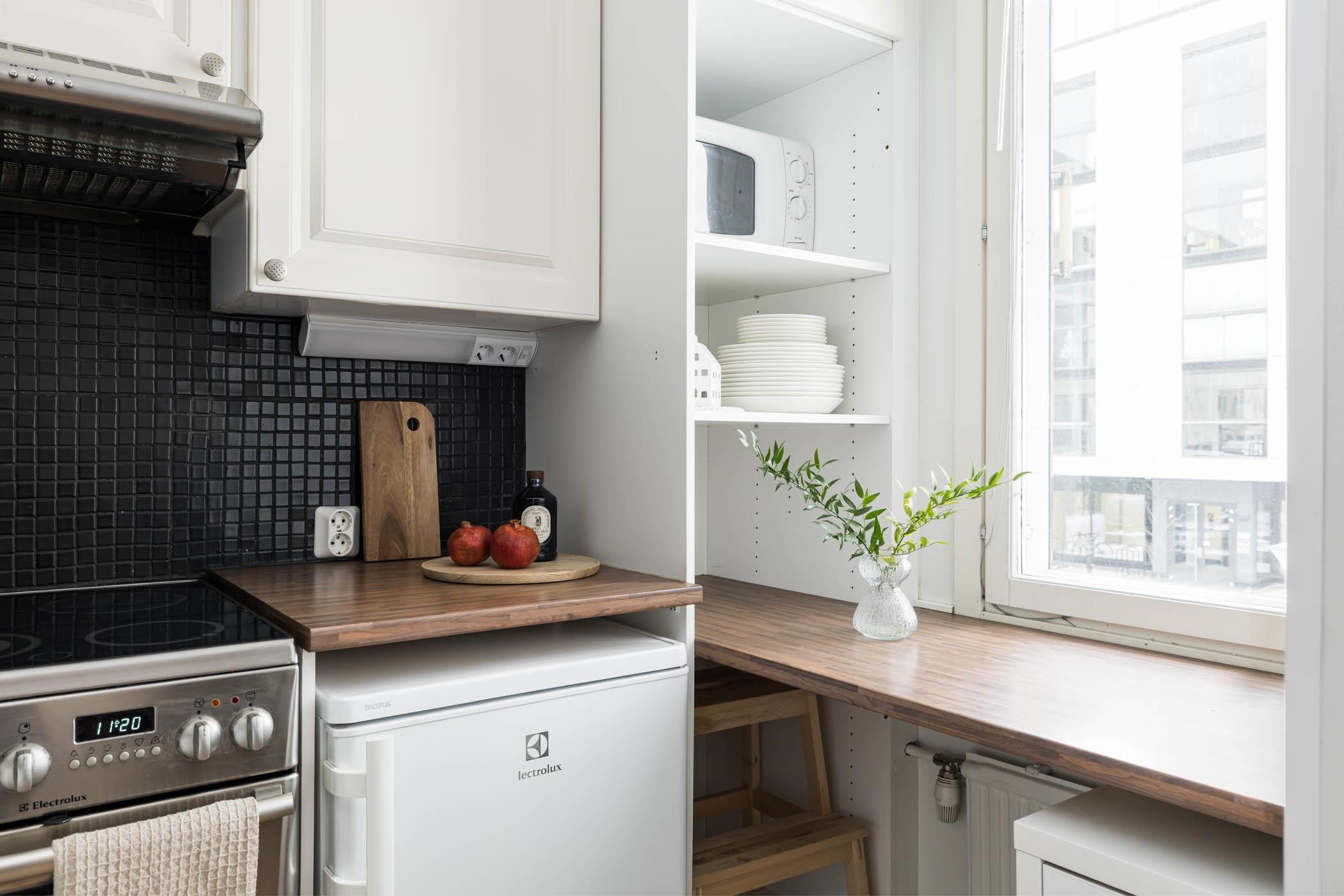 Tämän kodin sijainti on täysi kymppi Tampereen keskustan ytimessä, Tammelantorin ja rautatieaseman välissä - kuitenkin rauhallisessa ympäristössä. Asunto sijaitsee ensimmäisessä asuinkerroksessa, mutta ei maan tasalla. Pohjaratkaisu on toimiva, ja kaikki 35 neliötä on käytetty järkevästi hyödyksi. Olohuoneesta on käynti lasitetulle parvekkeelle, joka tuo mukavasti lisätilaa asumiseen. Säilytystilaa tarjoaa käytännöllinen vaatehuone. Kylpyhuone on remontoitu taloyhtiön putkiremontin yhteydessä.