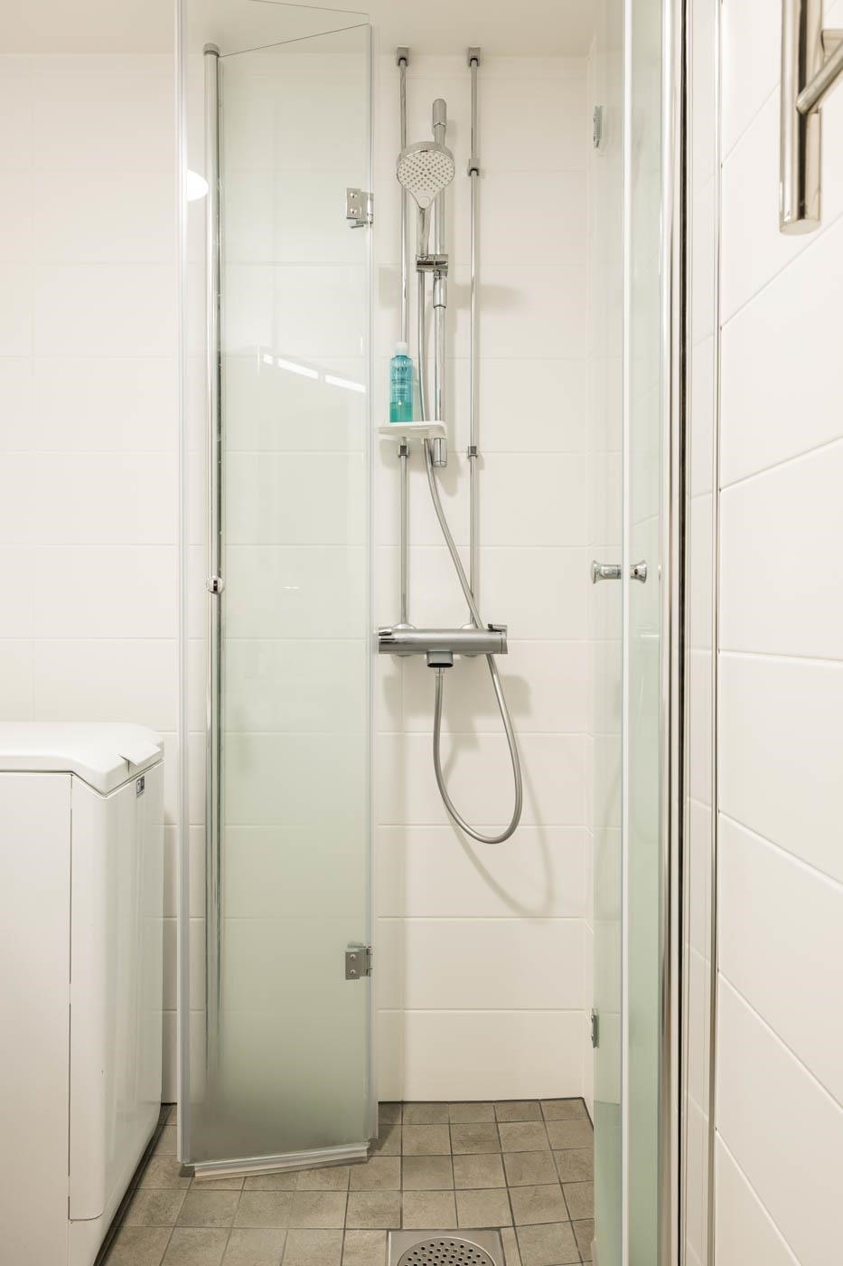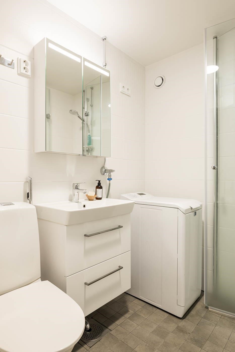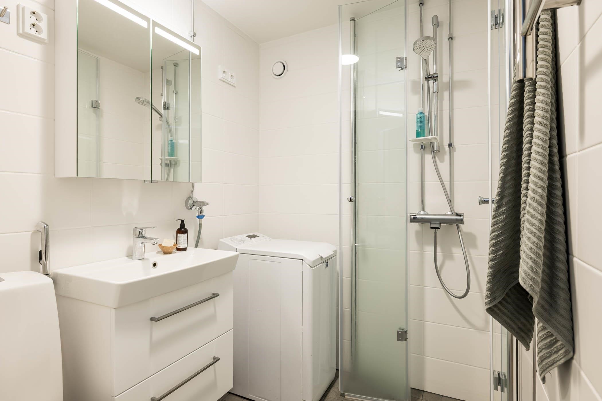 - Kylpyhuone, suihku, suihkuseinä, peilikaappi, allaskaappi, pesukoneliitäntä, lattialämmitys, pyyhepatteri.