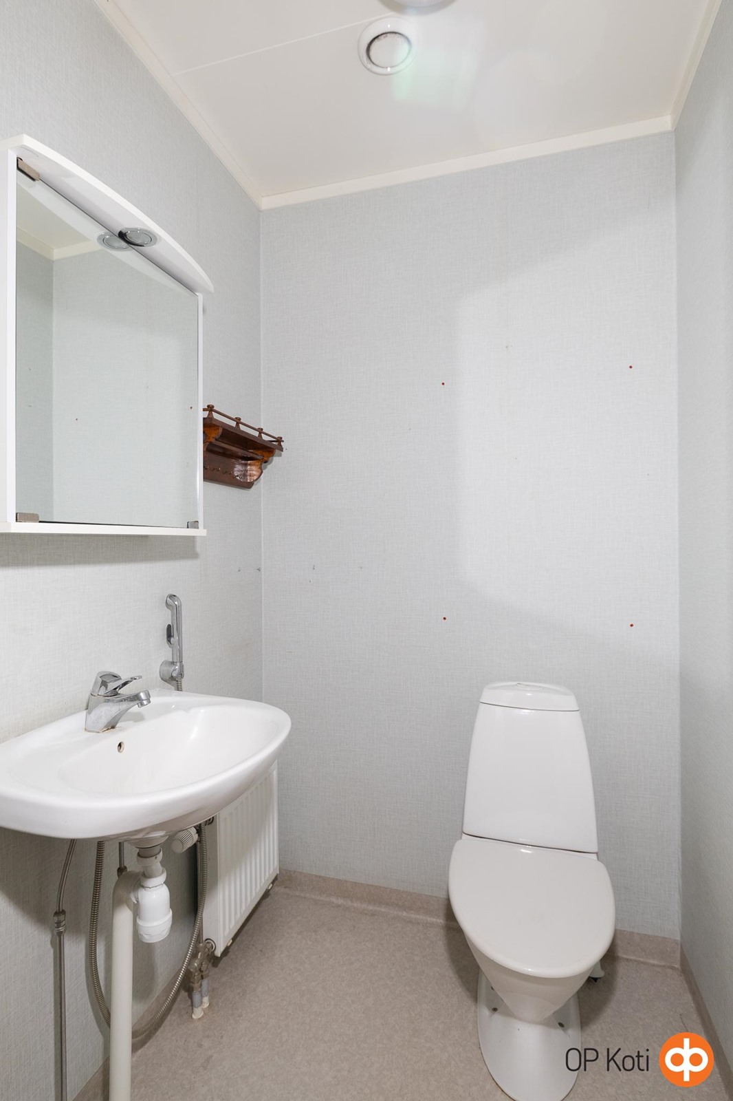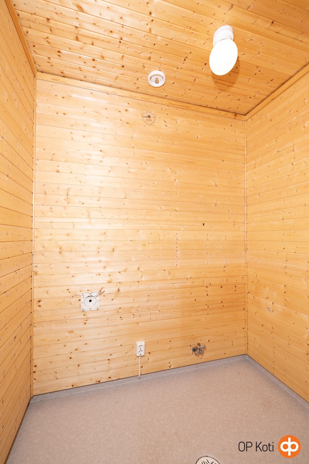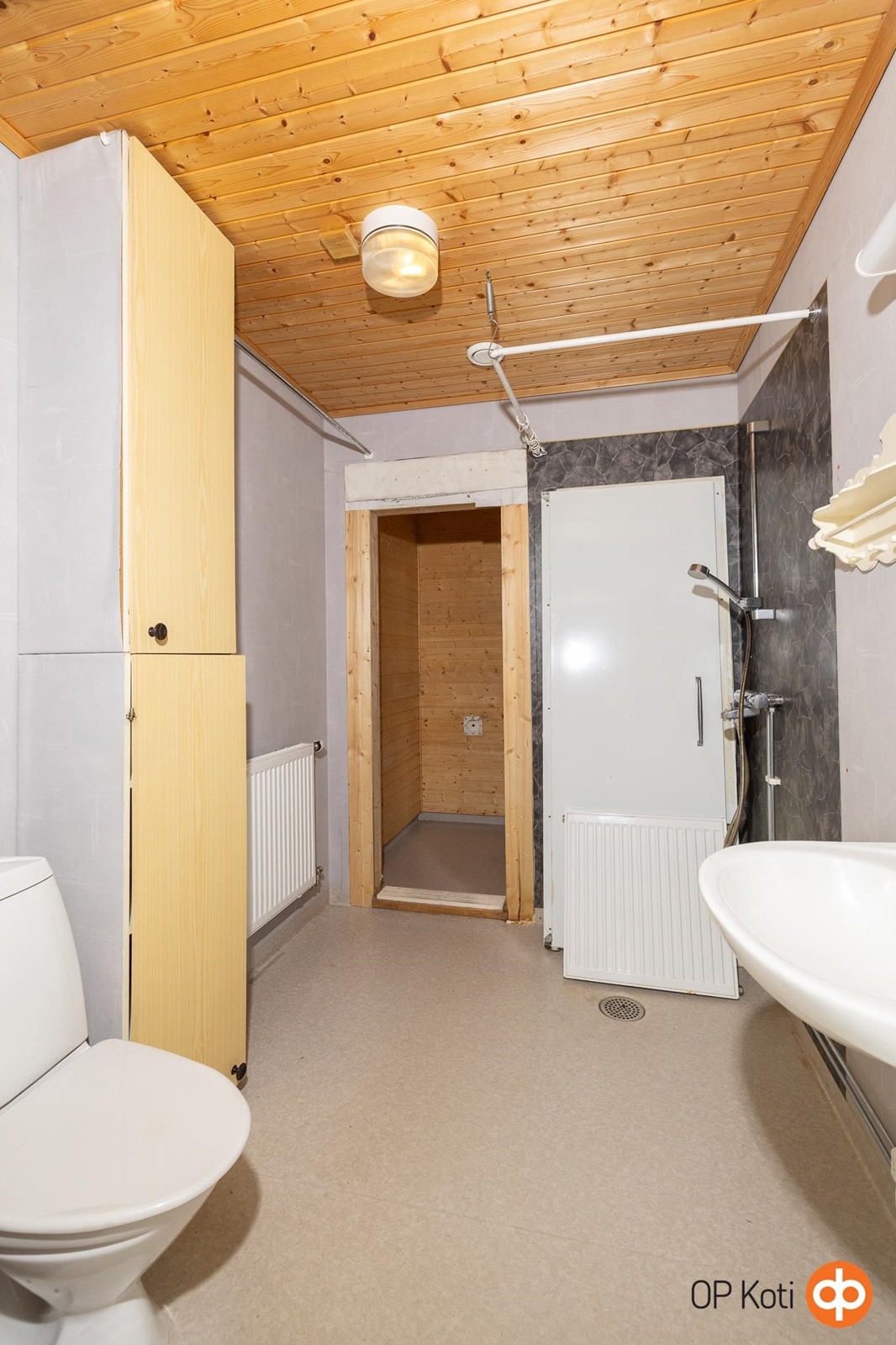 - Kylpyhuone, erillinen wc, suihku, kiinteät valaisimet. Kohteessa saunavalmius, tila toiminut vaatehuoneena. Helppo asentaa kius ja lauteet nykyiseen tilaan.