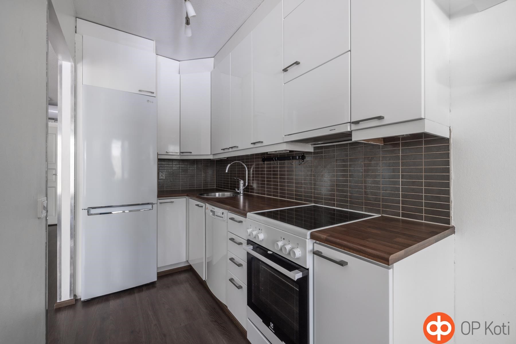 - Jääkaappipakastin, keraaminen liesi, liesituuletin, astianpesukone, kaapistot, kiinteät valaisimet.