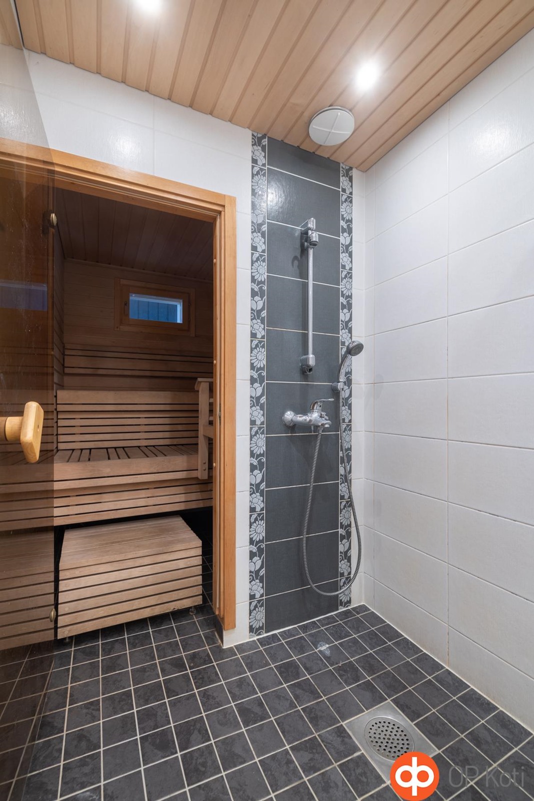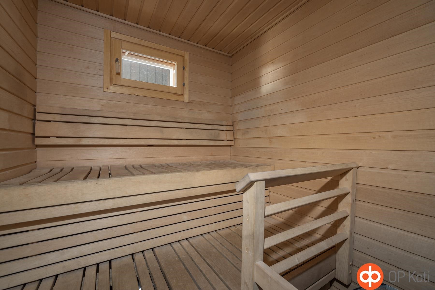 - Sauna, sähkökiuas, kylpyhuone, suihku, peilikaappi, pesukoneliitäntä, lattialämmitys, kiinteät valaisimet.
