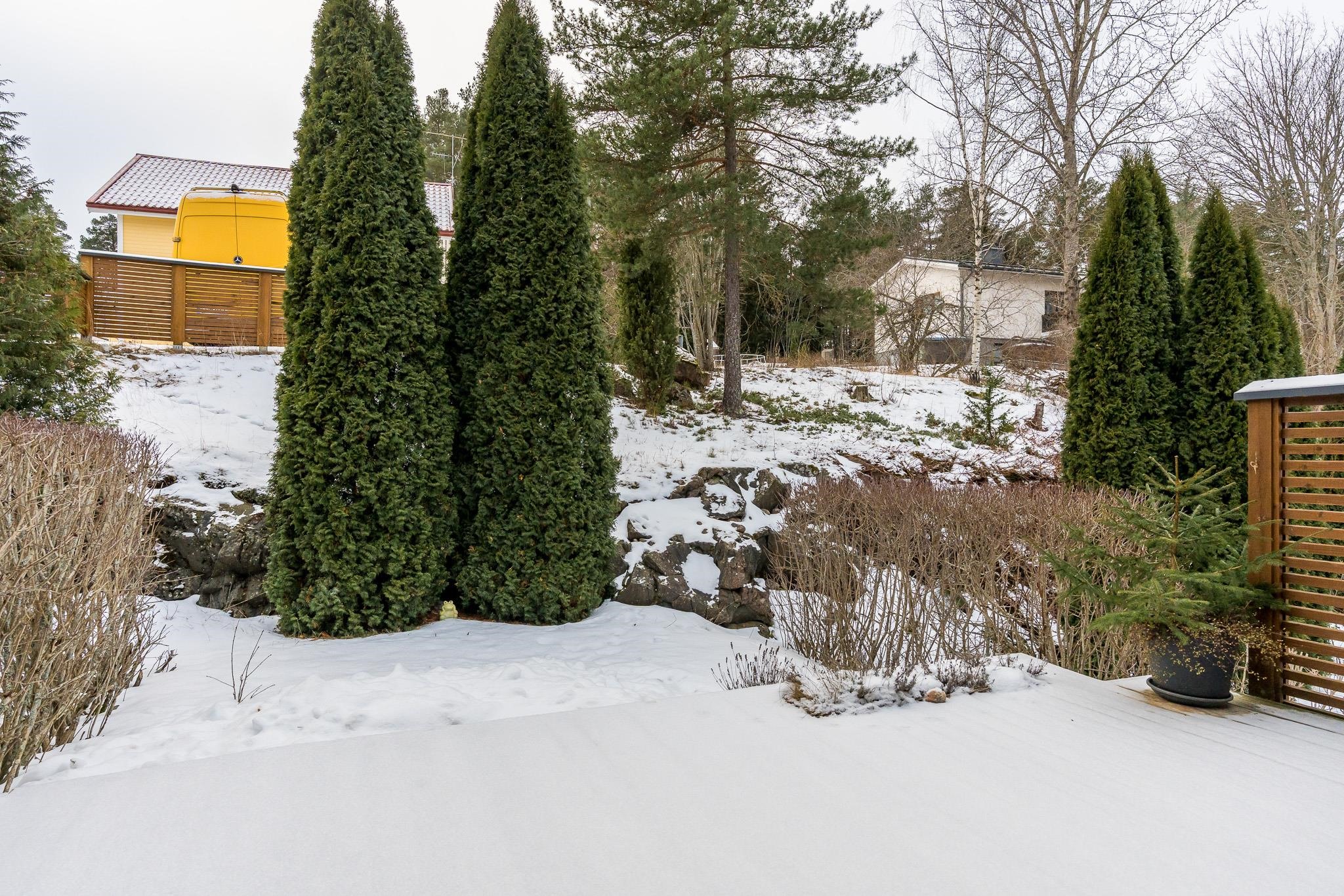- Luonto, piha, taloja, keittiö ja makuuhuoneet koillinen, olohuone lounas.