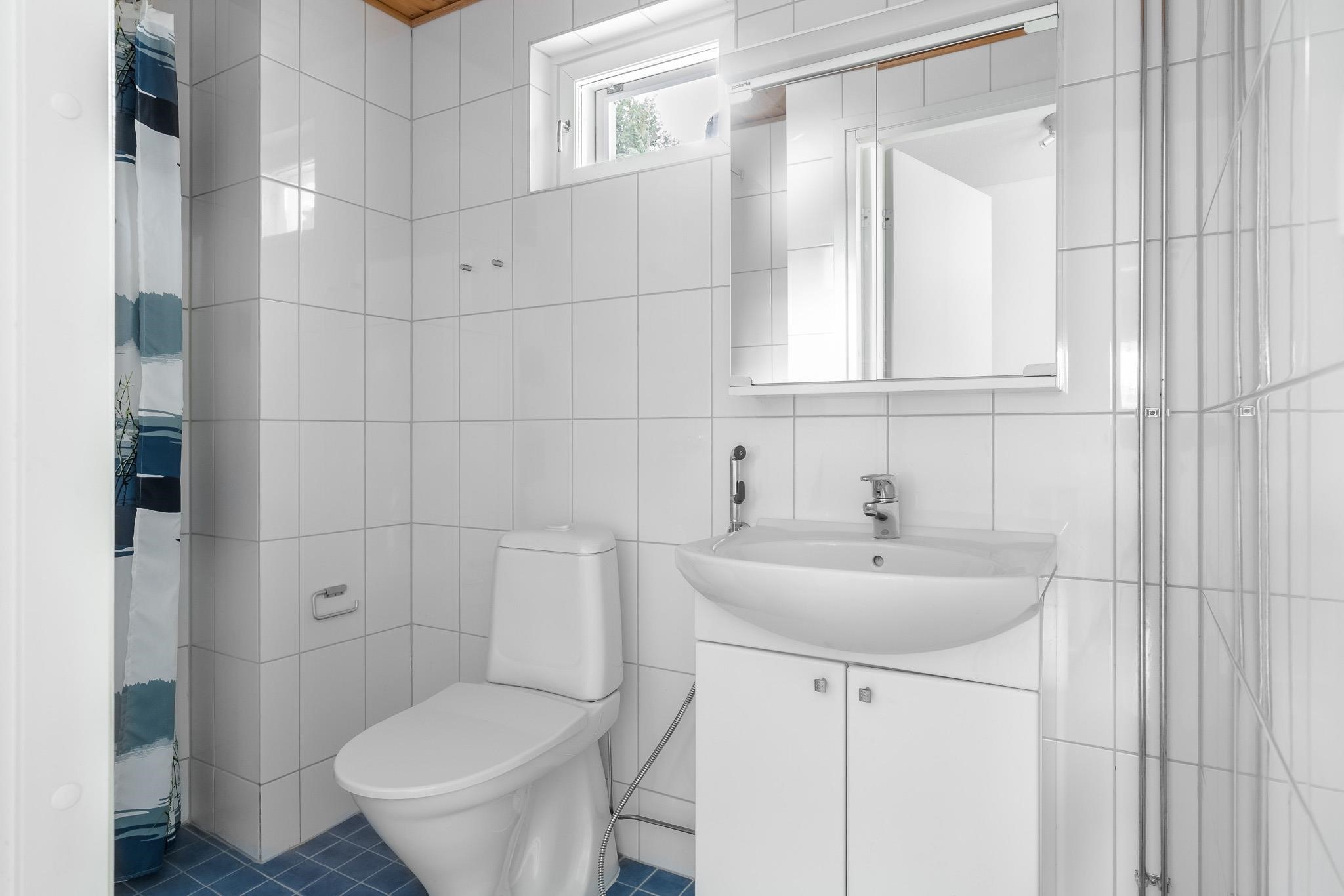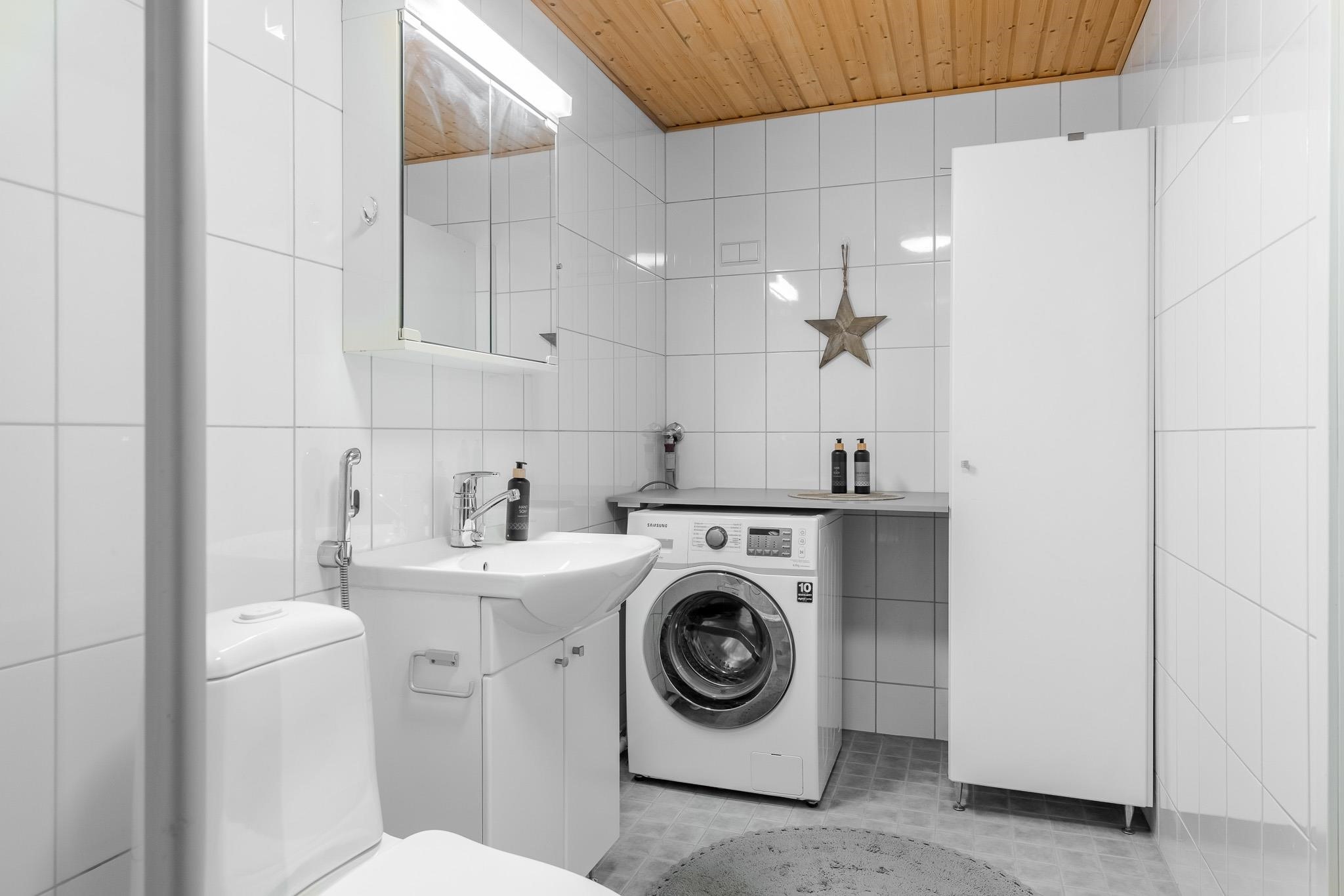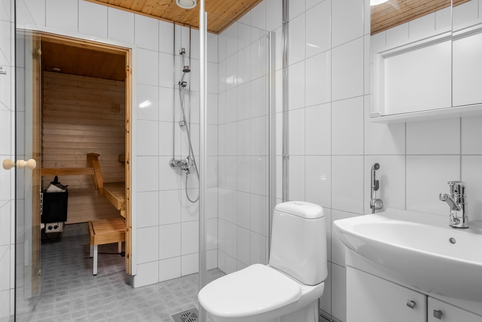 - Sauna, sähkökiuas, kylpyhuone, erillinen wc yläkerta, jossa myös suihkutila, suihku, suihkuseinä, peilit, peilikaappi, kaapit, allaskaappi, pesukoneliitäntä, lattialämmitys Molemmissa sähköinen lattilämmitys, kiinteät valaisimet.