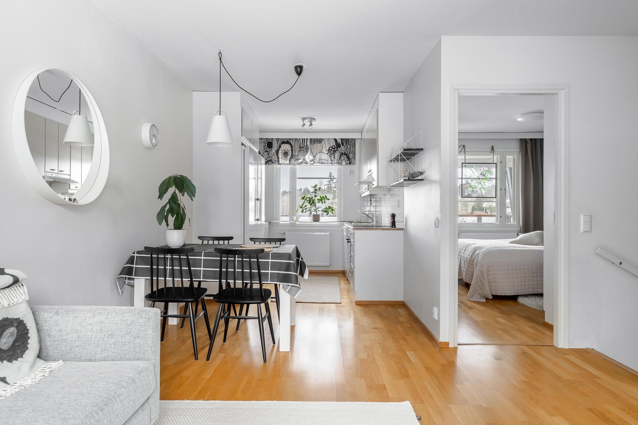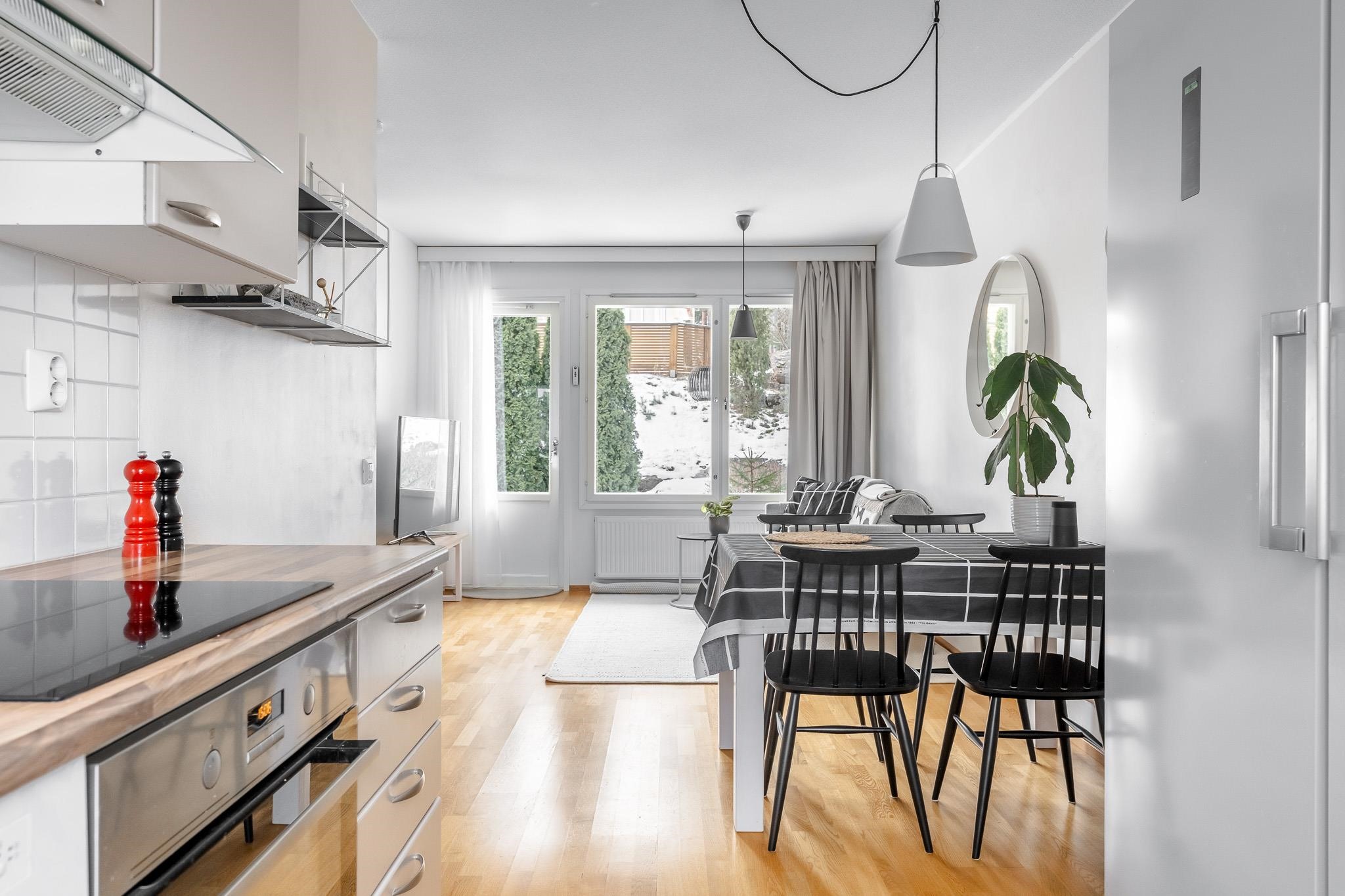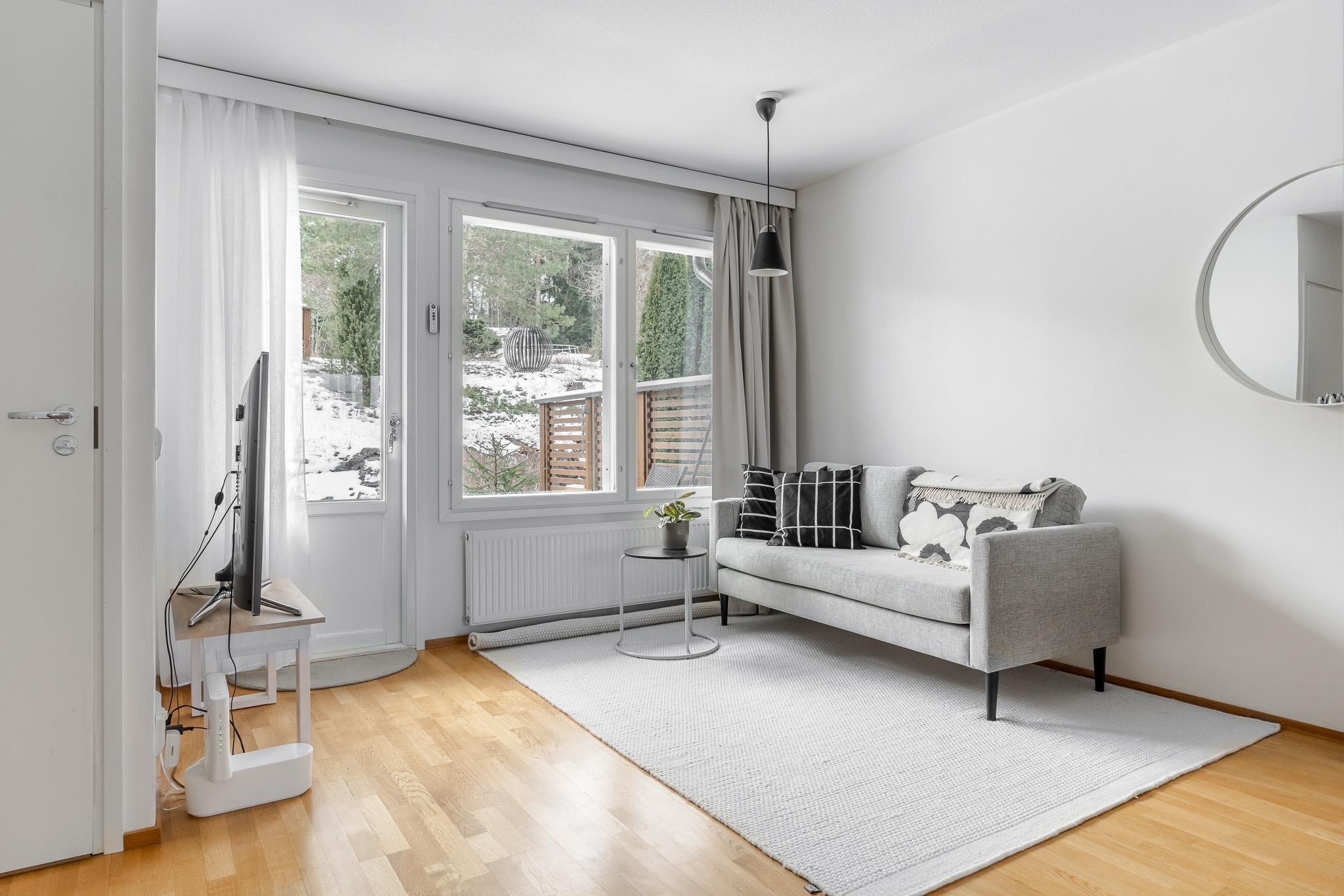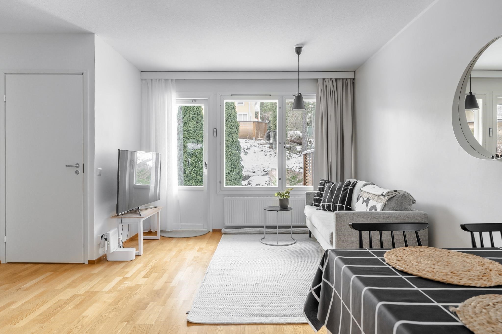 Tilavaan ja siistikuntoiseen kotiin mahtuu kolme huonetta, keittiö ja oma sauna. Olohuoneesta avautuu näkymä omalle terassille ja piha-alueelle, jossa on helppo nauttia vuodenajasta riippumatta. Keittiön toiminnot tukevat arjen sujuvuutta ja kylpyhuone sekä sauna lisäävät asumismukavuutta. Säilytystilaa löytyy vaatehuoneesta ja ulkovarastosta, ja kodissa on käytännölliset puitteet tavaroiden säilytykselle. Autokatospaikka sisältyy.