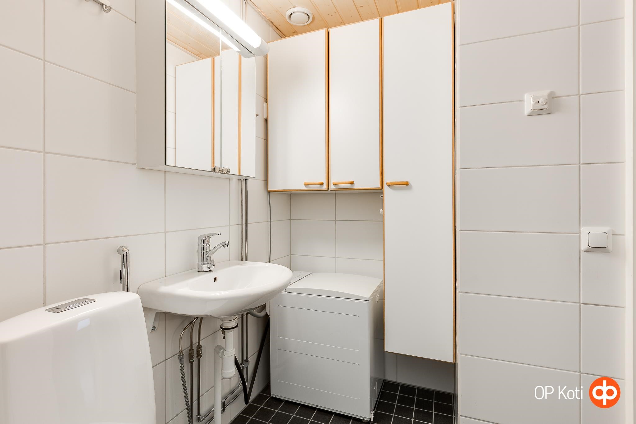 - Kylpyhuone, suihku, peilikaappi, allaskaappi, pesukoneliitäntä, kiinteät valaisimet.