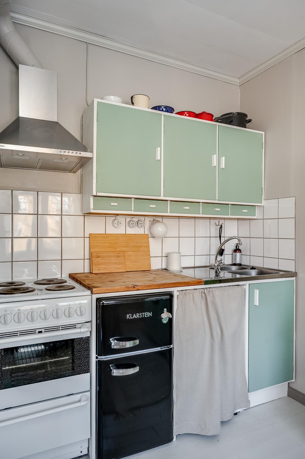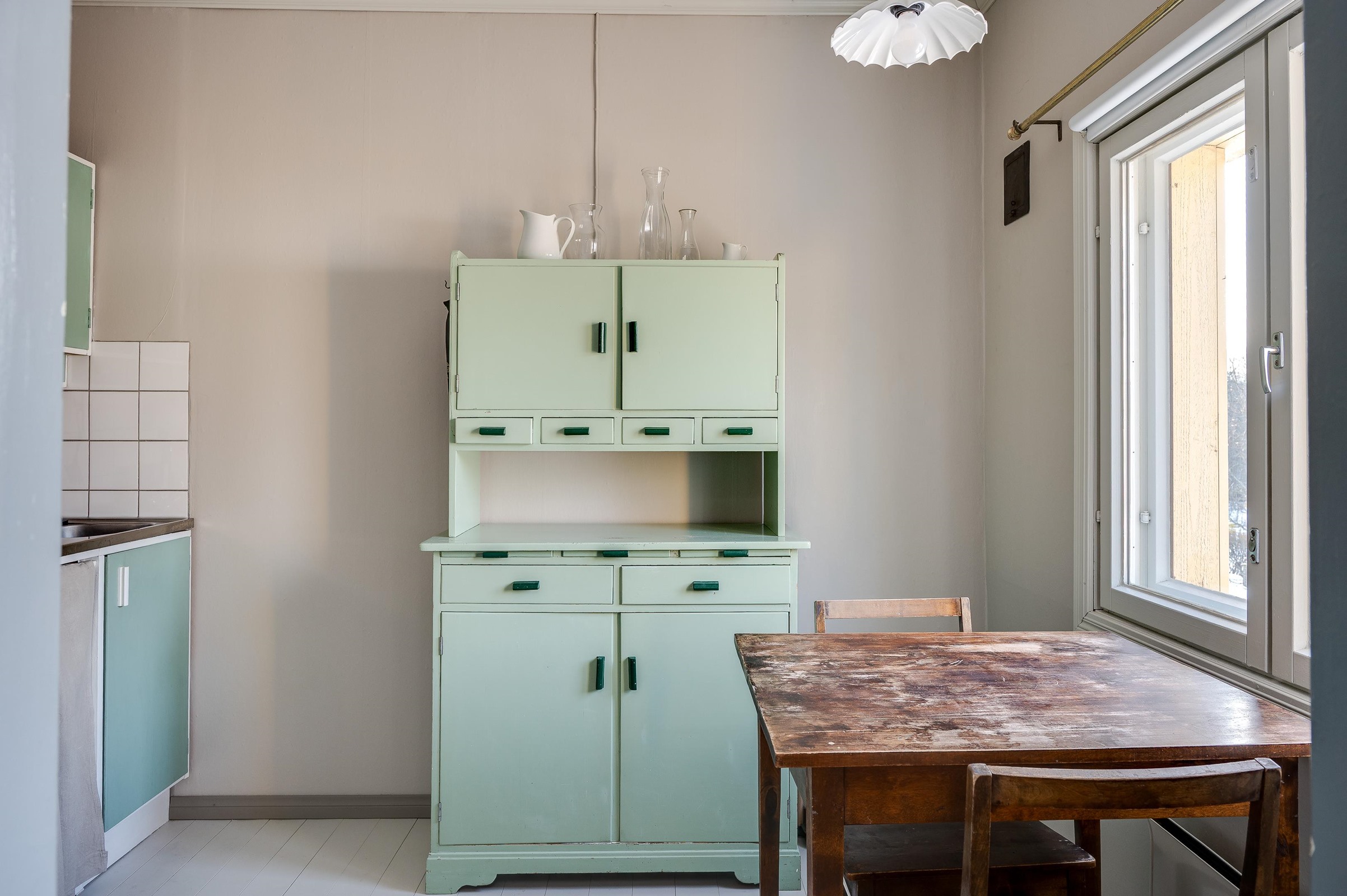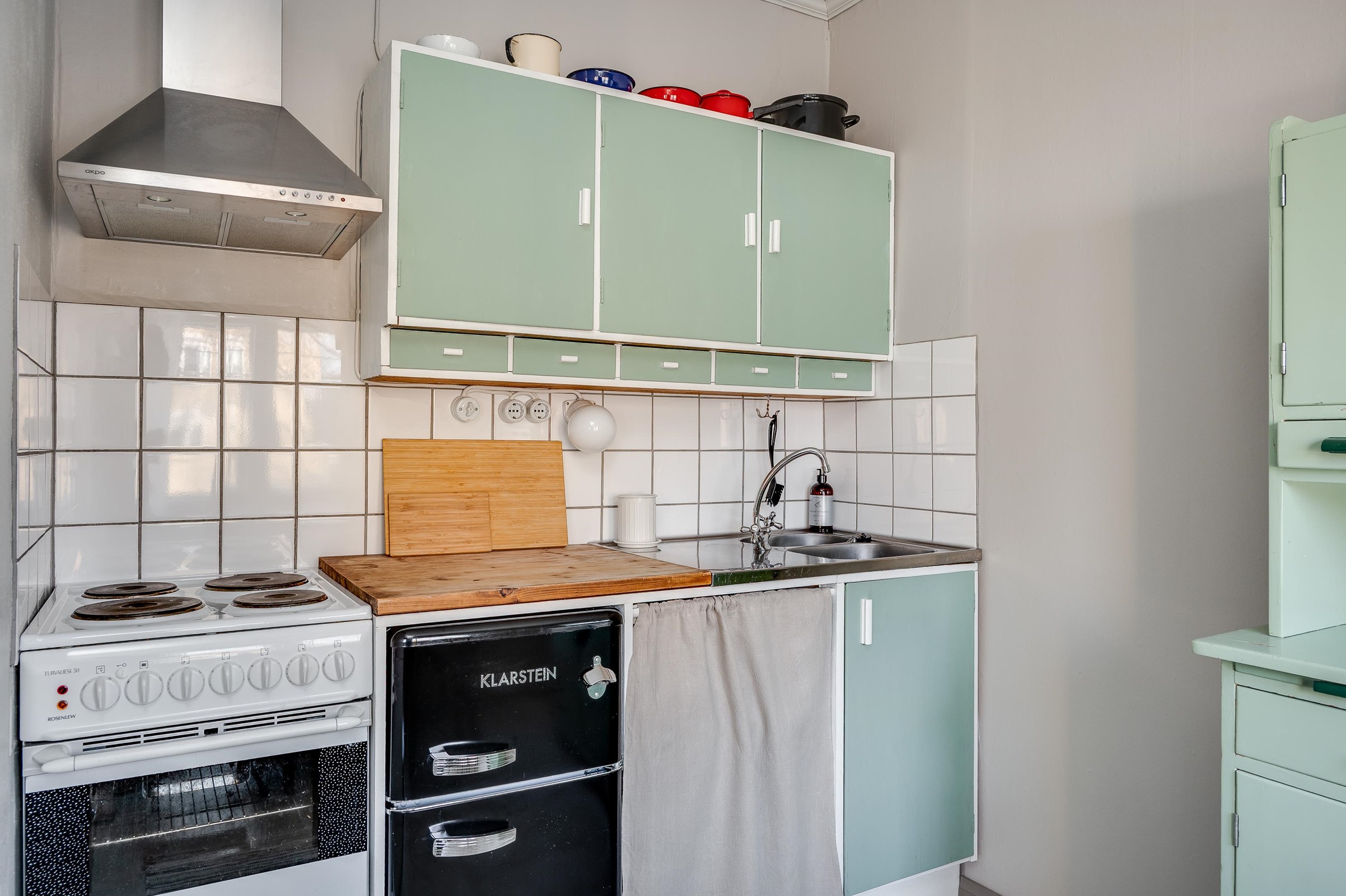 - Asunnon keittiössä on pieni jääkaappi, jonka sisällä on pakastelokero, lattialiesi, liesituuletin sekä mikroaaltouuni. Keittiössä on myös liitännät pyykinkoneelle ja pyykinpesukone kuuluu kauppaan.