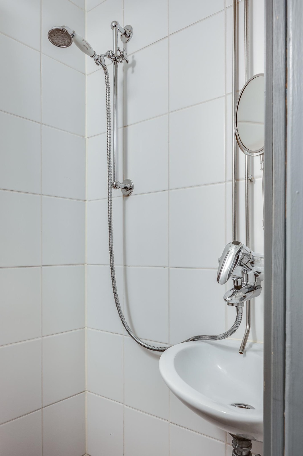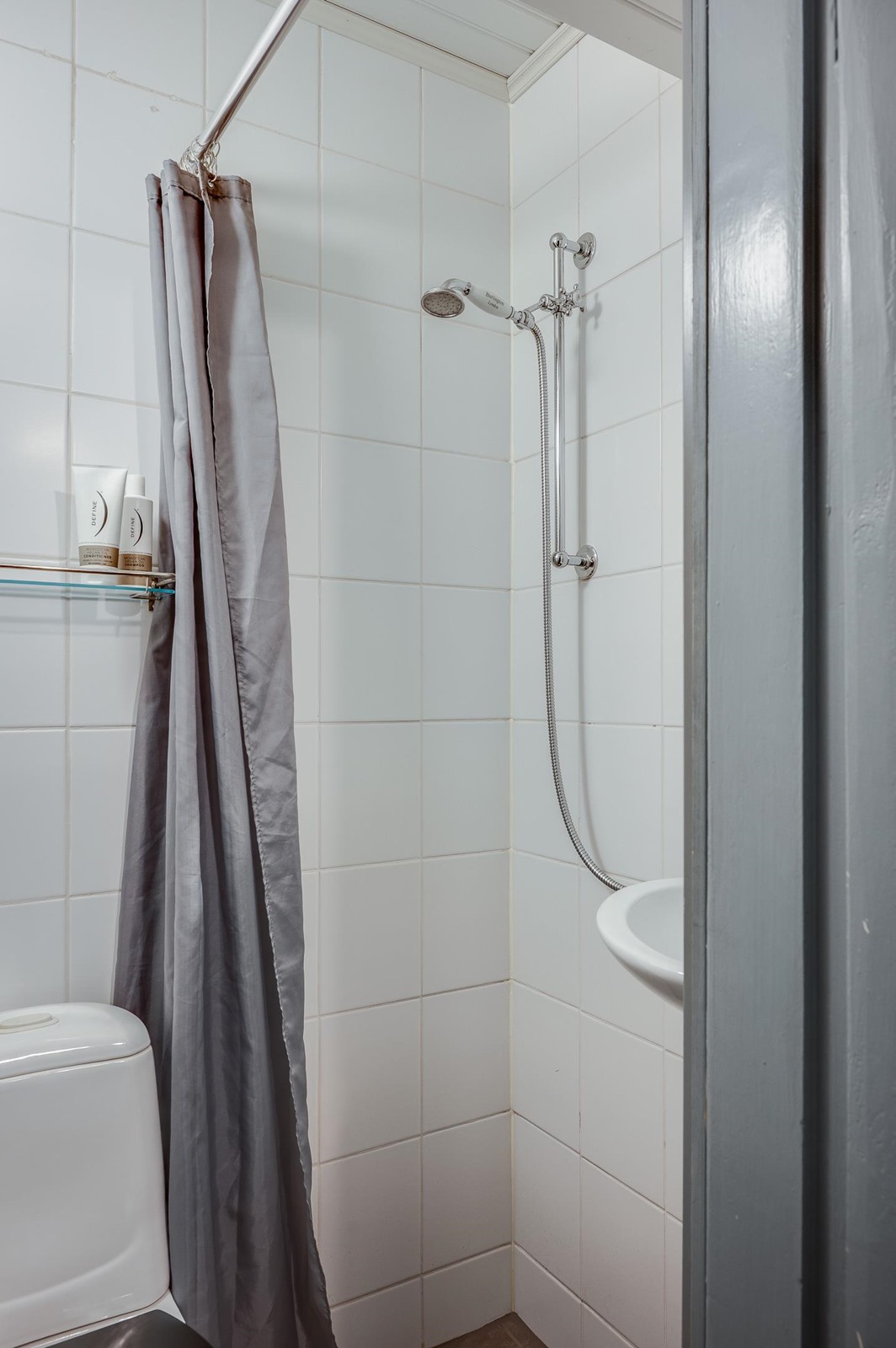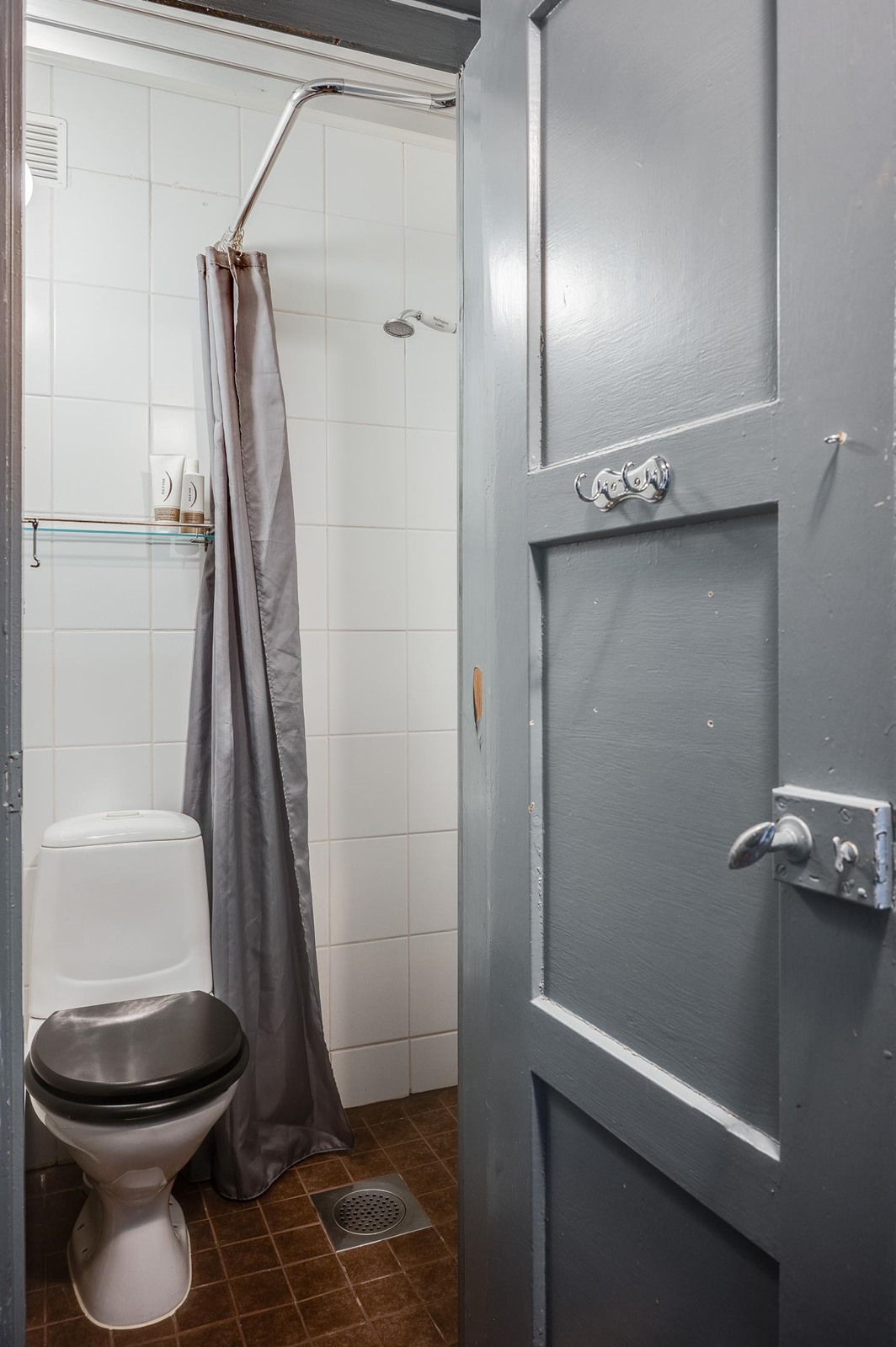 - Kylpyhuoneessa on suihku, peili, käsienpesuallas ja wc-istuin. Tilassa on lattialämmitys.