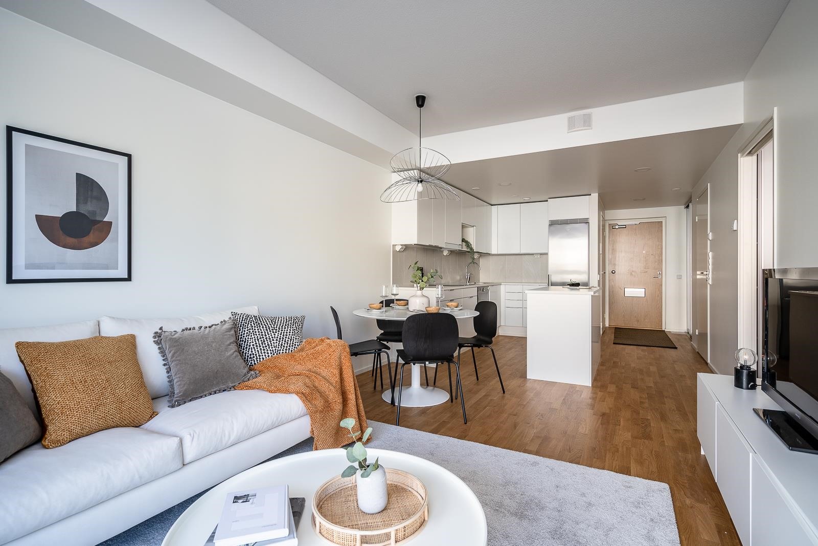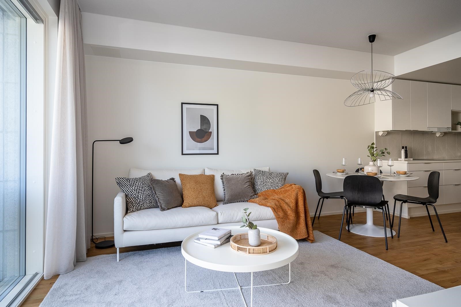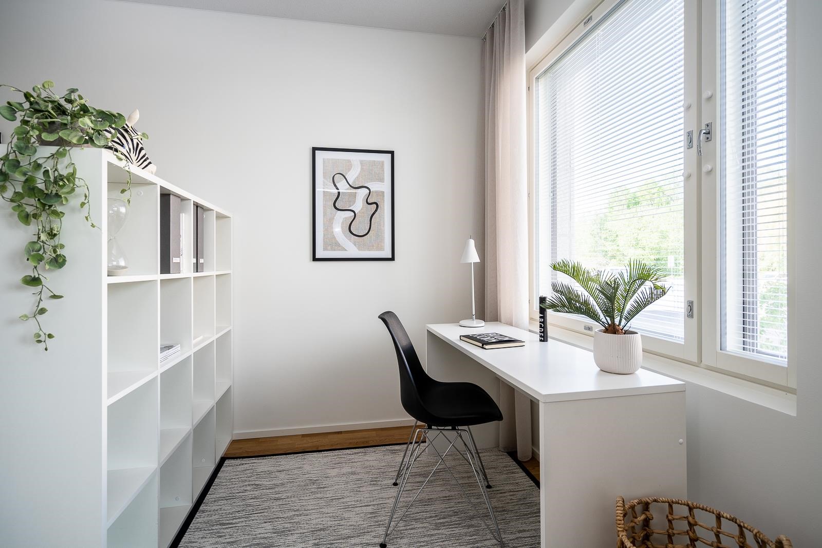 Asunnossa upeat ajattomat ja modernit materiaalivalinnat ja valoisat huoneet. Makuhuuoneessa säiltystilaa kivasti ja eteisessä on myös erillinen vaatehuone. Asunnossa oma sauna, jossa rentoutua pitkän päivän päätteeksi. Lasitetulla parvekkeella sälekaihtimet tuomassa yksityisyyttä. Keittiössä mukavasti lasku- ja kaappitilaa. Keittiö on varusteltu laadukkailla UPO:n kodinkoneilla. Asunto sijaitsee ensimmäisessä kerroksessa, mutta ei aivan maantasalla.