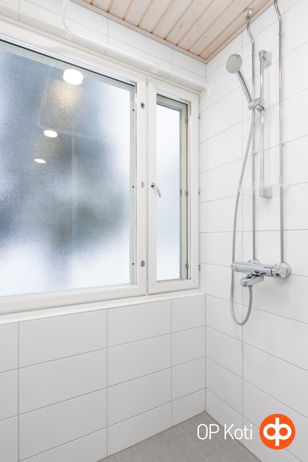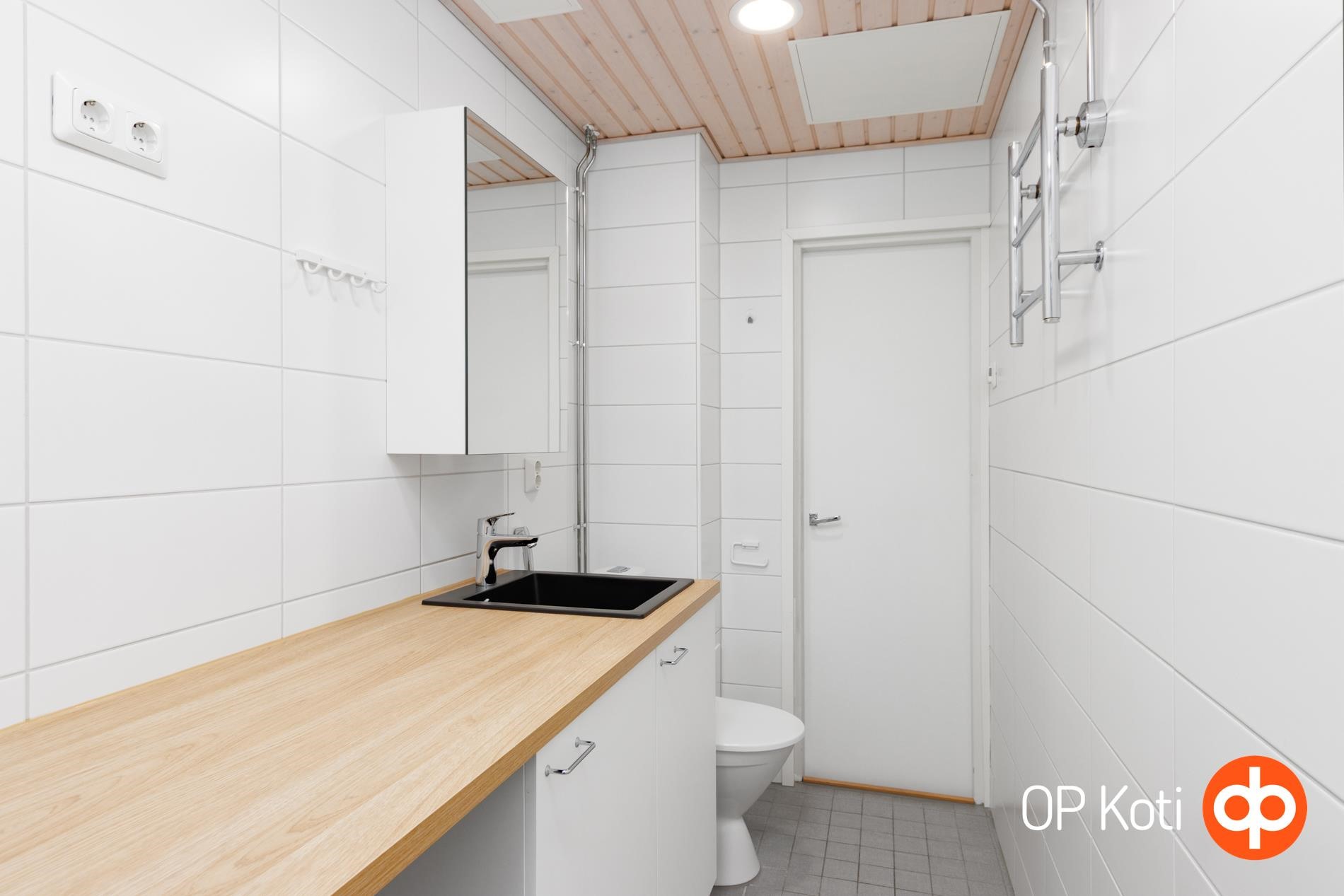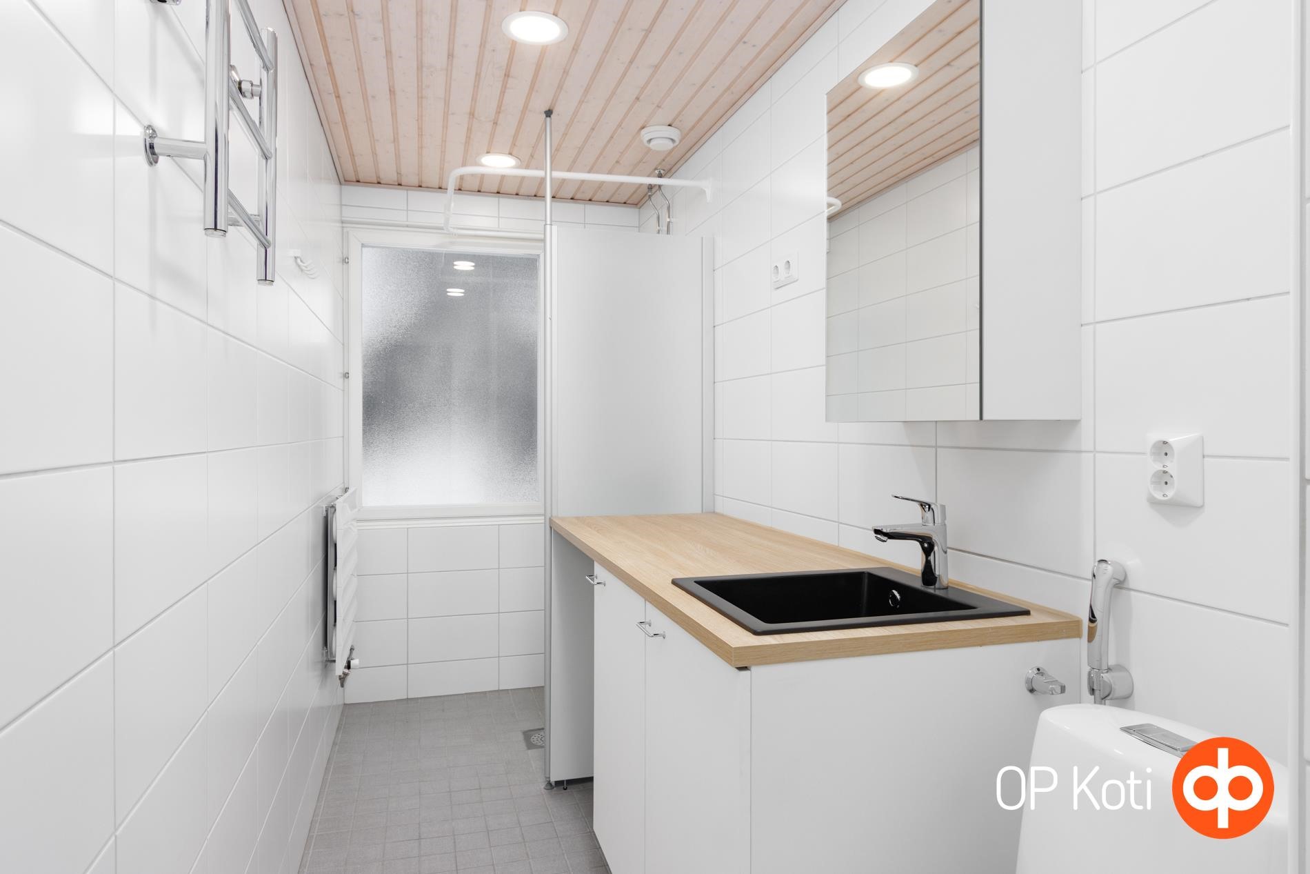- Kylpyhuone, suihku, suihkuseinä, peilikaappi, allaskaappi, pesukoneliitäntä, lattialämmitys, kiinteät valaisimet.