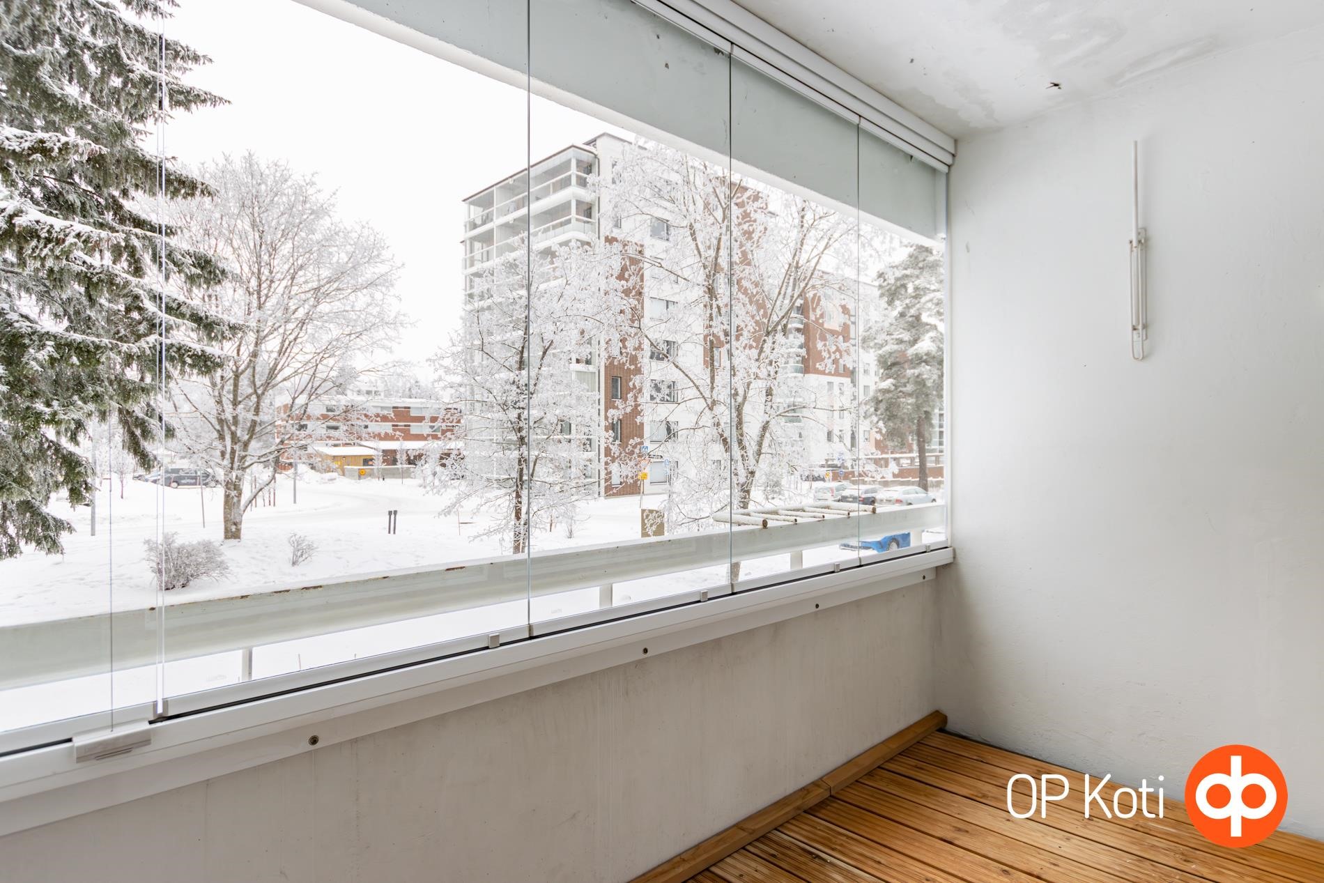 Asunto sijaitsee ensimmäisessä kerroksessa, kuitenkin selkeästi katutason yläpuolella. Lasitettu parveke tuo lisätilaa ja mahdollistaa parvekkeesta nauttimisen ympäri vuoden.