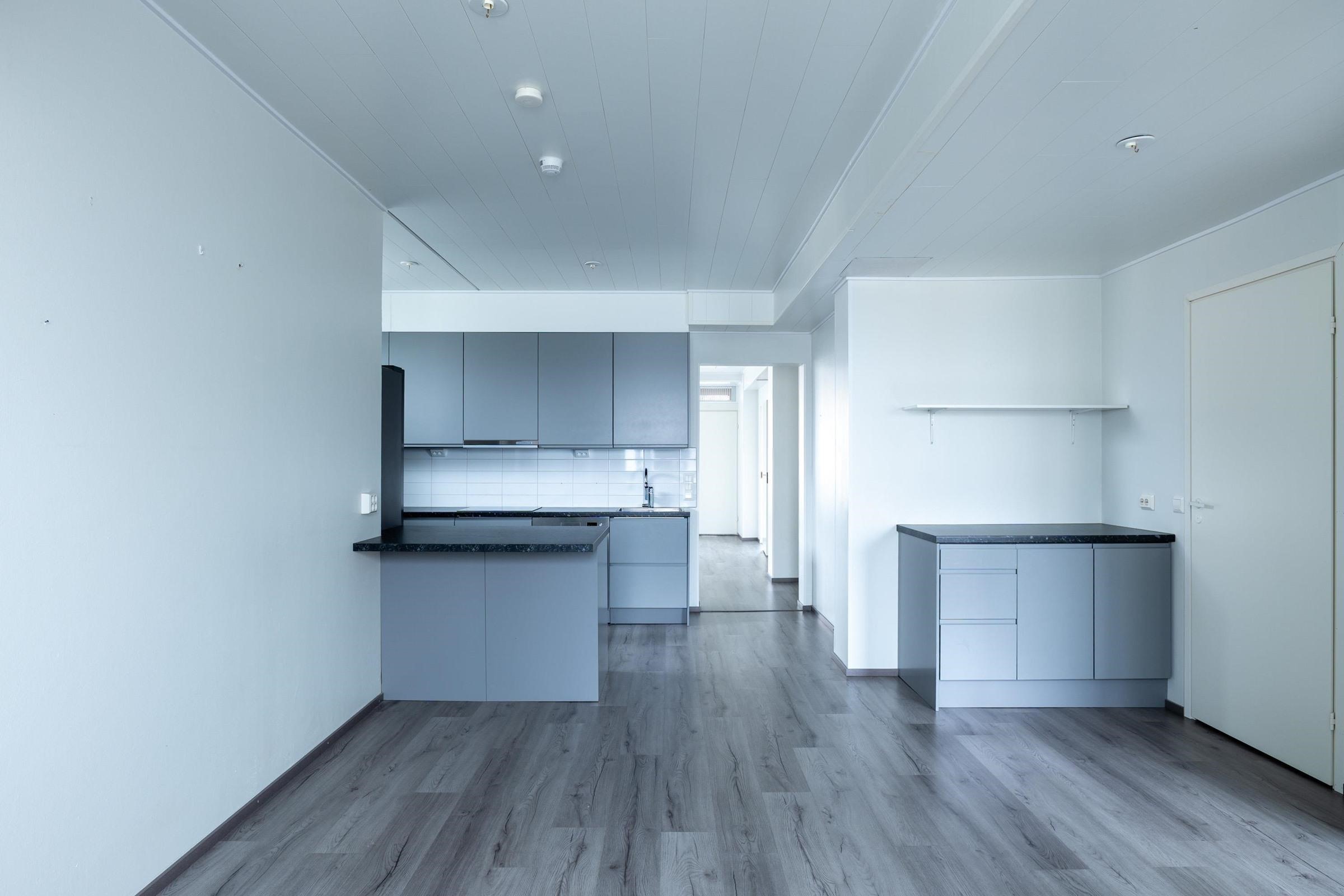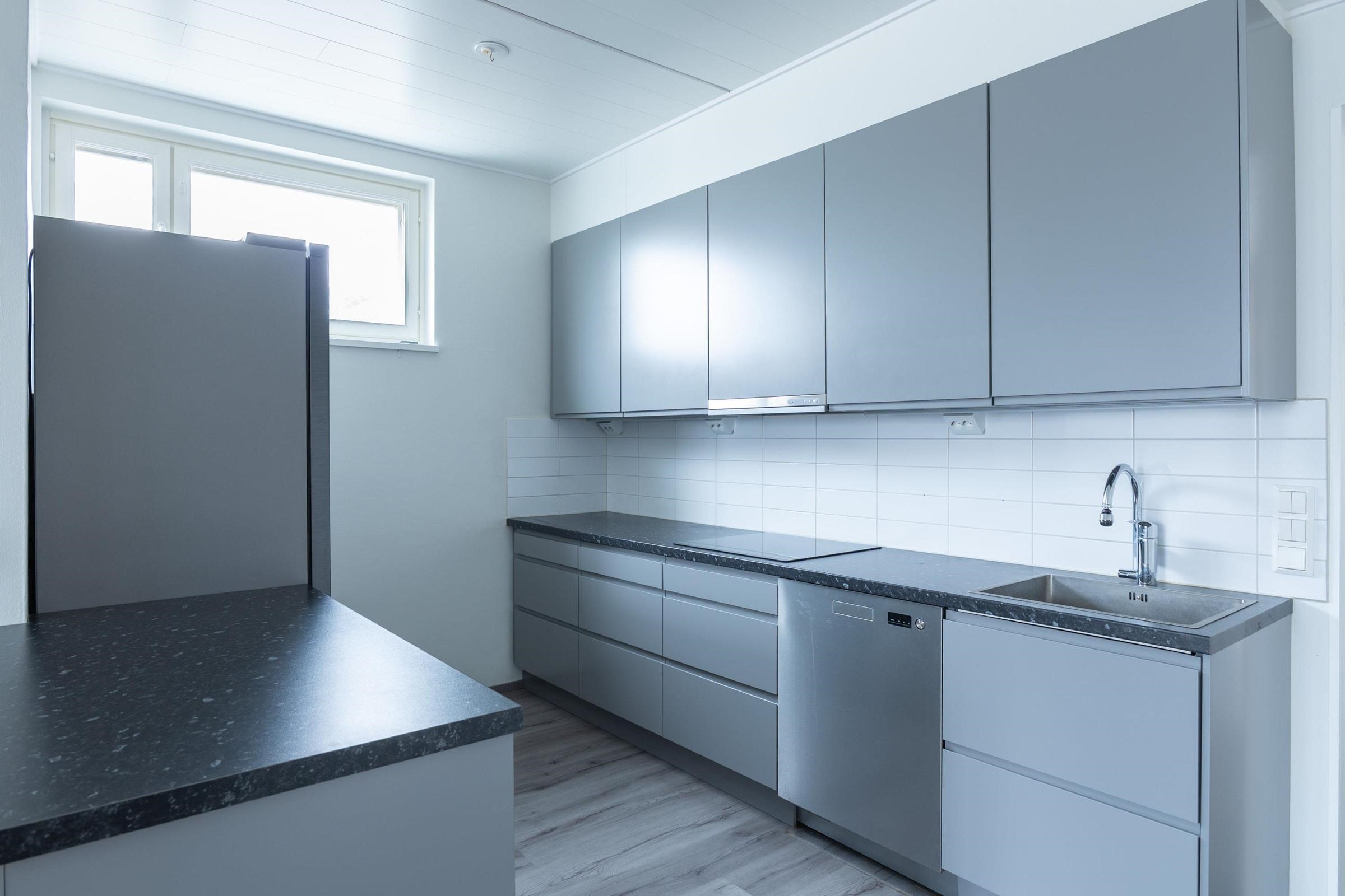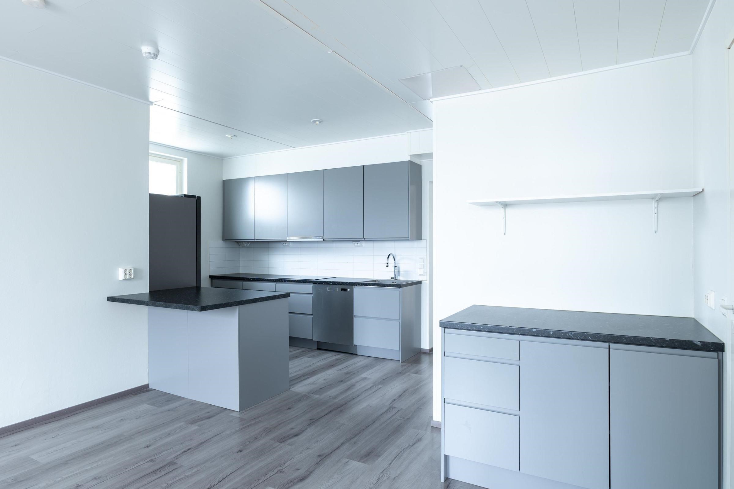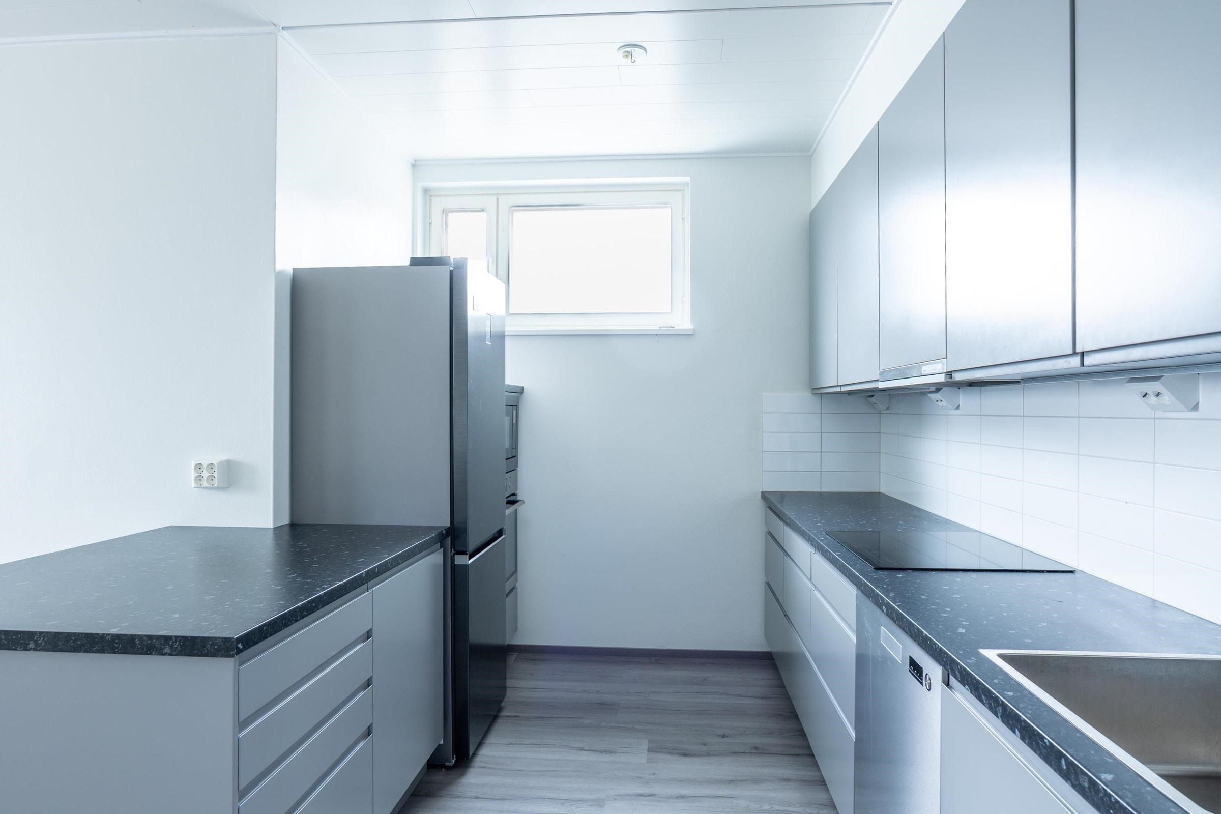 Koko asunto on remontoitu laadukkaasti vuonna 2022, ja uudistus näkyy kauttaaltaan. Moderni ja kauniisti remontoitu keittiö on viihtyisä paikka ruoanlaittoon. Tyylikkäät materiaalit ja toimivat ratkaisut tekevät arjen askareista sujuvia, ja ruokailutilaan sopii mukavasti isompikin pöytäryhmä.
