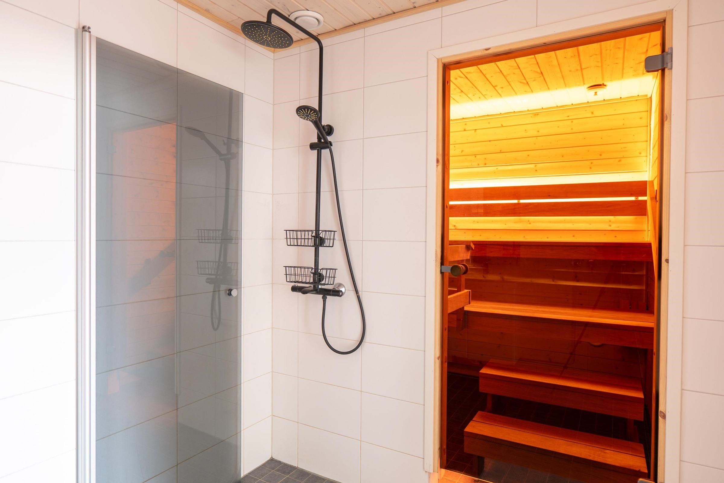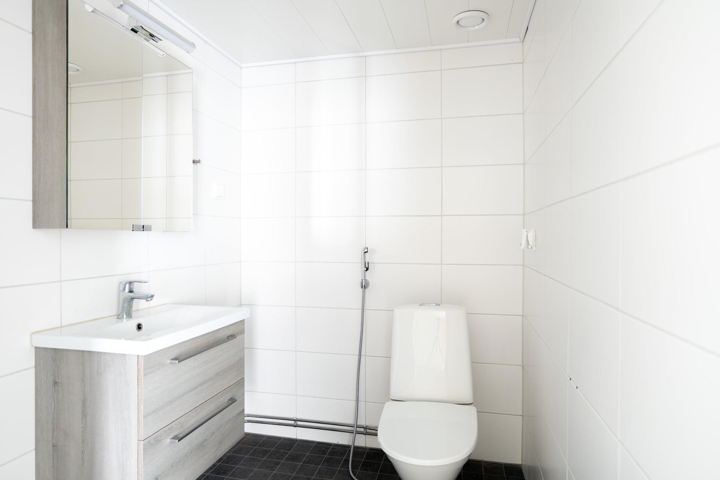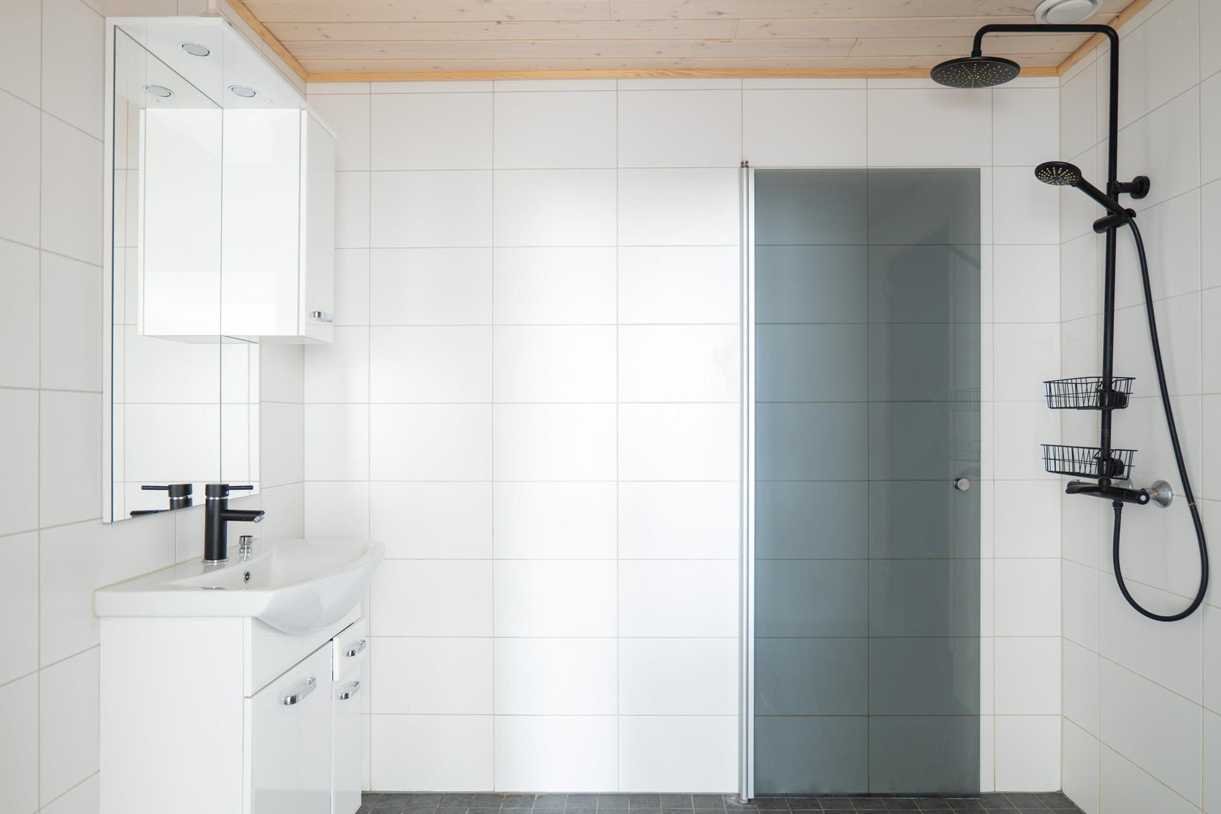 - Sauna, sähkökiuas, kylpyhuone, erillinen wc, suihku, peilit, peilikaappi, allaskaappi, pesukoneliitäntä, lattialämmitys, kiinteät valaisimet.