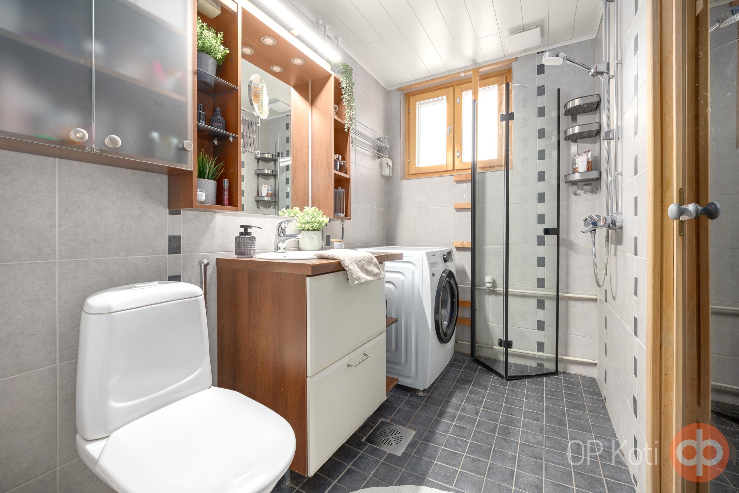 - Sauna, sähkökiuas, suihku, suihkuseinä, peilit, peilikaappi, allaskaappi, pesukoneliitäntä, lattialämmitys, kiinteät valaisimet.