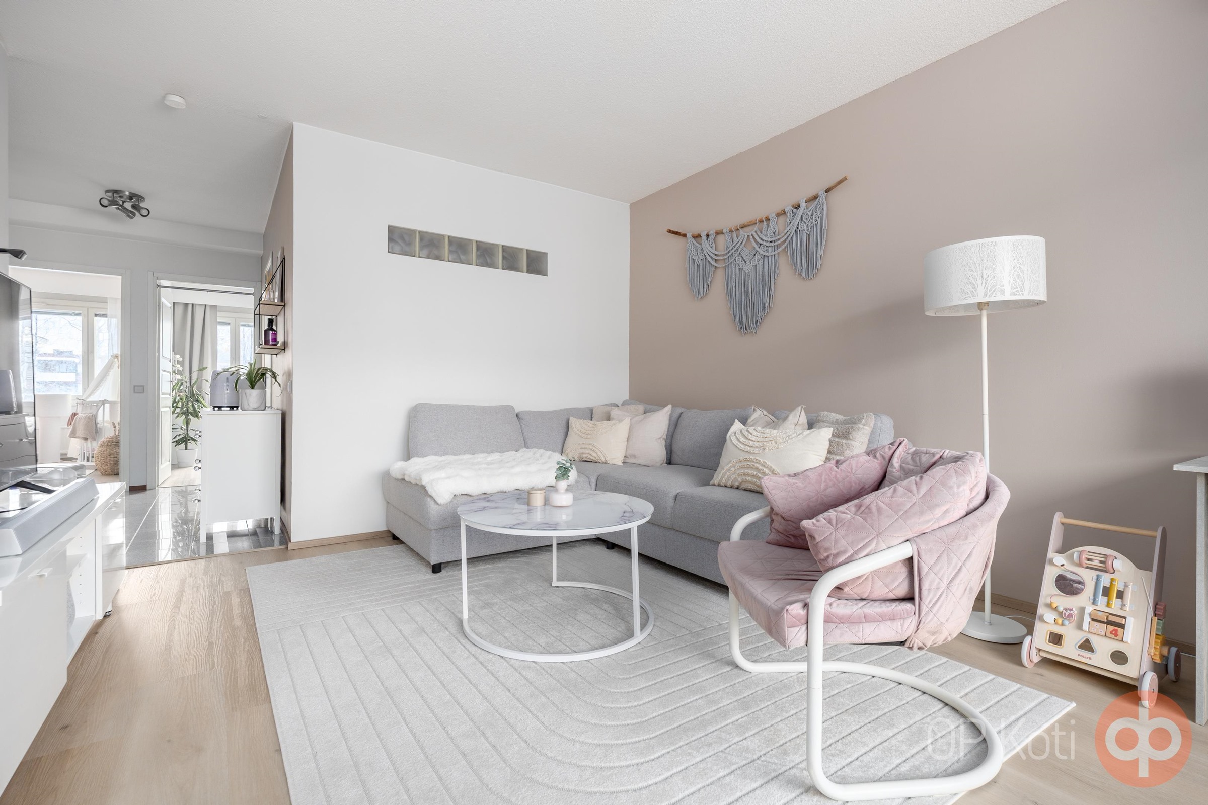 Pohjaratkaisu on selkeä ja käytännöllinen. Eteisessä sijaitseva vaatehuone tarjoaa erinomaista säilytystilaa, ja kaksi makuuhuonetta palvelevat hyvin niin perheen kuin etätyönkin tarpeita. Lasitettu parveke ja oma sauna tuovat asumiseen ripauksen arjen luksusta.