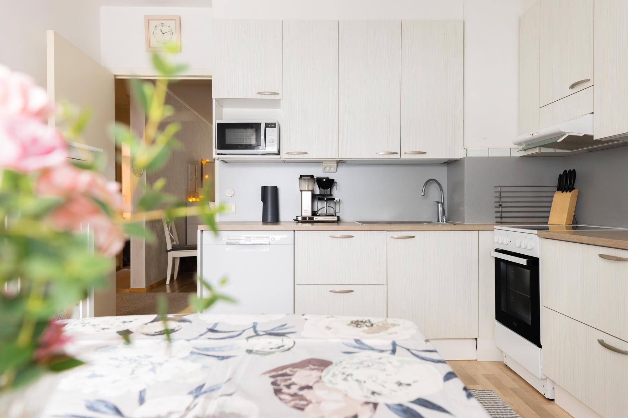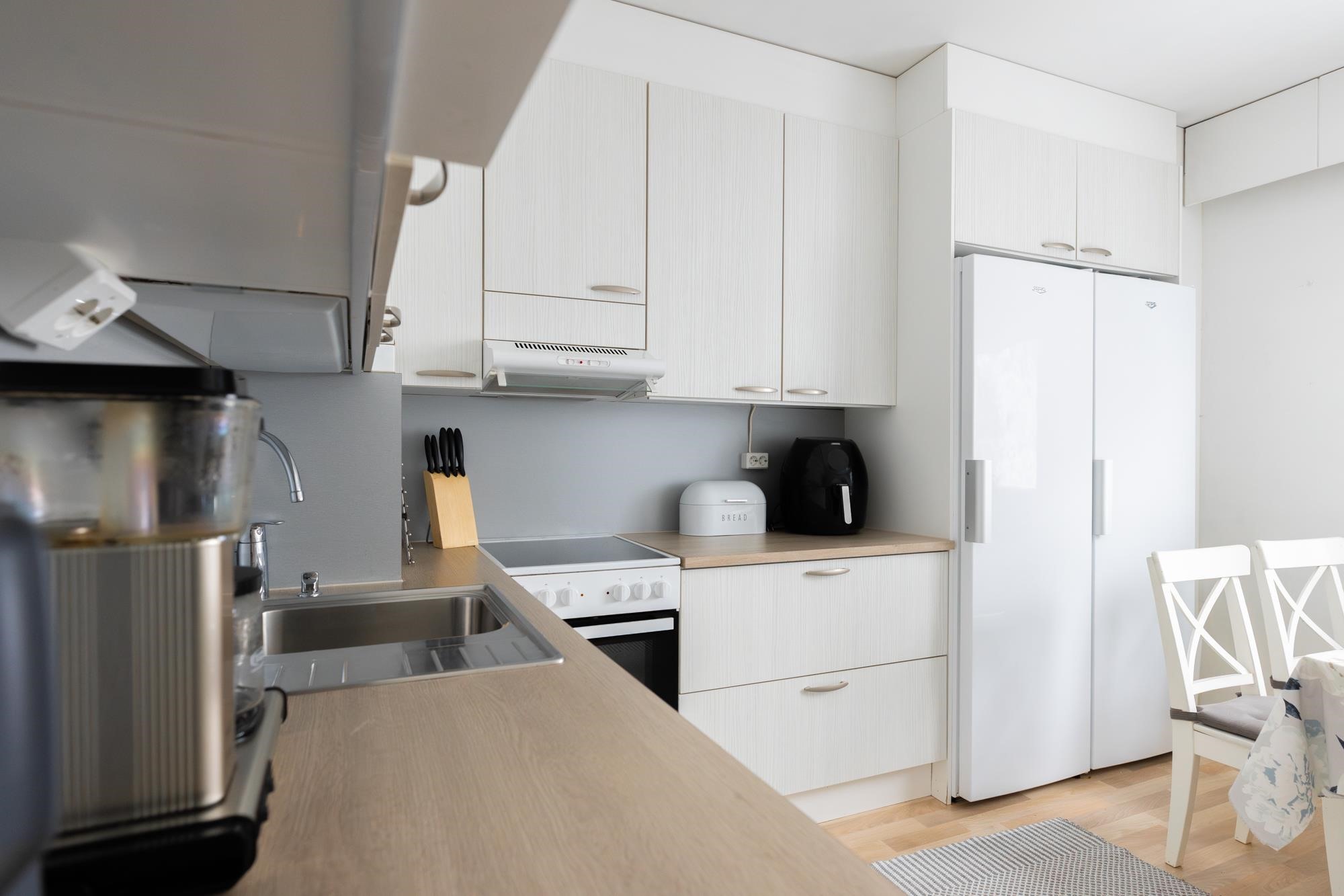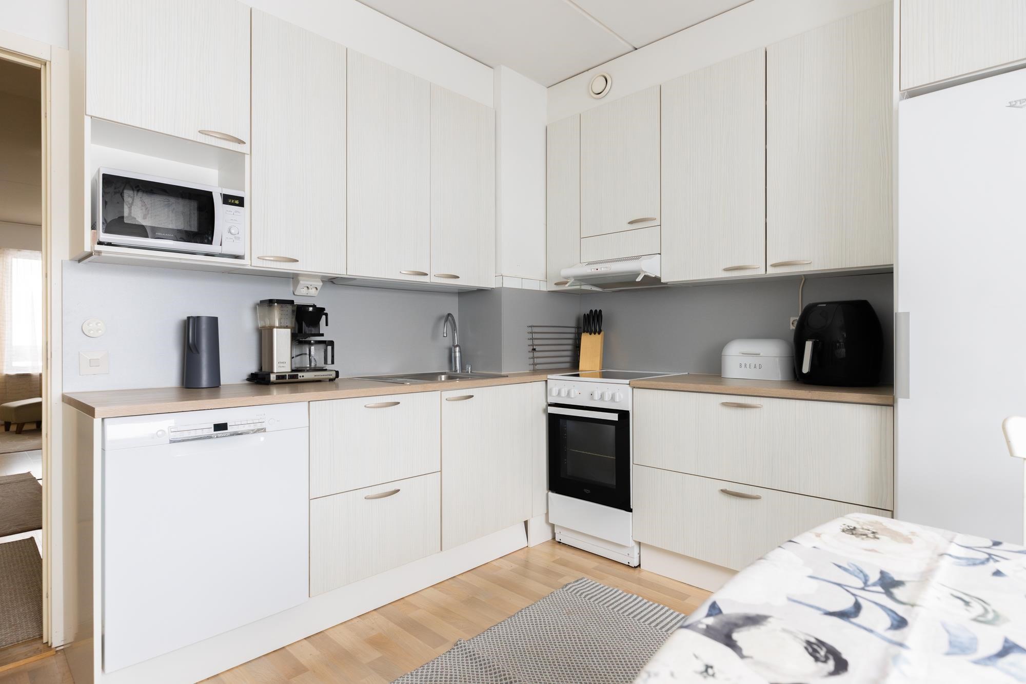 - Jääkaappi, pakastekaappi, keraaminen liesi, liesituuletin, mikroaaltouuni, astianpesukone, kaapistot, kiinteät valaisimet.