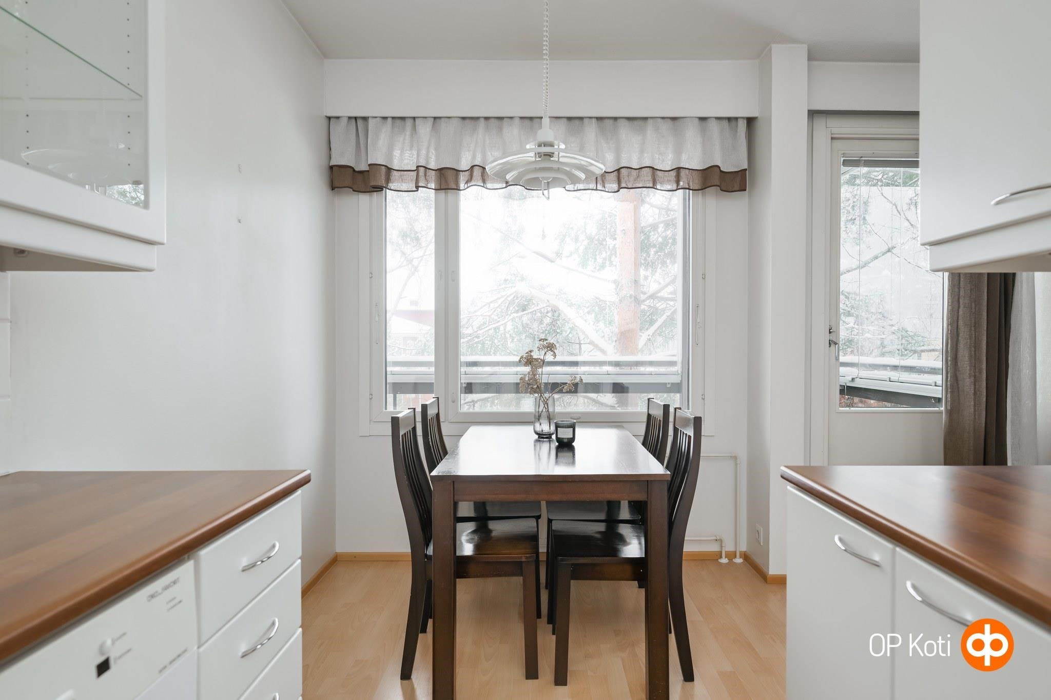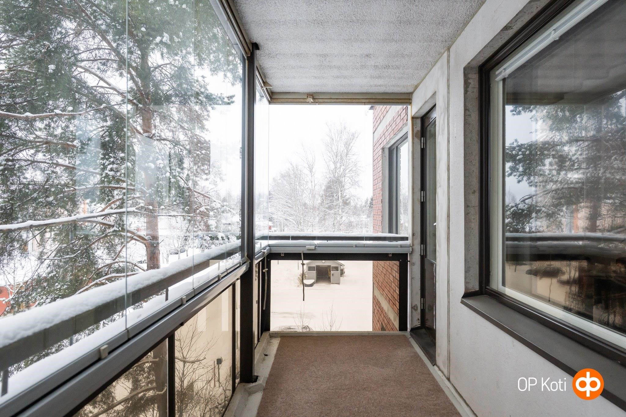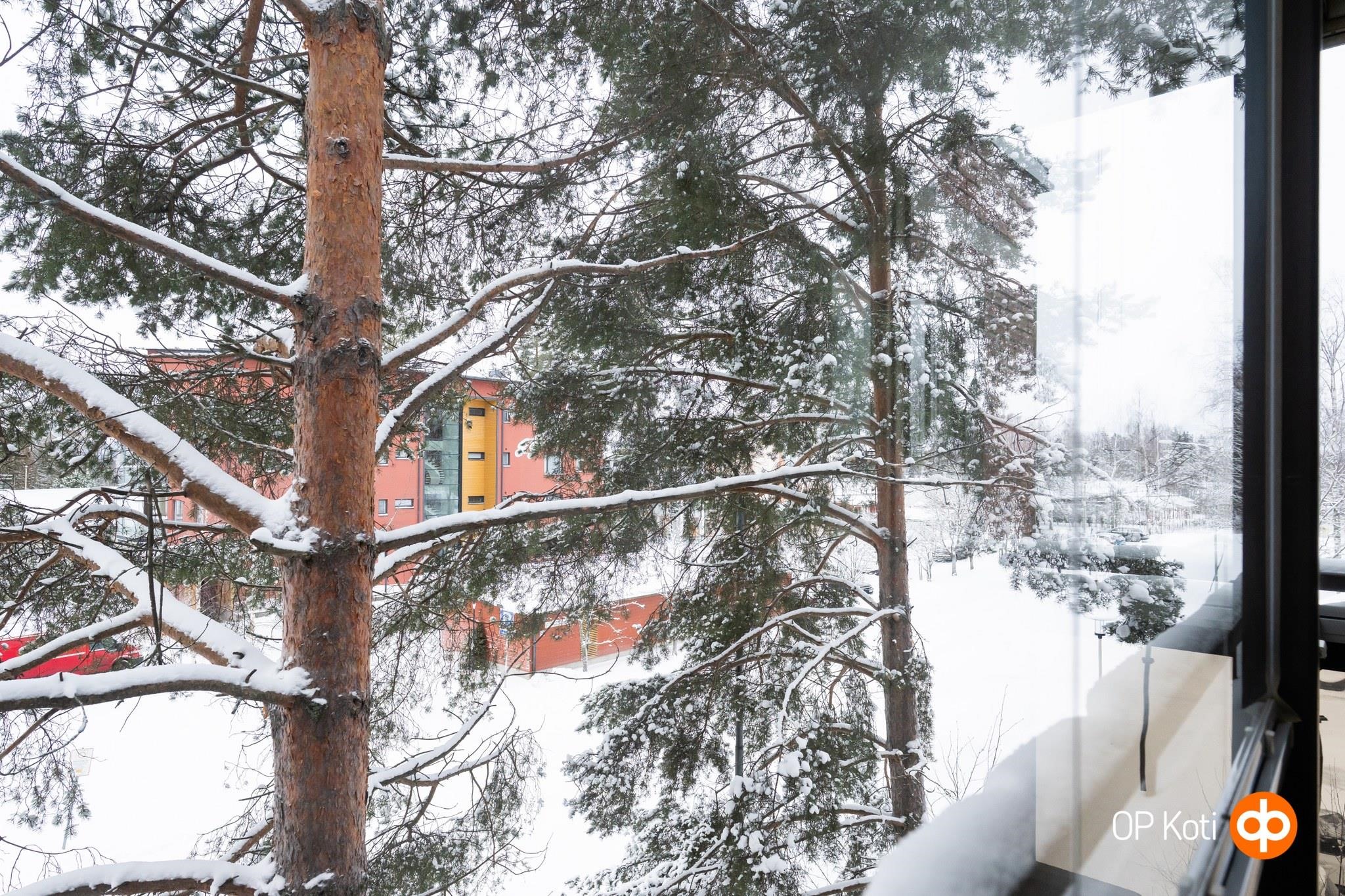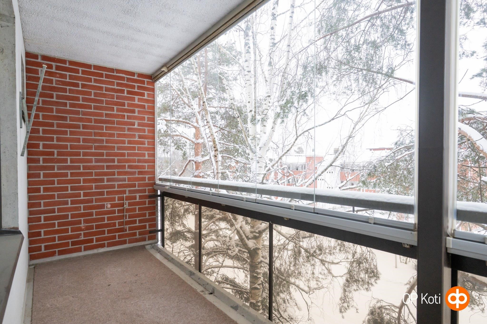 Tässä on heti vapaa kulmahuoneisto, jossa vain yhdellä seinällä on naapurit. Koti sijaitsee kolmannessa kerroksessa, hissittömässä talossa, mutta näkymät asunnosta ja lasitetulta parvekkeelta ovat sangen viihtyisät ja suojaisat. Koivut ja männyt suojaavat kivasti kesän paahteilta, kun leveä parveke on lounaaseen. Asunnon ikkunat ovat kolmeen suuntaan, tehden asunnosta entistä avaramman oloisen.