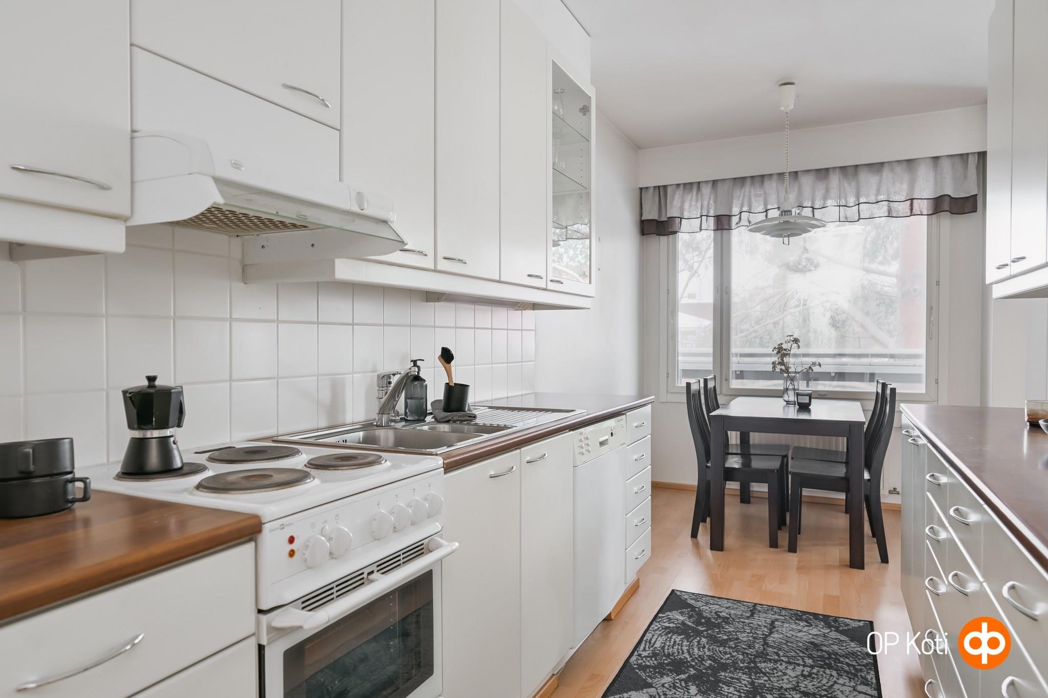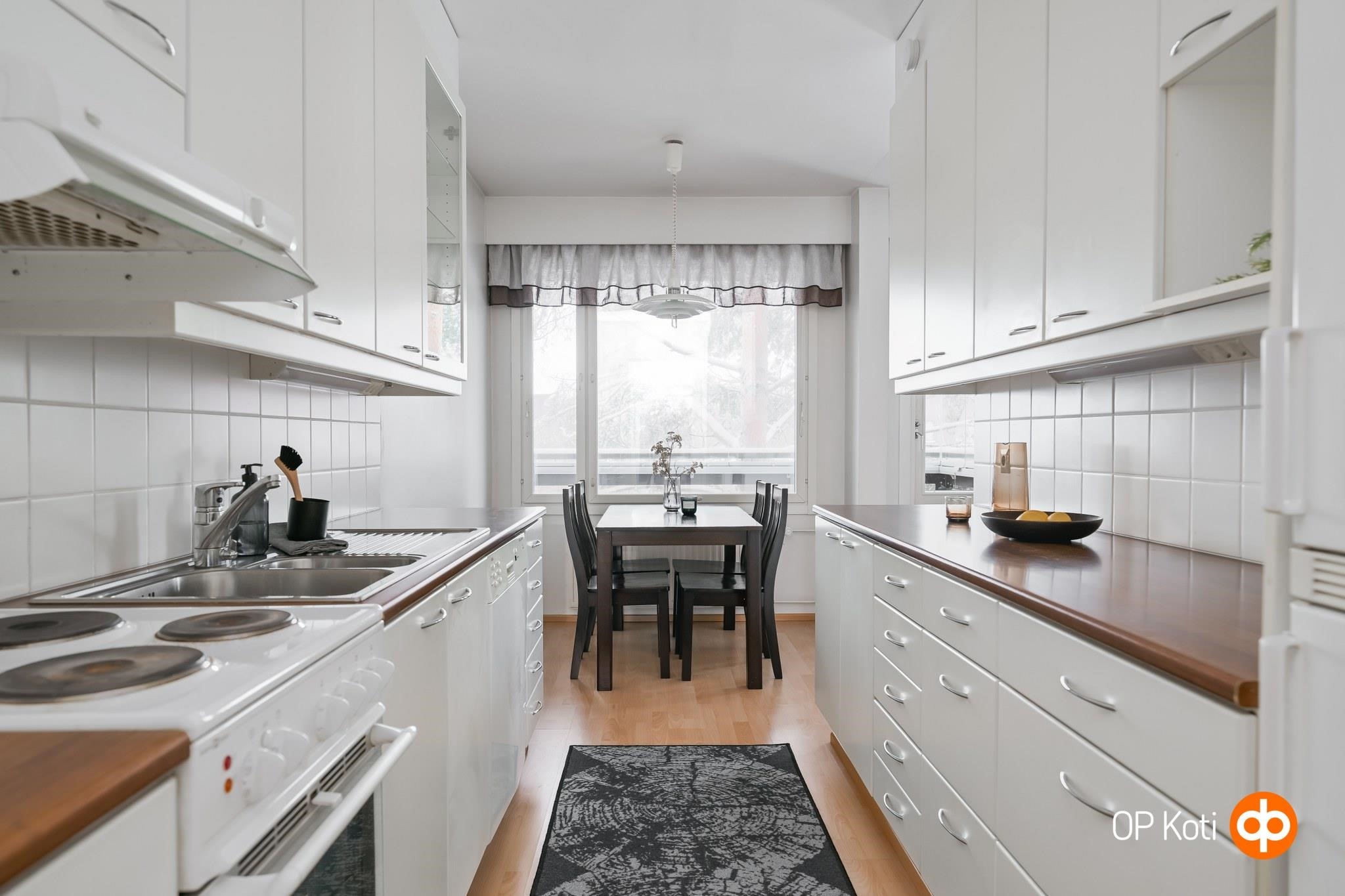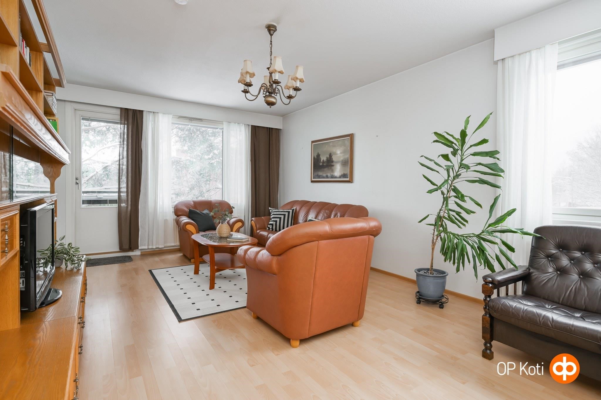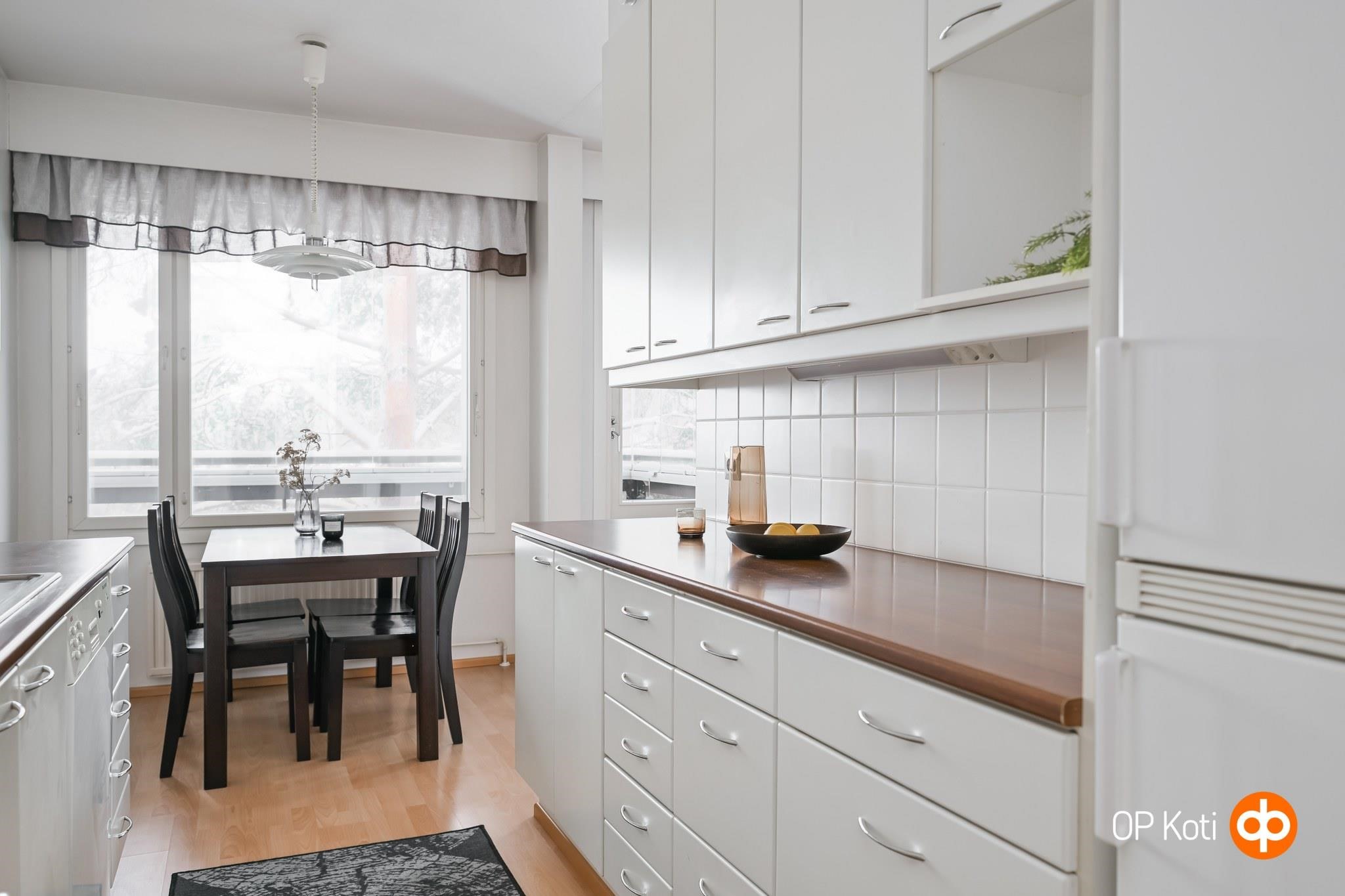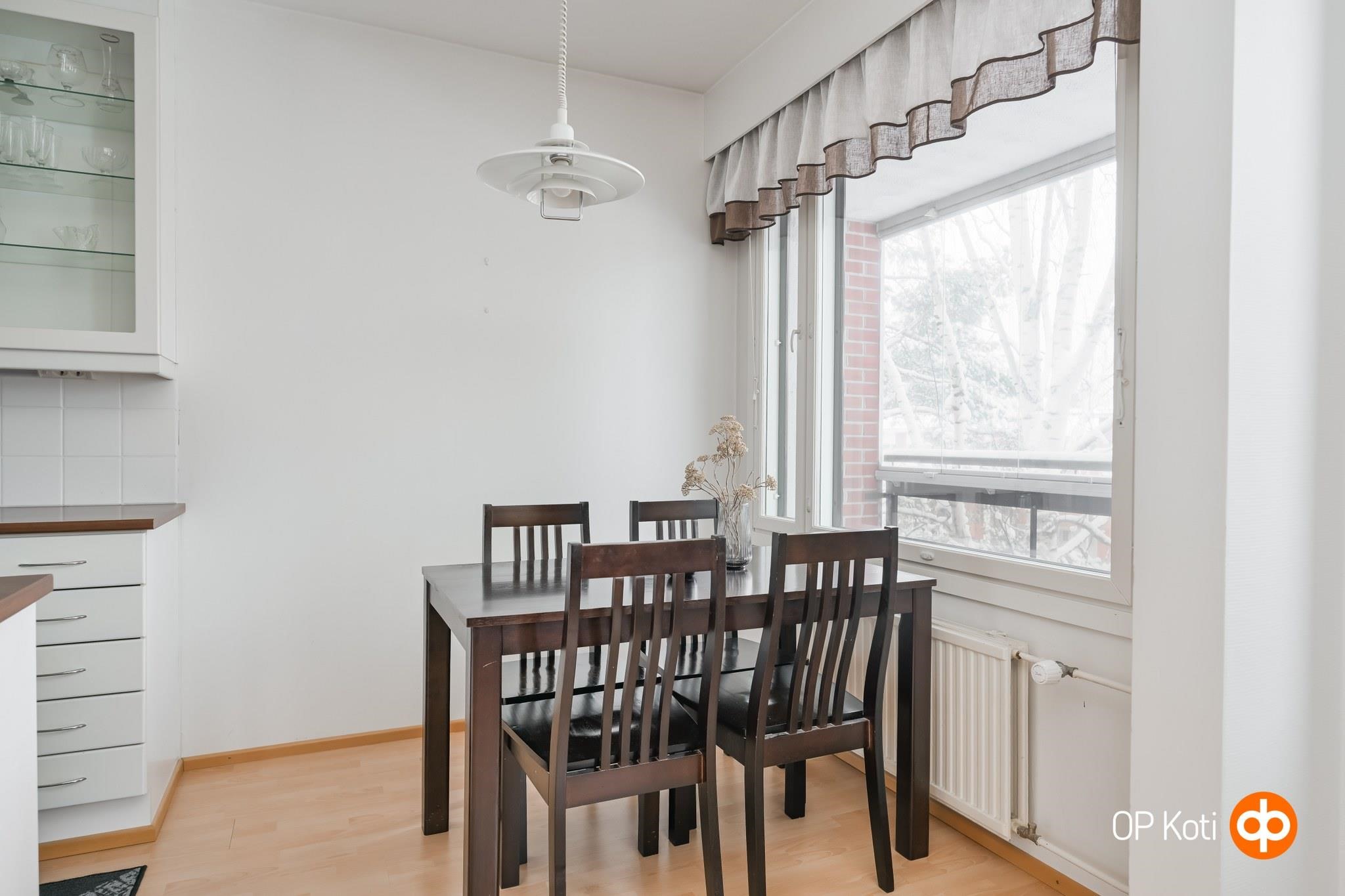 Tässä on heti vapaa kulmahuoneisto, jossa vain yhdellä seinällä on naapurit. Koti sijaitsee kolmannessa kerroksessa, hissittömässä talossa, mutta näkymät asunnosta ja lasitetulta parvekkeelta ovat sangen viihtyisät ja suojaisat. Koivut ja männyt suojaavat kivasti kesän paahteilta, kun leveä parveke on lounaaseen. Asunnon ikkunat ovat kolmeen suuntaan, tehden asunnosta entistä avaramman oloisen.