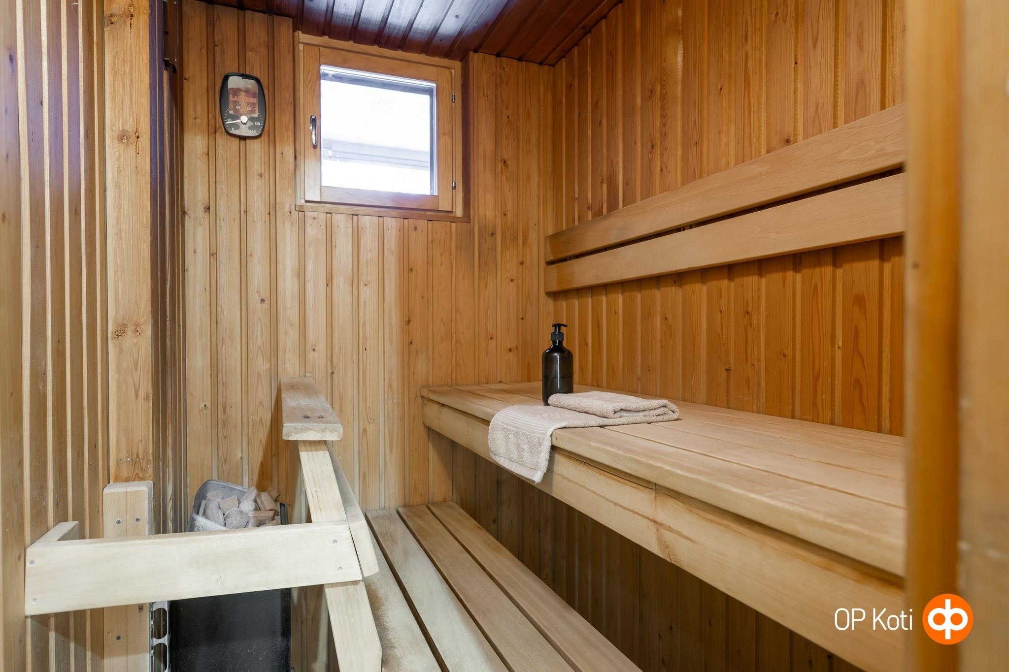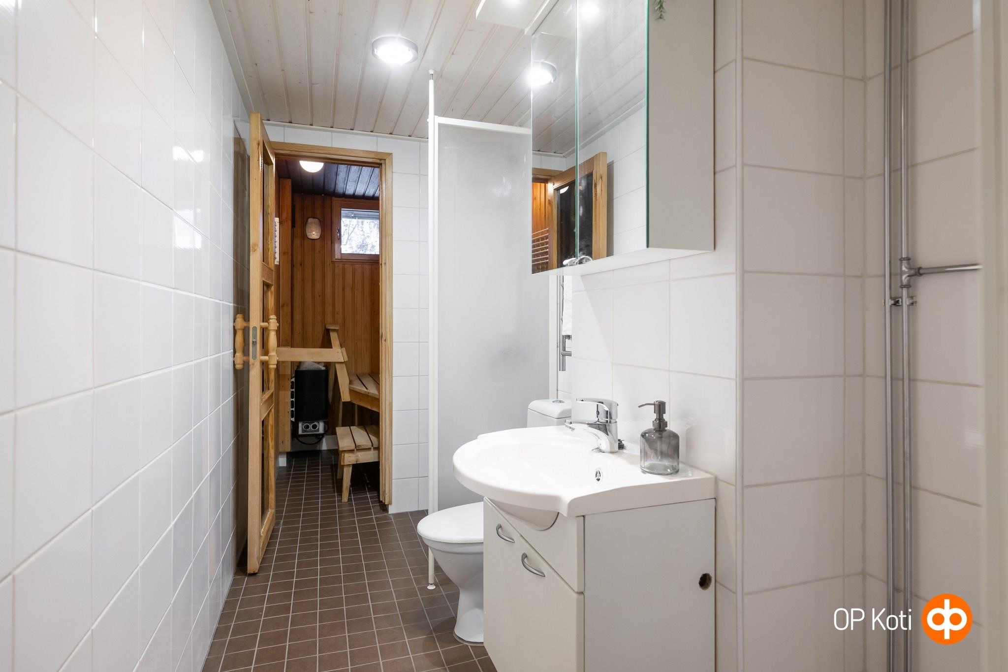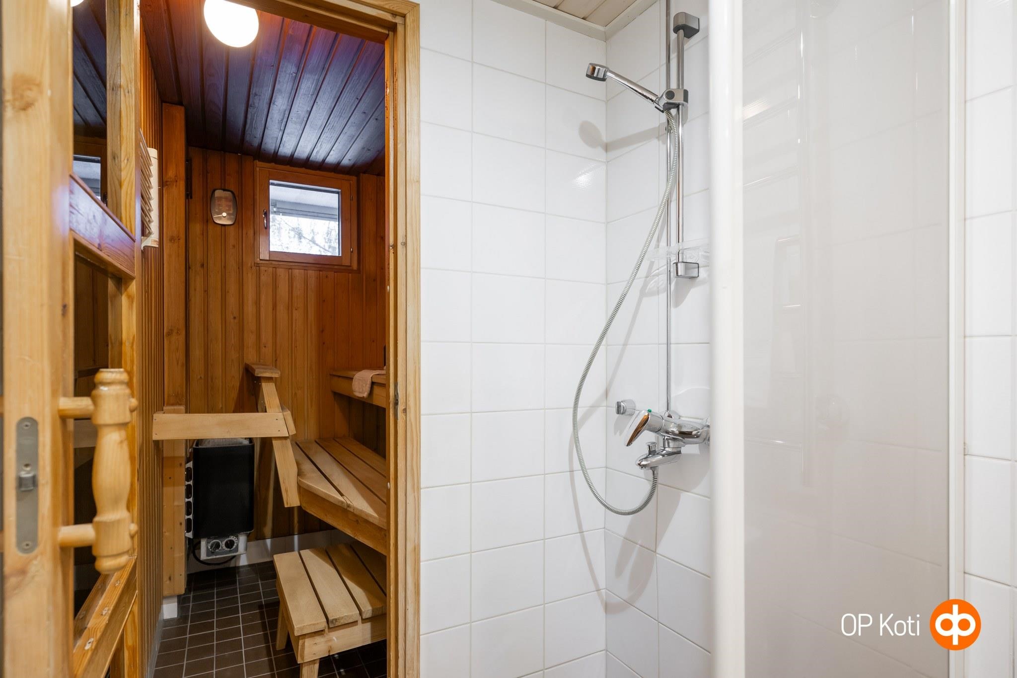 - Sauna, sähkökiuas, kylpyhuone, suihku, suihkuseinä, peilikaappi, allaskaappi, pesukoneliitäntä, kiinteät valaisimet.