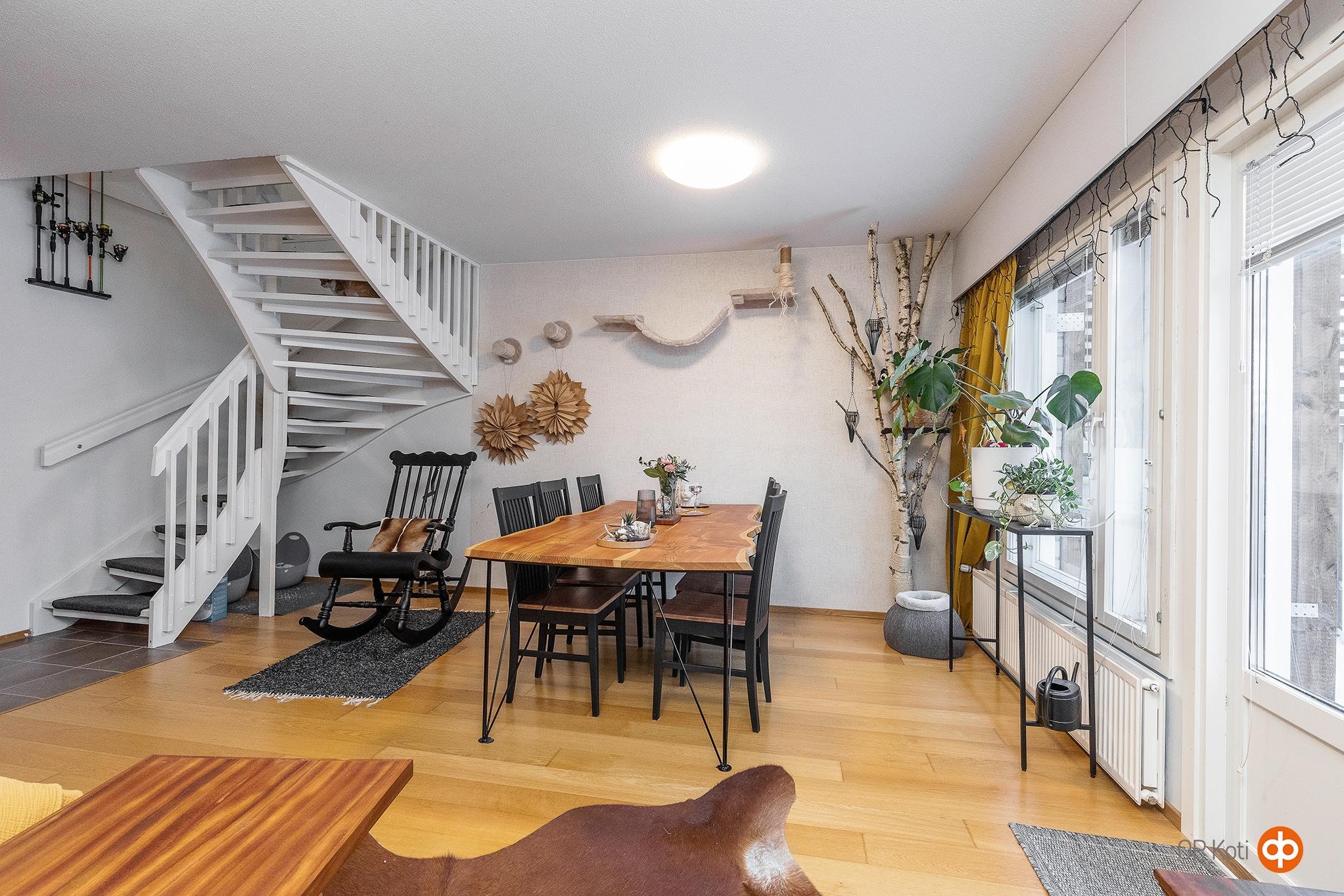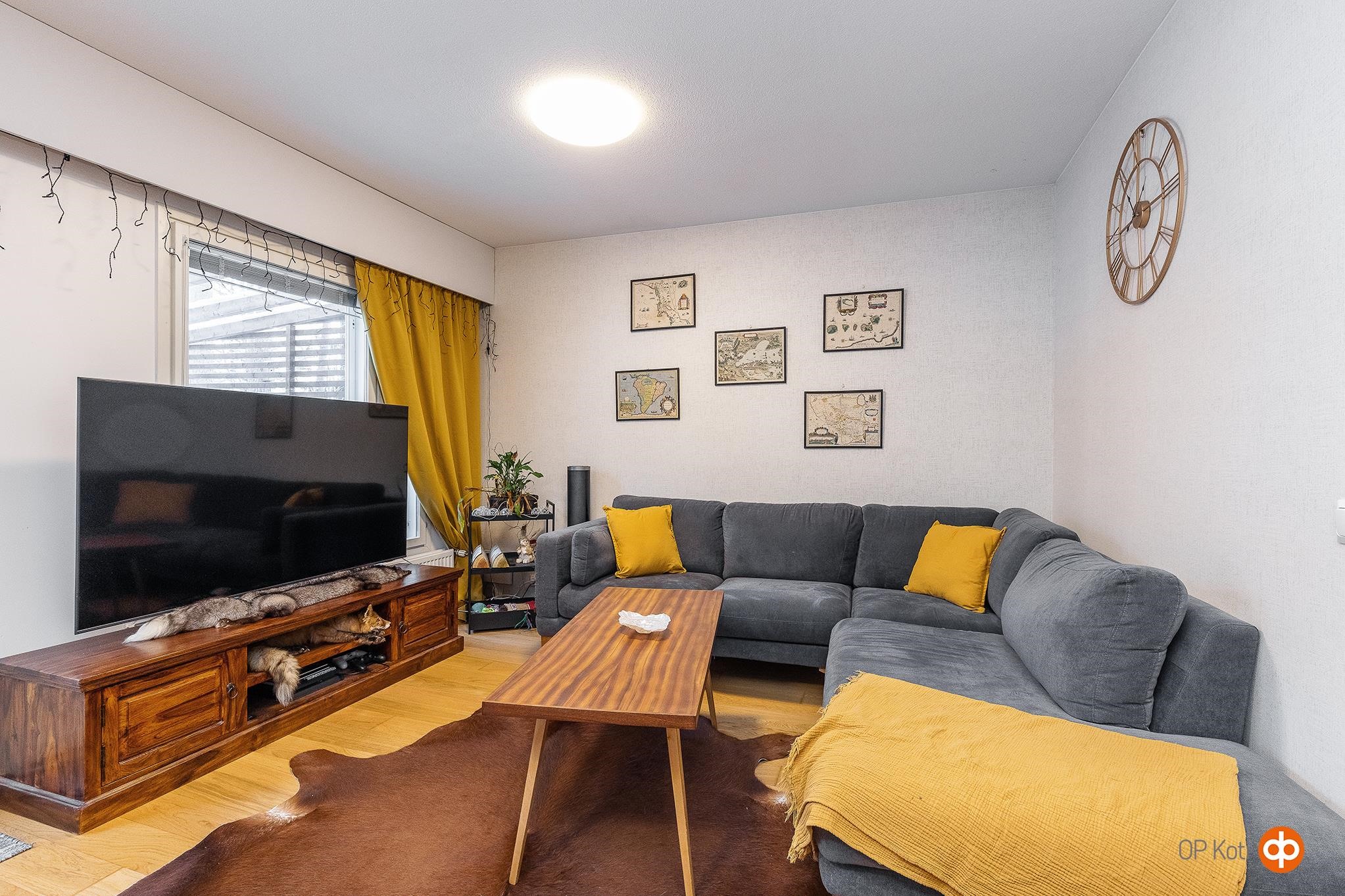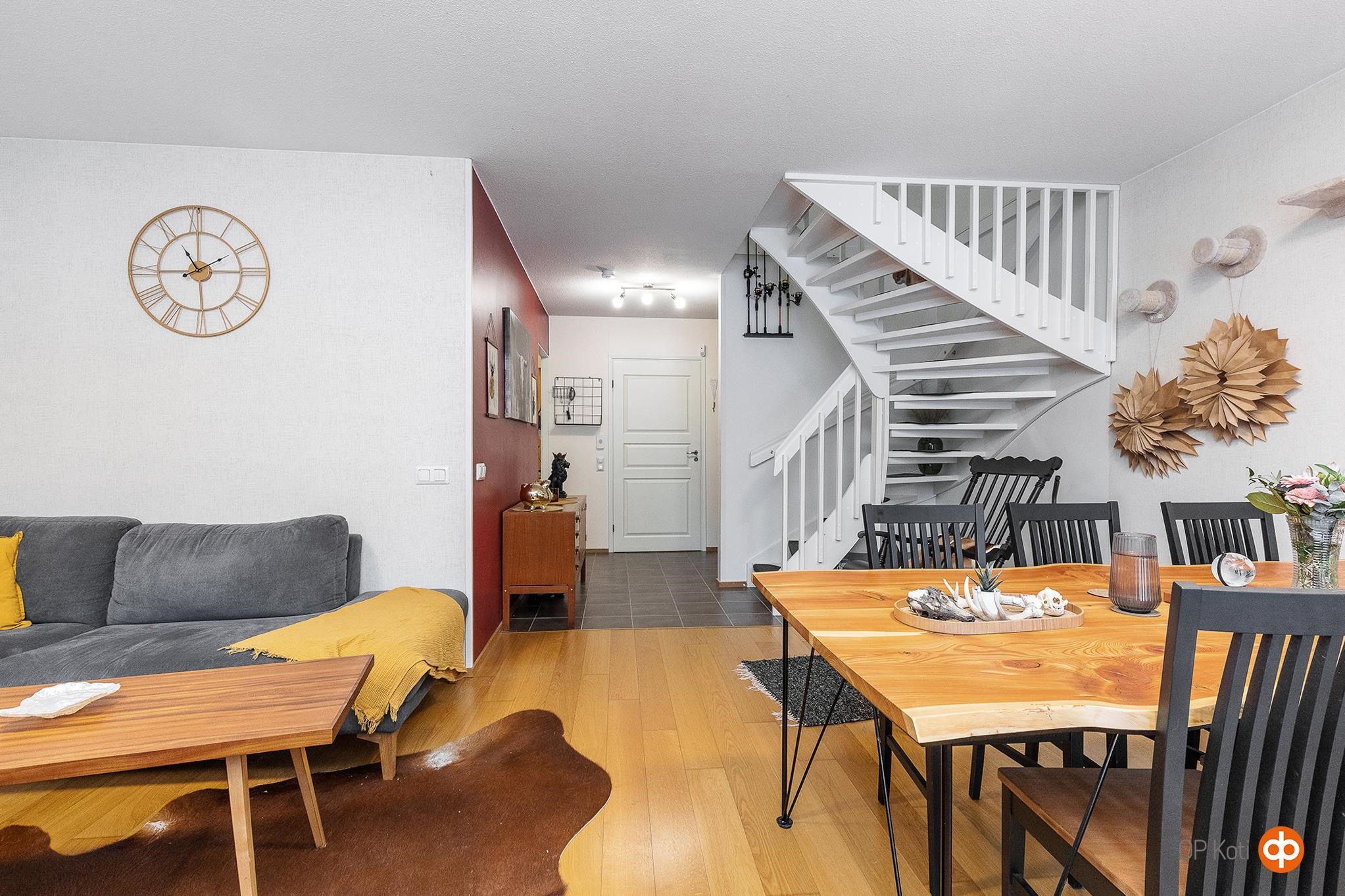 Rivitalon päädyssä sijaitseva 93 m²:n koti tarjoaa valoisat ja selkeälinjaiset tilat kahdessa tasossa. Neljä huonetta, keittiö, kylpyhuone, sauna ja erillinen wc muodostavat kokonaisuuden, joka sopii monenlaisiin elämäntilanteisiin. Olohuoneessa on hyvin tilaa oleskeluun, ja suuret ikkunat päästävät runsaasti luonnonvaloa sisään. Keittiö on käytännöllinen ja tarjoaa riittävästi kaappitilaa sekä paikan ruokapöydälle. Sauna ja kylpyhuone luovat miellyttävän paikan rentoutua kiireisen päivän jälkeen, ja erillinen wc lisää arjen sujuvuutta.
