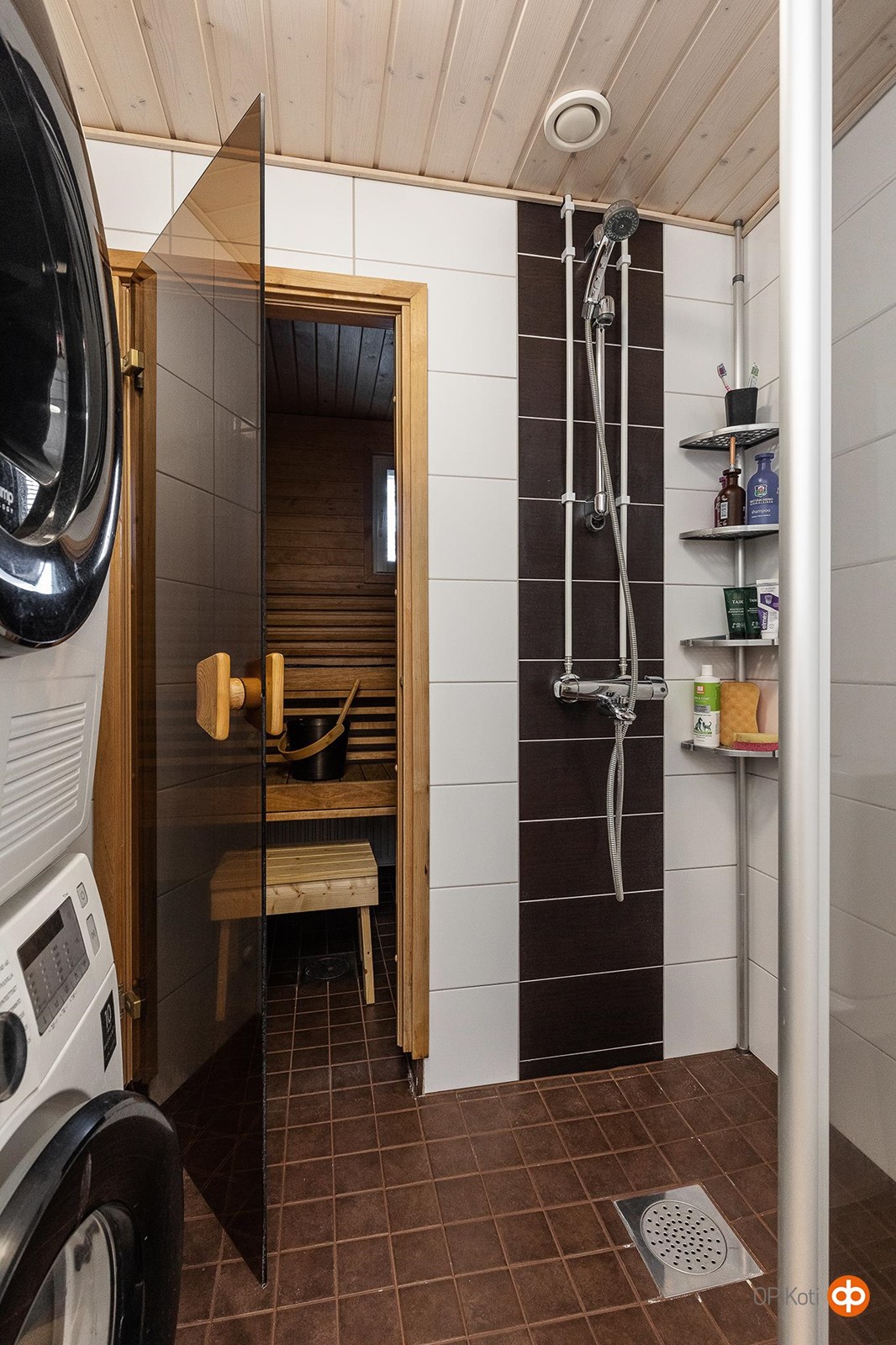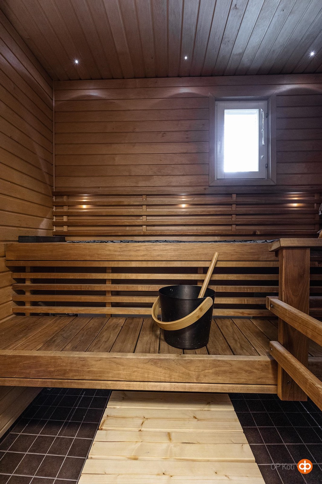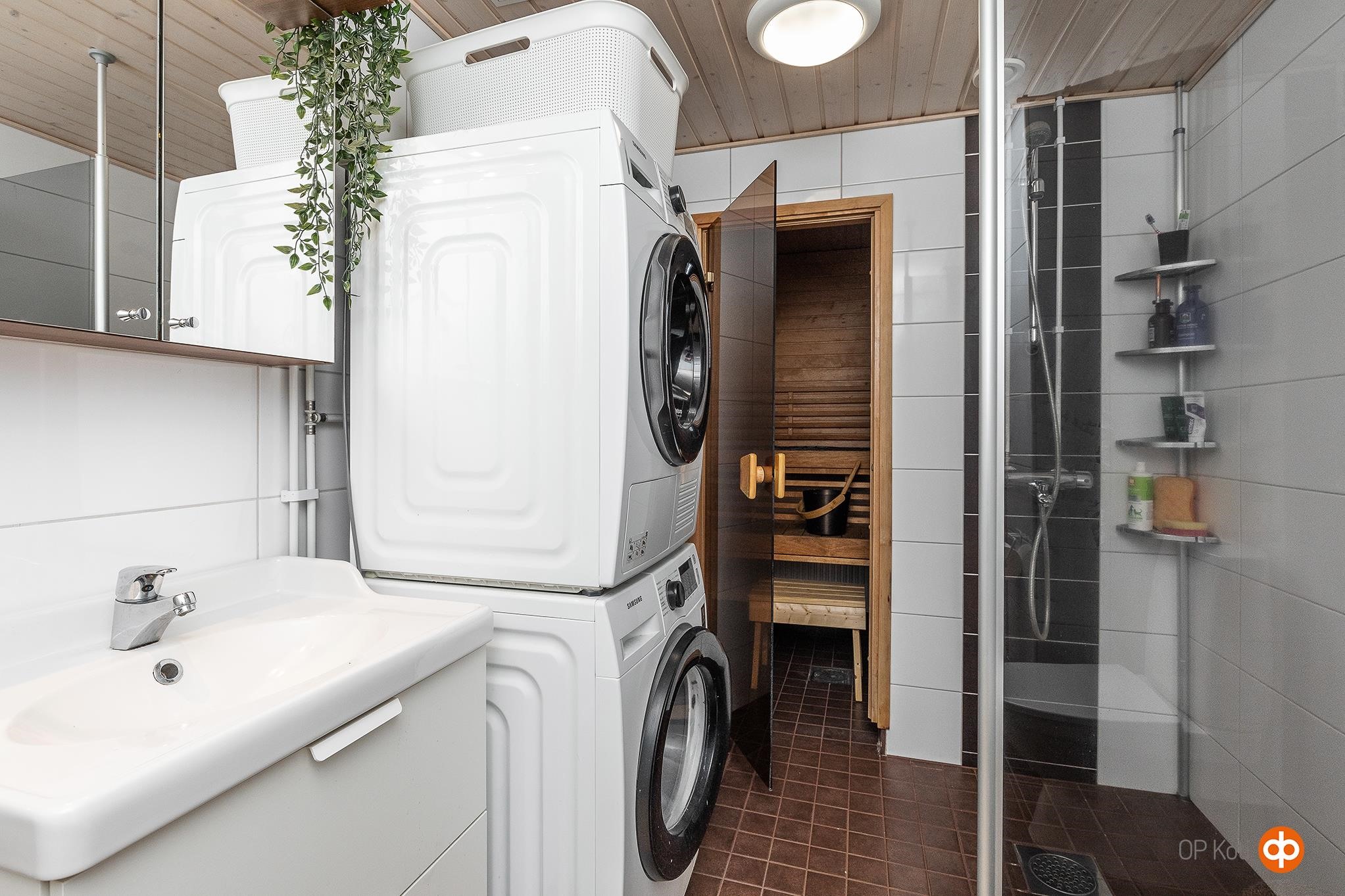 - Sauna, sähkökiuas, erillinen wc, suihku, peilikaappi, allaskaappi, pesukoneliitäntä, kiinteät valaisimet.
