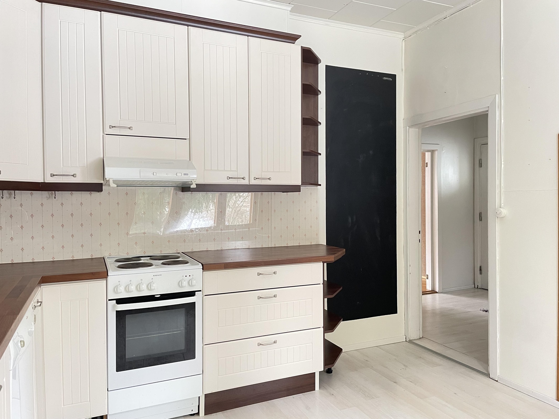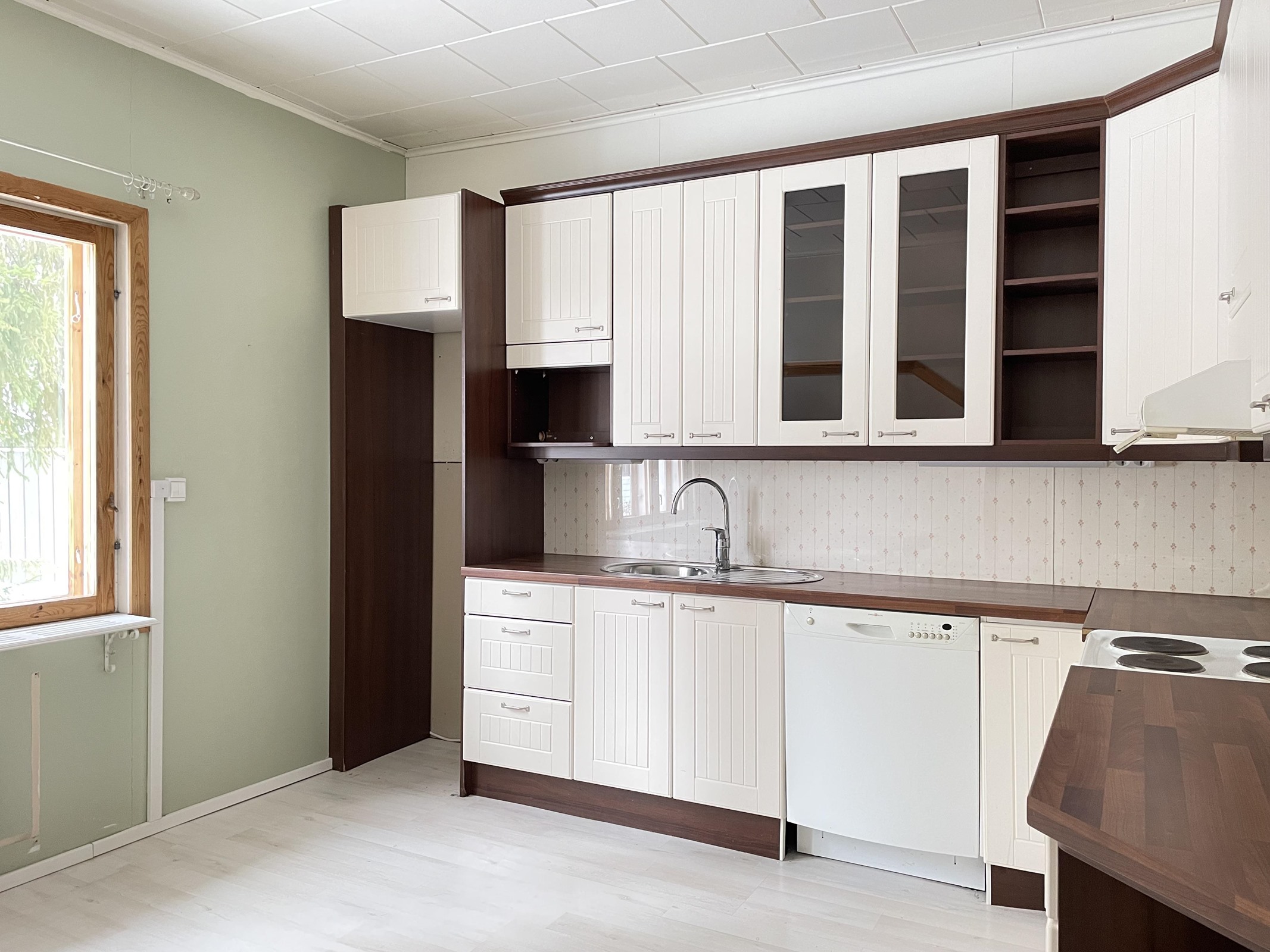 - Jääkaappipakastin, sähköliesi, liesituuletin, astianpesukone, kaapistot, kiinteät valaisimet.