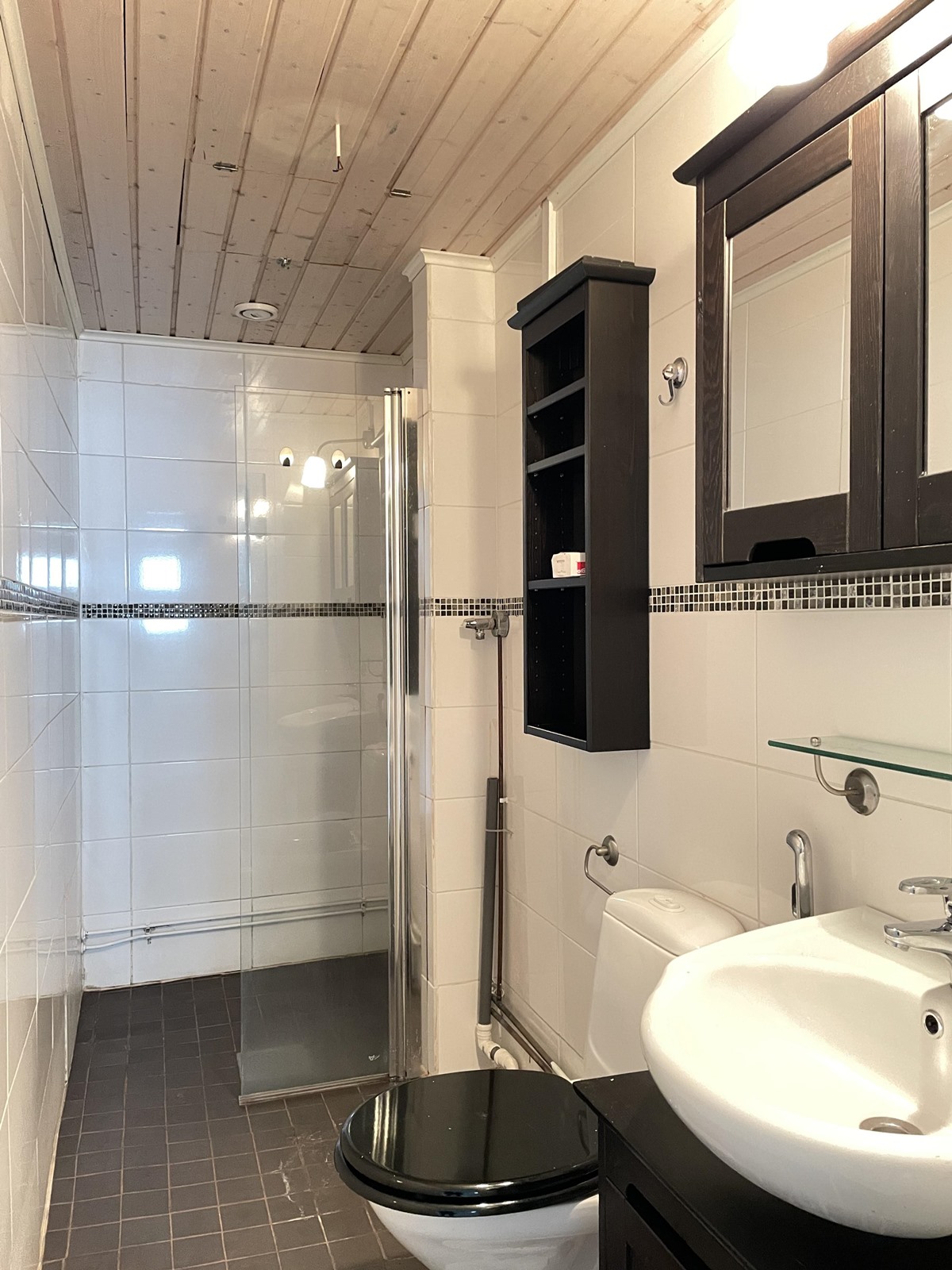 - Kylpyhuone, suihku, suihkuseinä, peilikaappi, allaskaappi, pesukoneliitäntä, kiinteät valaisimet.