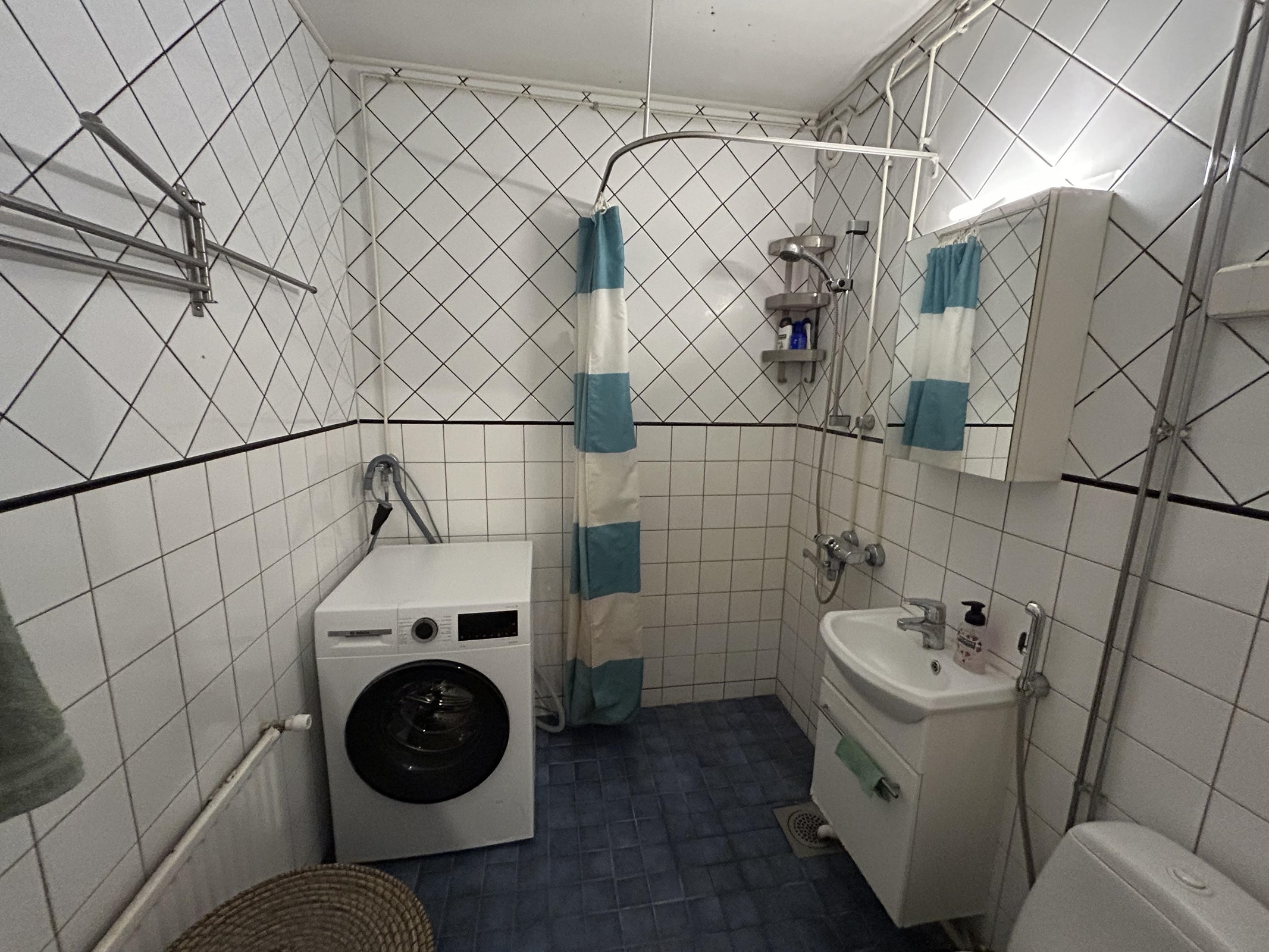 - Suihku, peilikaappi, allaskaappi, pesukoneliitäntä, kiinteät valaisimet.