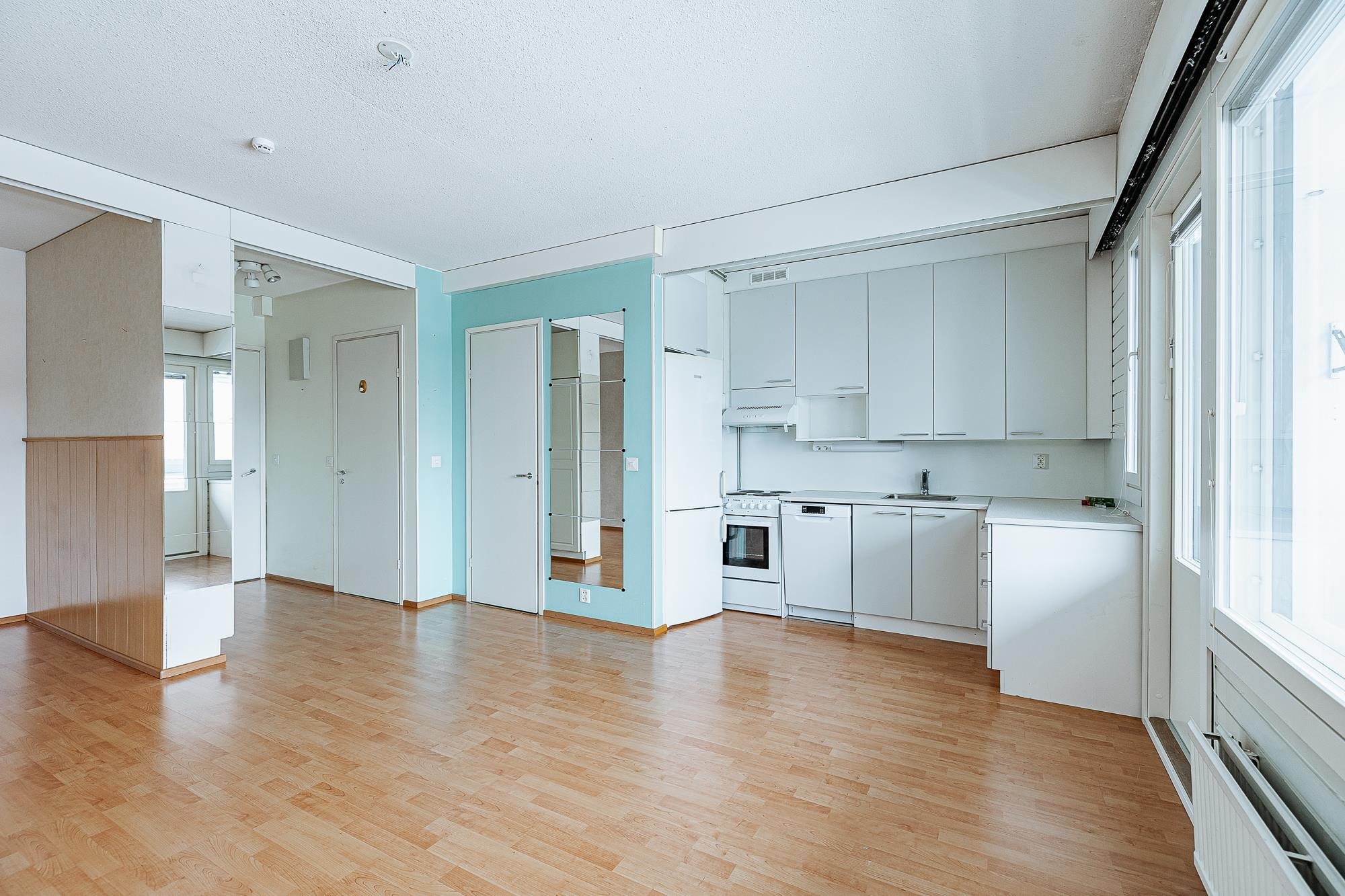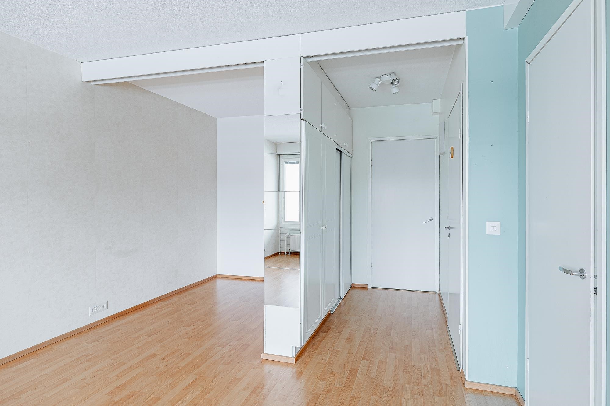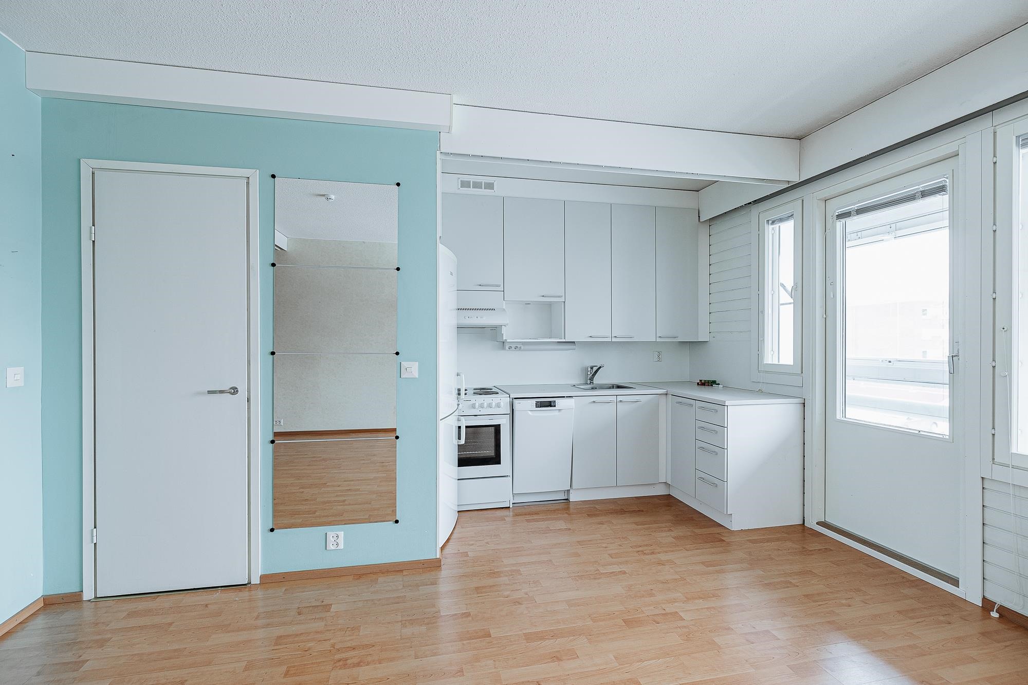 Keittiö: lattia laminaattia, seinät maalattu. Olohuone: lattia laminaattia, seinät maalattu/tapetoitu. Kylpyhuone: lattia ja seinät laattaa.