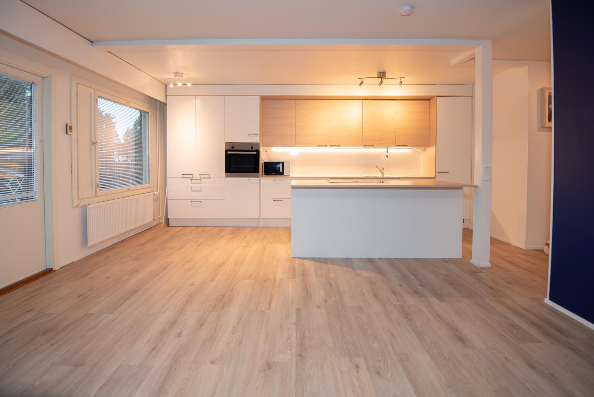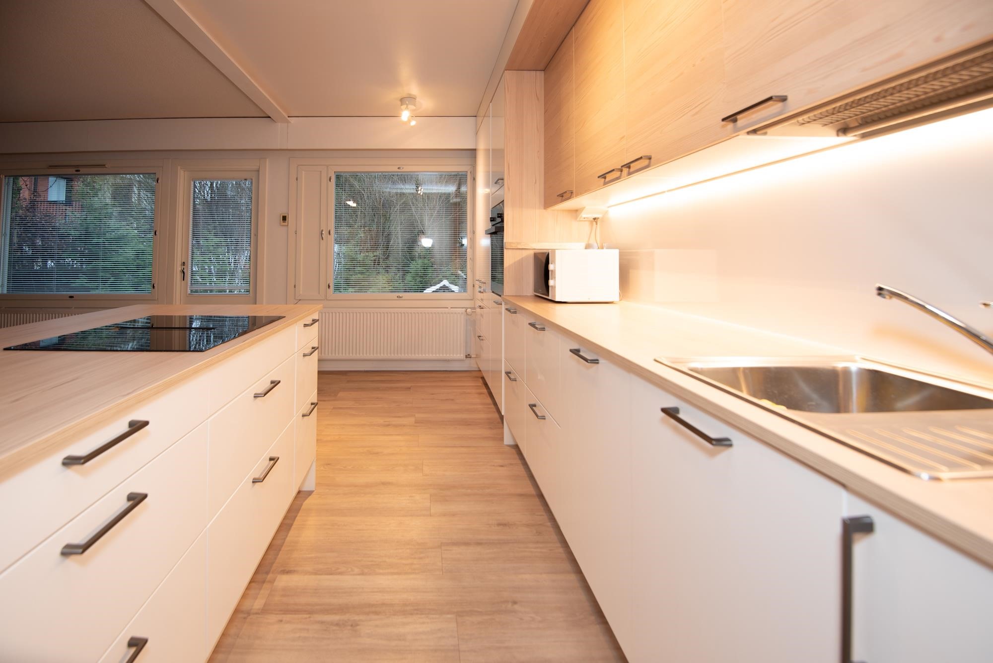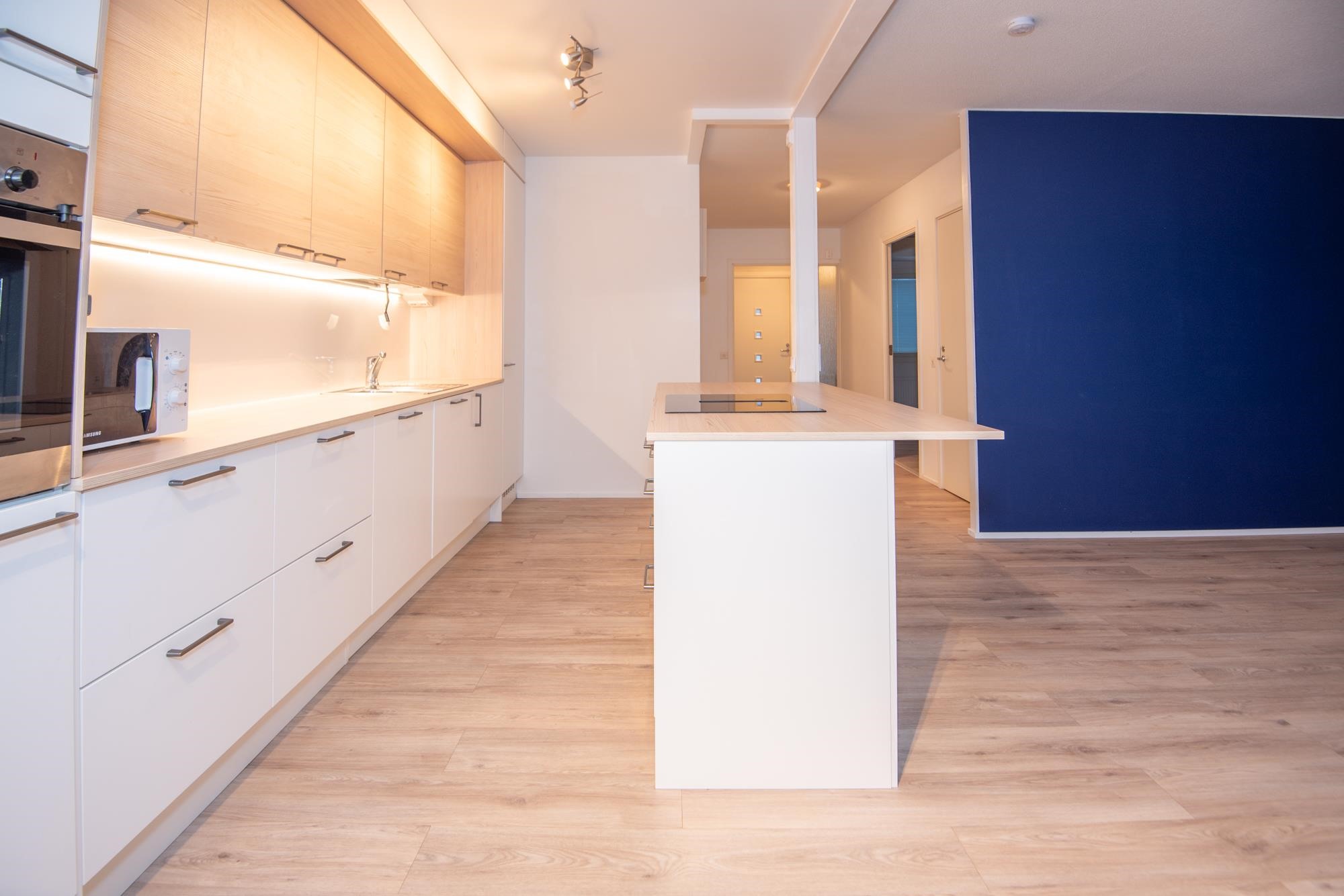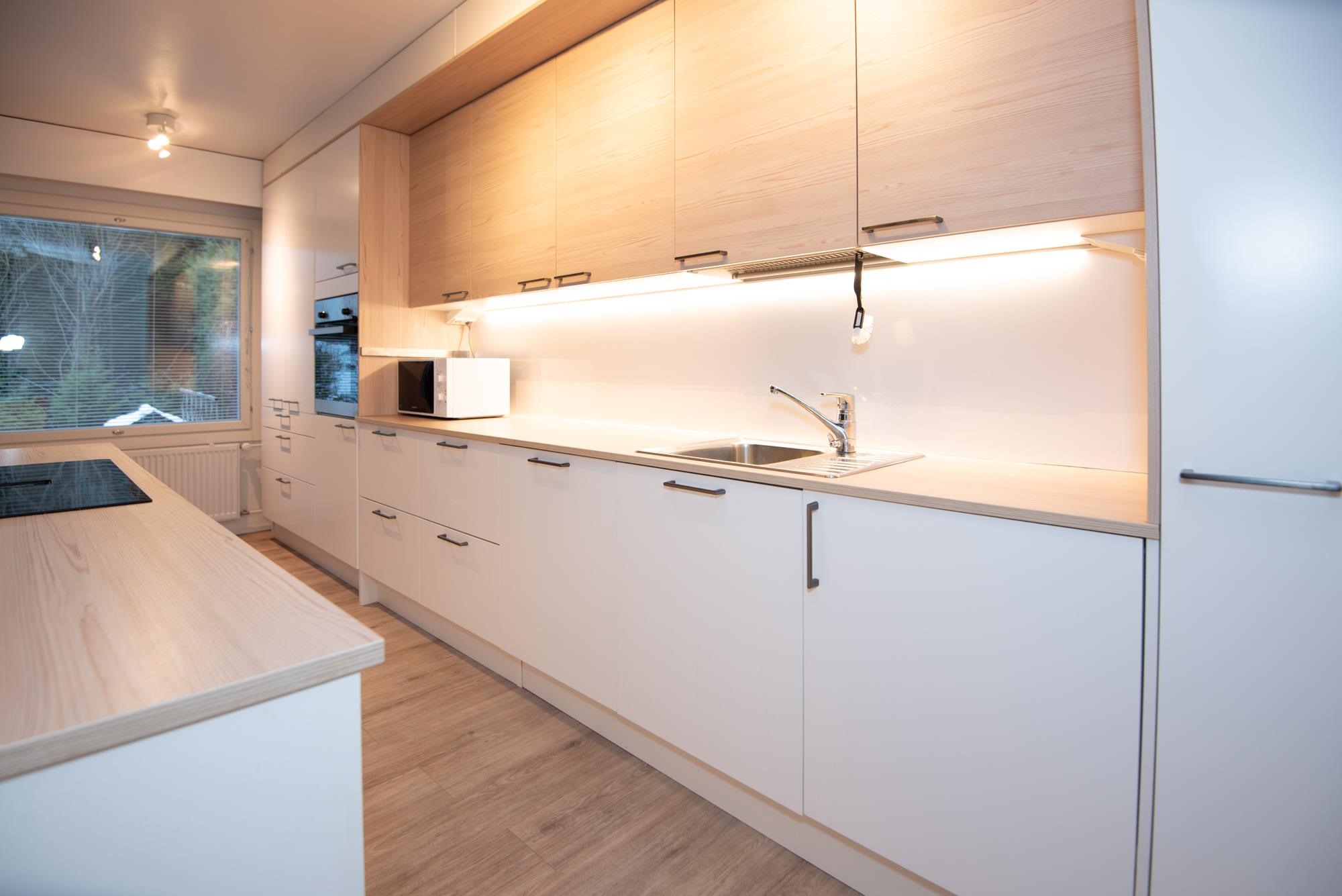 - Jääkaappi täyskorkea, pakastekaappi, liesitaso, induktioliesi, liesituuletin Liesitasoon integroitu, mikroaaltouuni, astianpesukone, kaapistot, Aamiaiskaappi.
