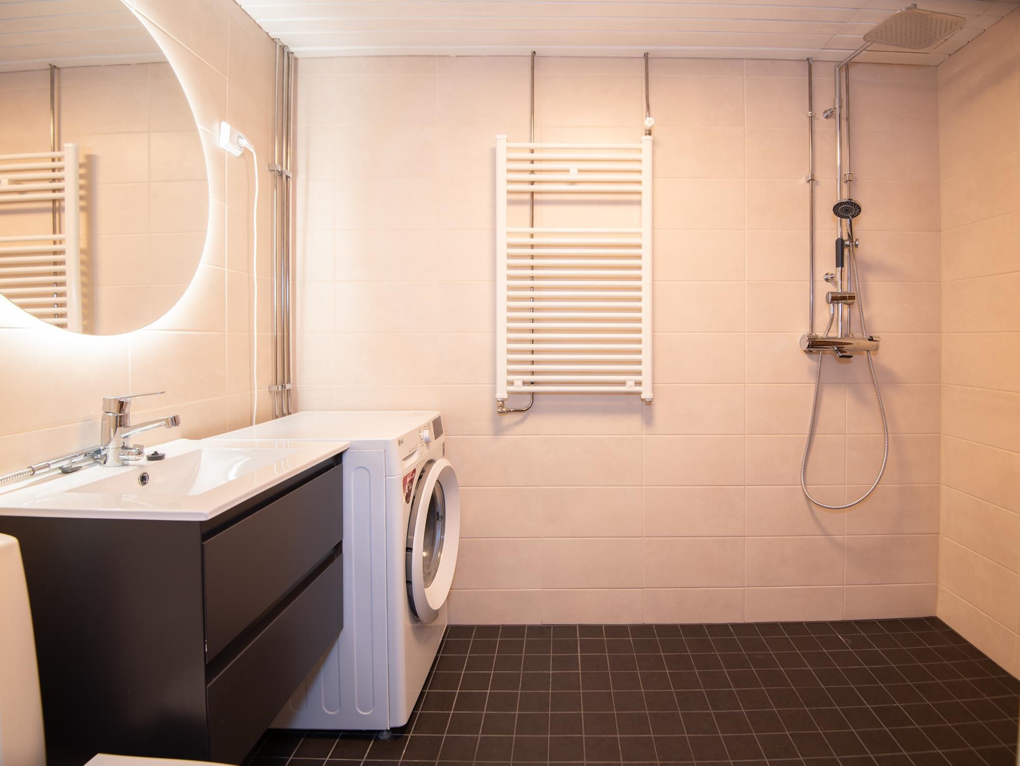 - Sauna, sähkökiuas, kylpyhuone, suihku, peilit, allaskaappi, pesukoneliitäntä Pyykinpesukone vuokralaisen käytettävissä.