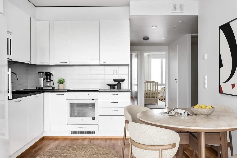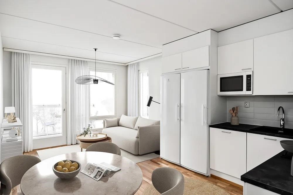 Nämä modernit kodit tarjoavat kaikki nykyaikaisen asumisen mukavuudet. Elegantit keittiöt on varustettu ajattomilla valkoisilla kaapistoilla ja tummilla työtasoilla, jotka luovat tyylikkään kontrastin. Täydellinen varustelu, kuten kylmäkalusteet ja astianpesukone, tekevät arjesta helppoa. Kylpyhuoneessa lattialämmitys ja laadukkaat materiaalit tuovat arjen luksusta, ja onpa osassa huoneistoja myös oma sauna.