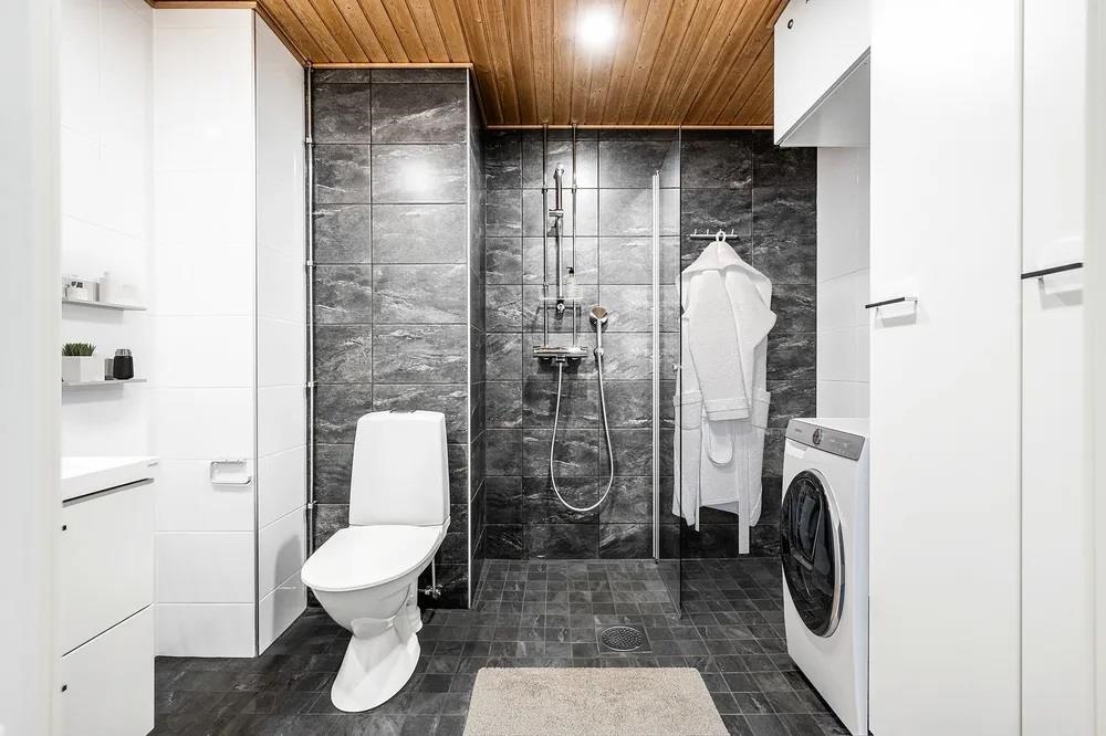 - Kylpyhuone, suihku, suihkuseinä, peilikaappi, kaapit, allaskaappi, pesukoneliitäntä, lattialämmitys.