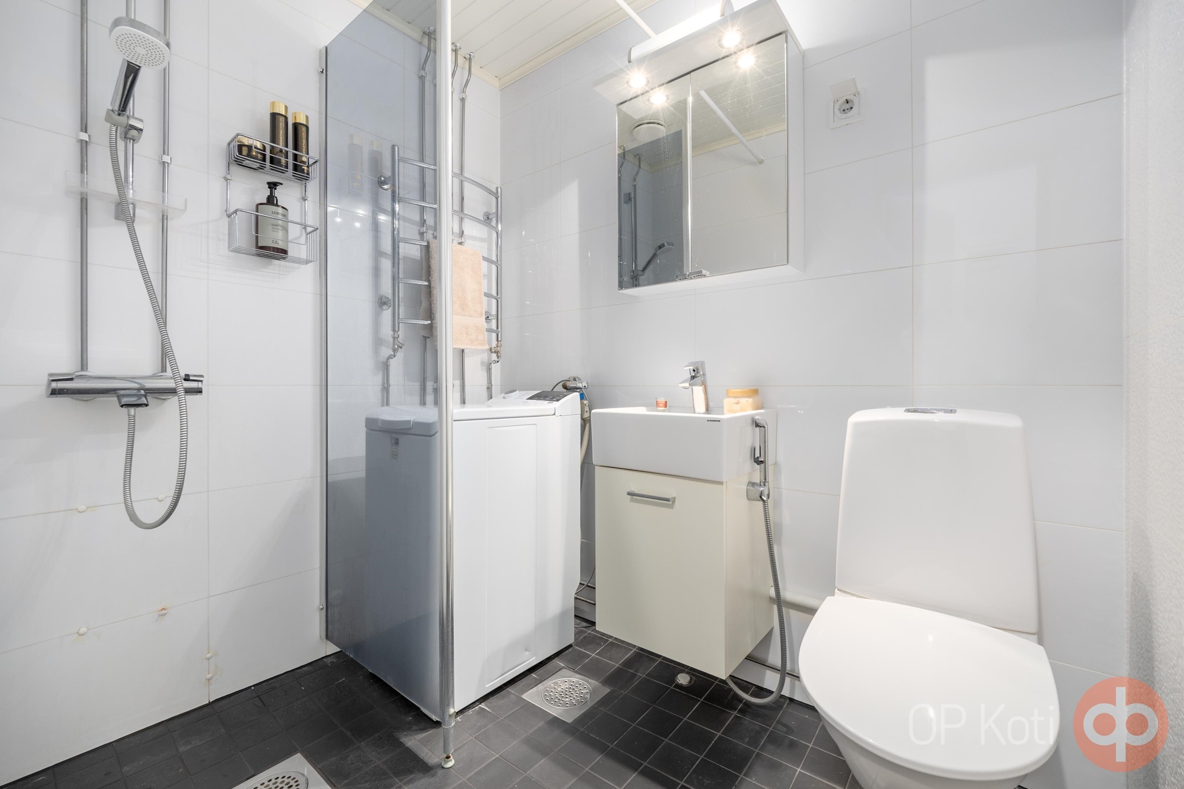 - Suihku, suihkuseinä, peilikaappi, allaskaappi, pesukoneliitäntä, kiinteät valaisimet. rättipatteri