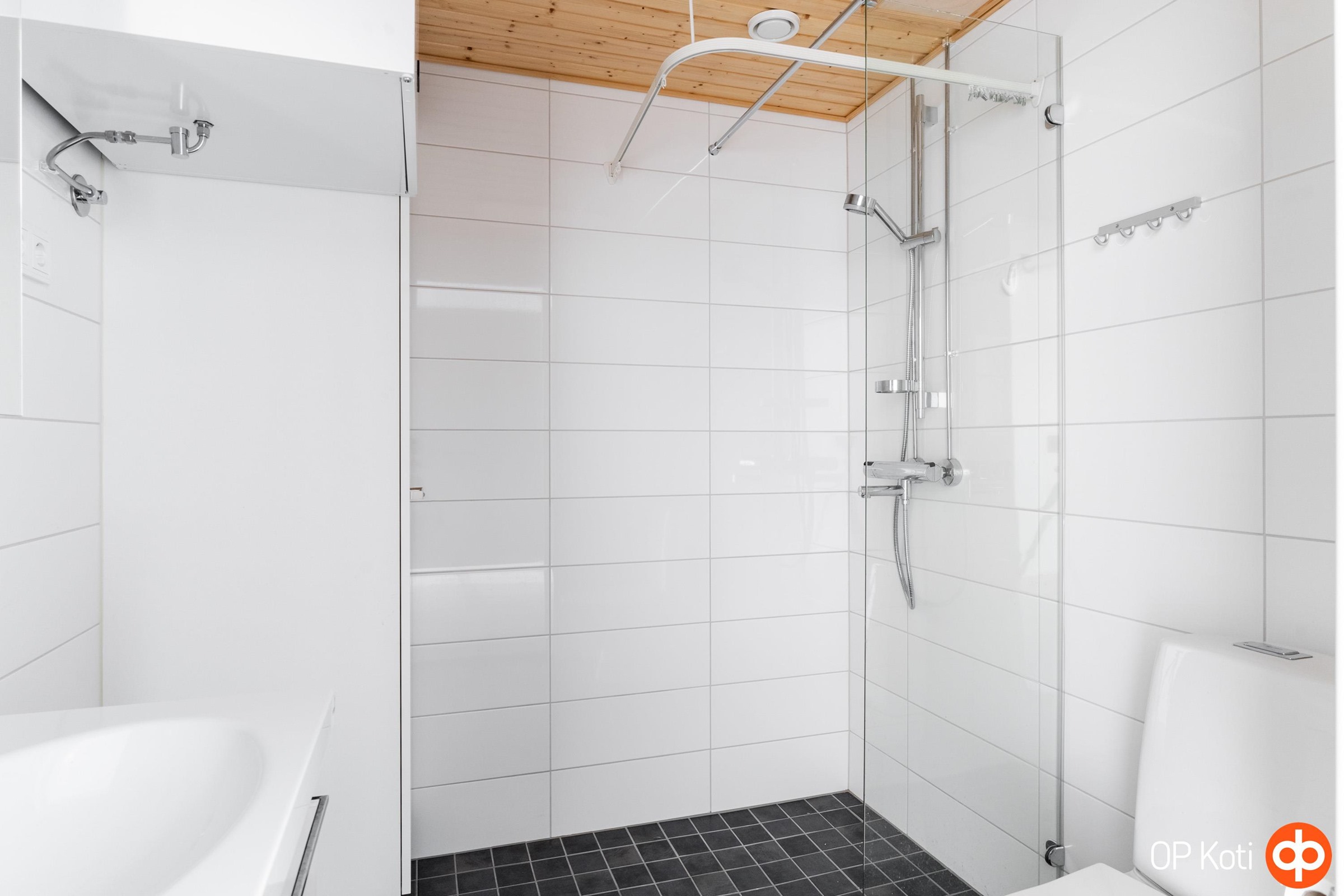 - Kylpyhuone, suihku, peilikaappi, allaskaappi, pesukoneliitäntä, kiinteät valaisimet.