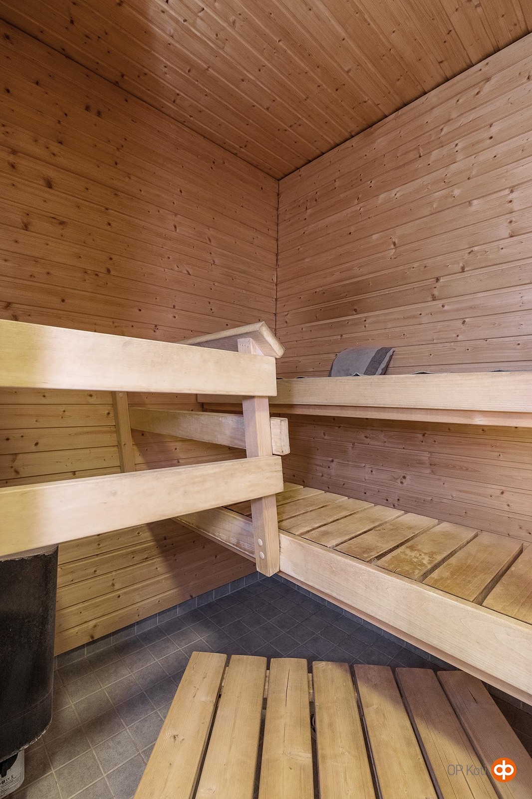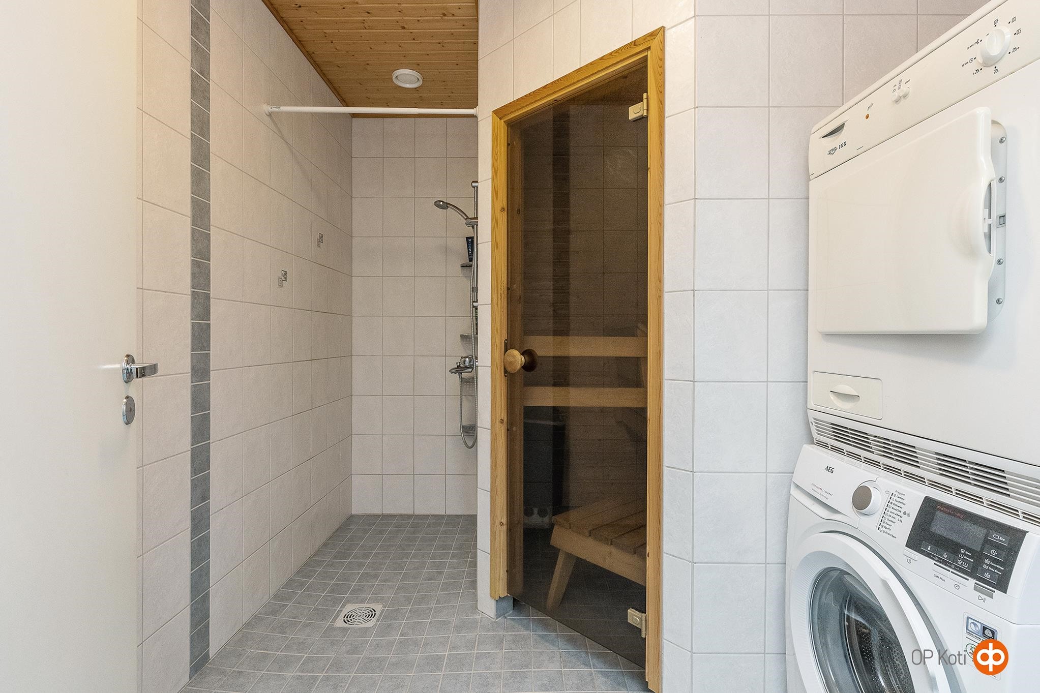 - Sauna, sähkökiuas, erillinen wc, suihku, peilikaappi, allaskaappi, pesukoneliitäntä, lattialämmitys, kiinteät valaisimet.