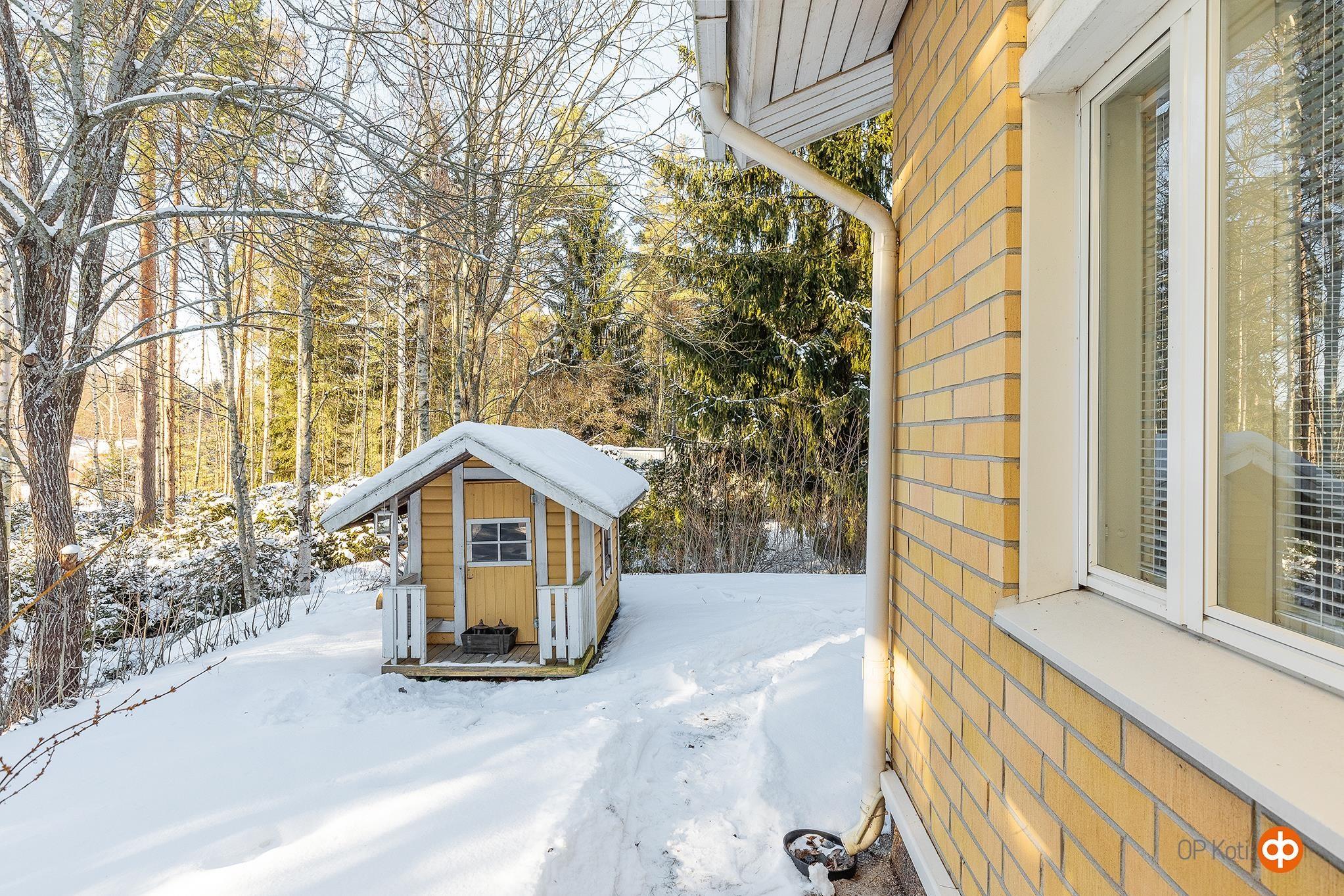 Asuinrakennuksen takapihalla leikkimökki, joka kuuluu kauppaan.