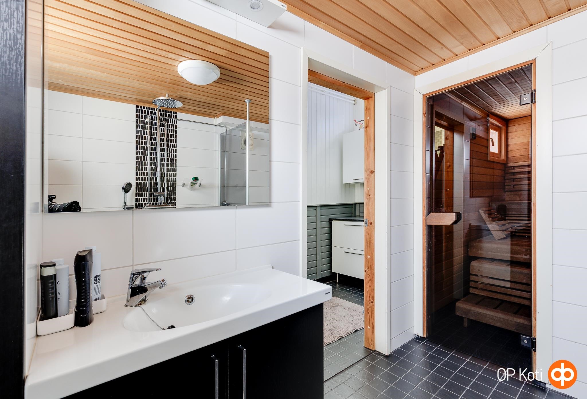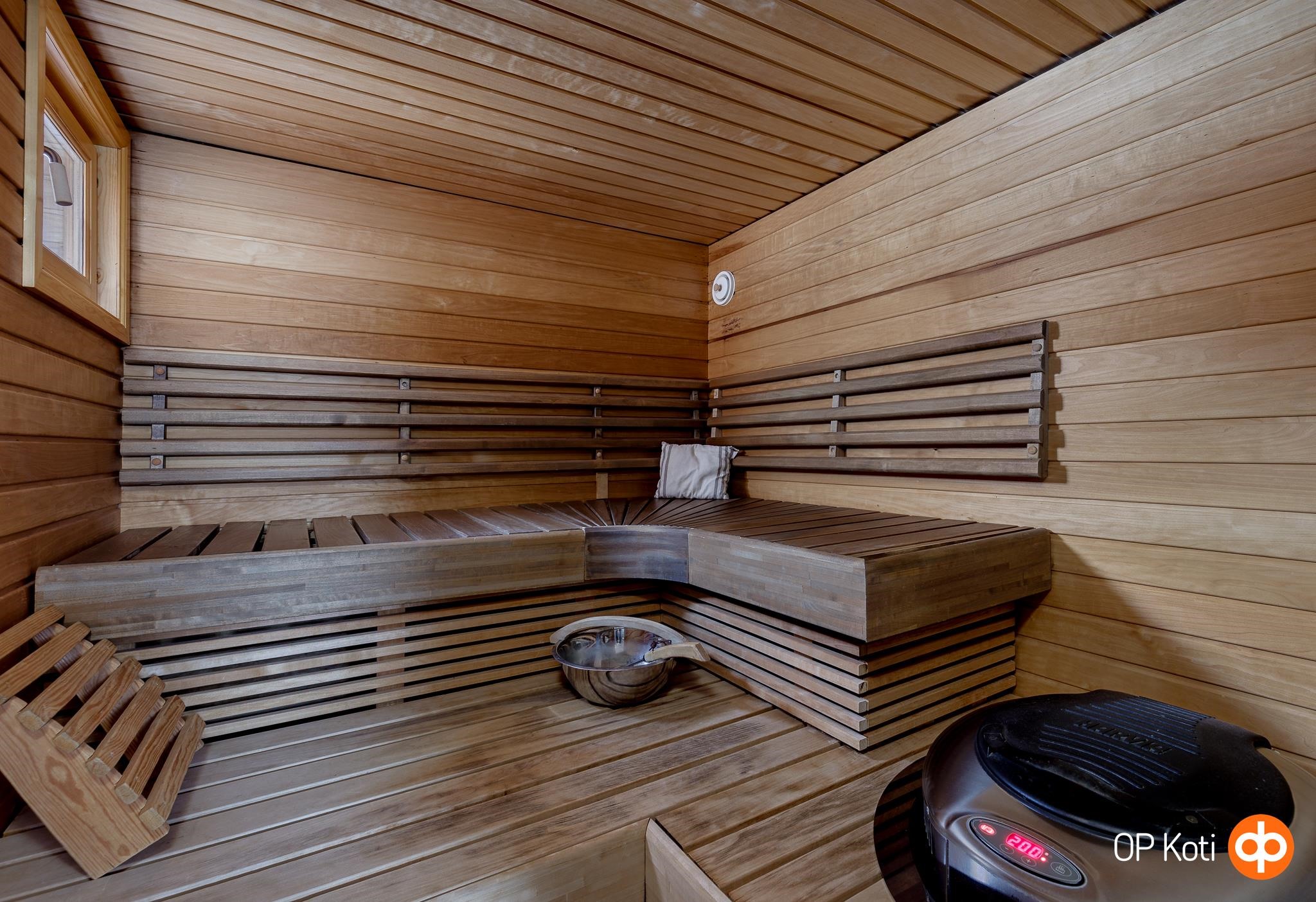 - Sauna, sähkökiuas Hetivalmis, kylpyhuone, suihku, suihkuseinä, peilit, kaapit, pesukoneliitäntä, lattialämmitys, kiinteät valaisimet.
