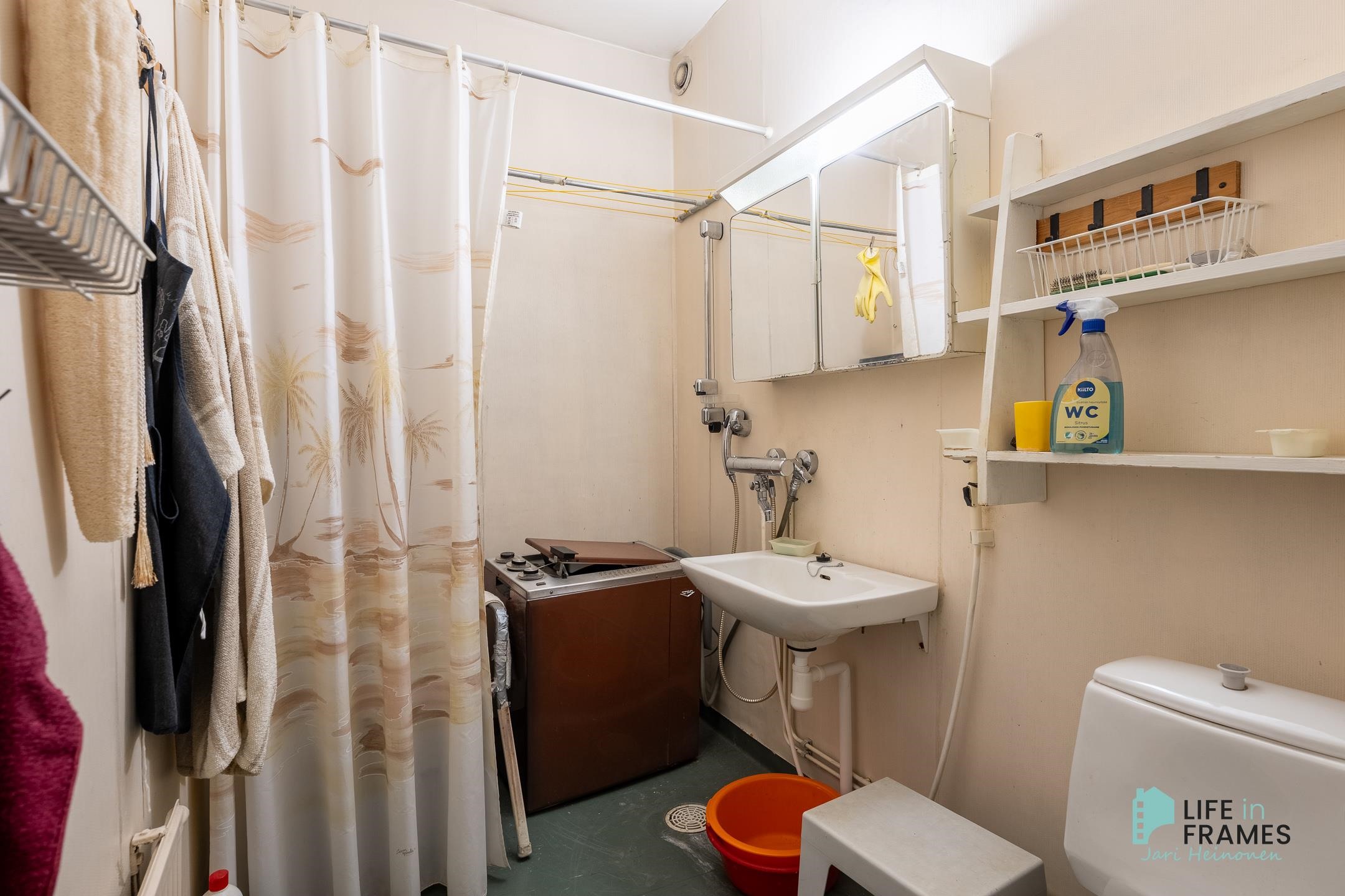 - Kylpyhuone, suihku, peilikaappi, pesukoneliitäntä, kiinteät valaisimet.