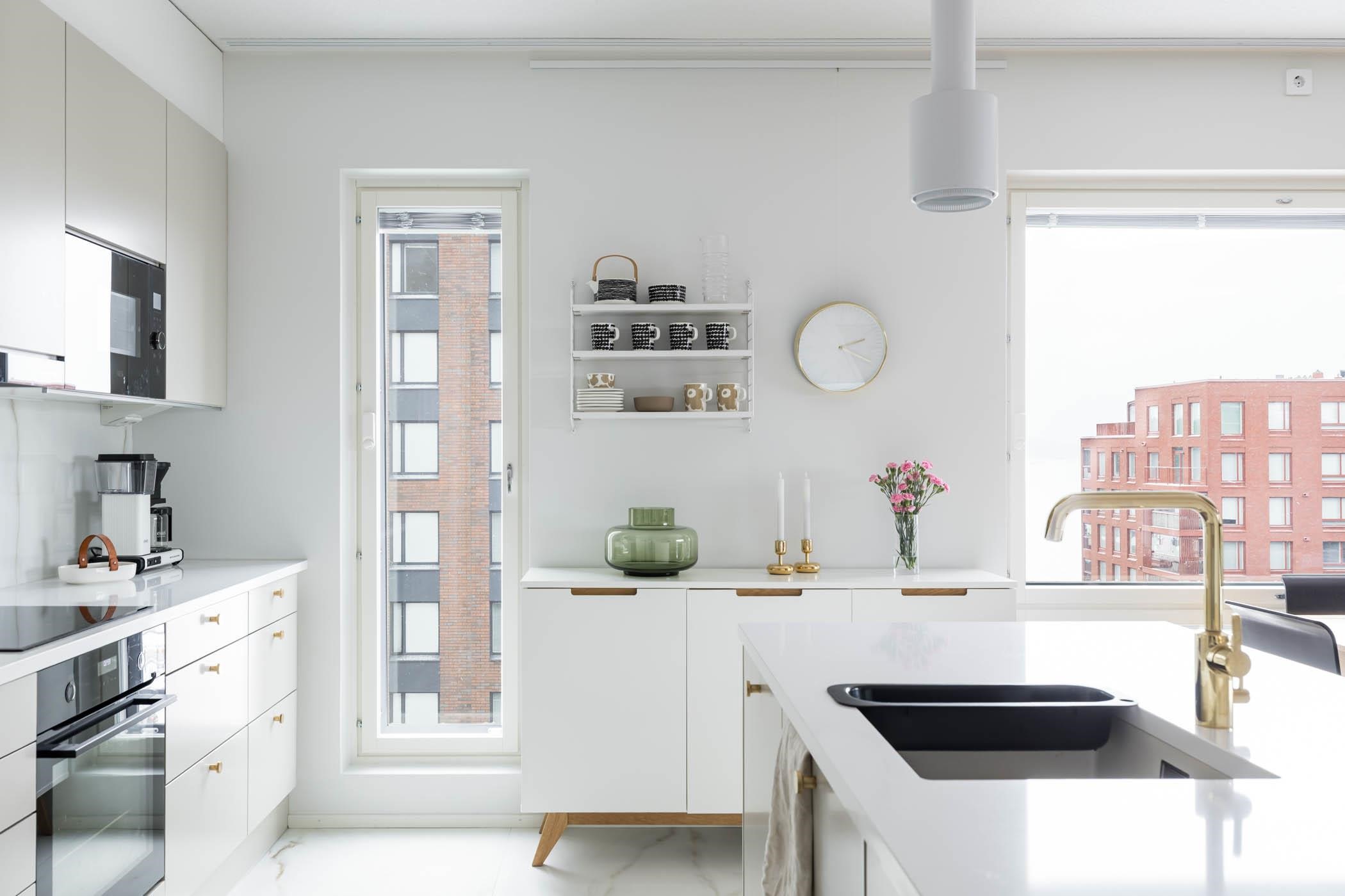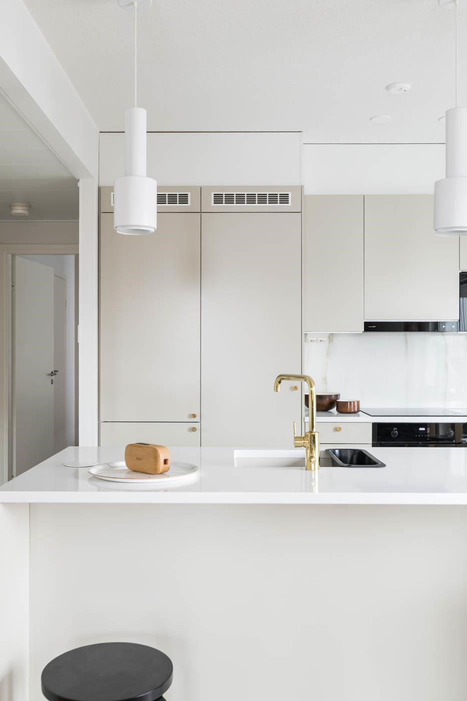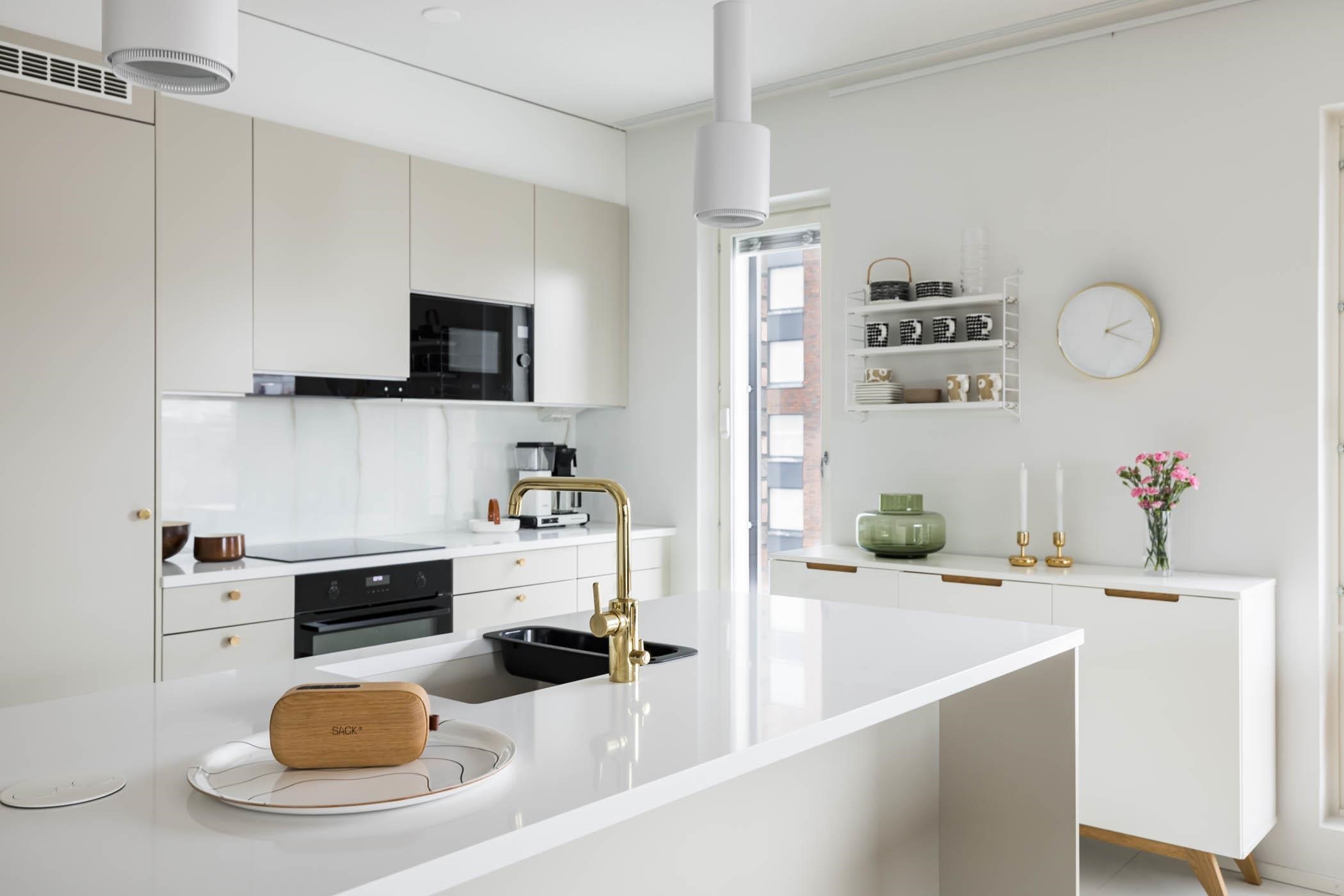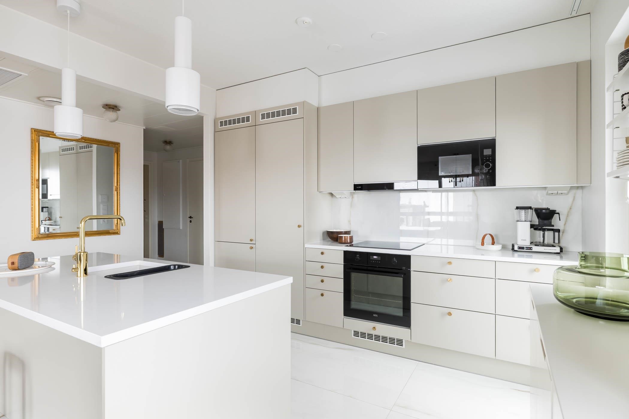 - Harmonisen tyylikäs keittiötila yhdistyy olohuoneen kanssa avaraksi kokonaisuudeksi. Reilunkokoinen saareke toimii mainiosti tilanjakajana ruokailutilalle. Novartin eittiössä on integroidut jää- ja pakastinkaappi, erillisuuni ja induktioliesitaso, liesituuletin, ingetroidut mikroaaltouuni ja astianpesukone. Reilunkokoisessa saarekkeessa on kaunis valkoinen pesuallas ja messinginvärinen tyylikäs hana. Saarekkeessa on säilytystilaa vetolaatikoissa ja baaripöytätasoa. Keittiöön on rakennusaikana tehty laadukkaita tasoparannuksia ja muutostöitä.