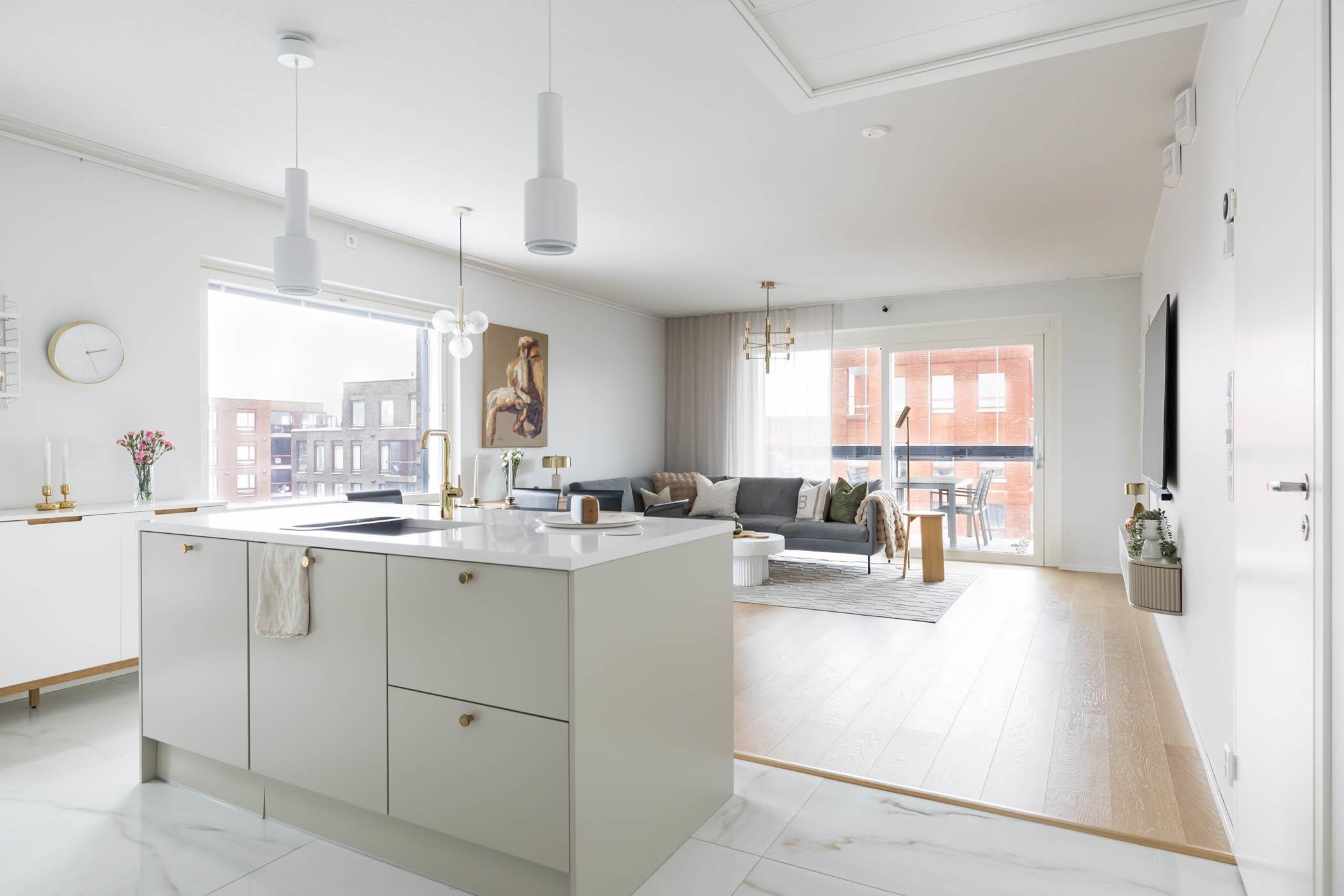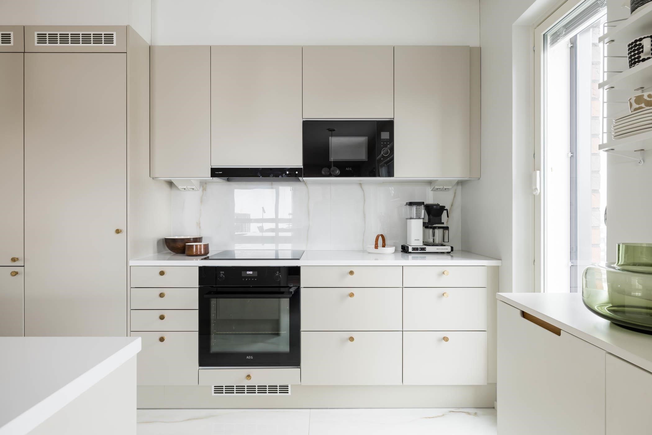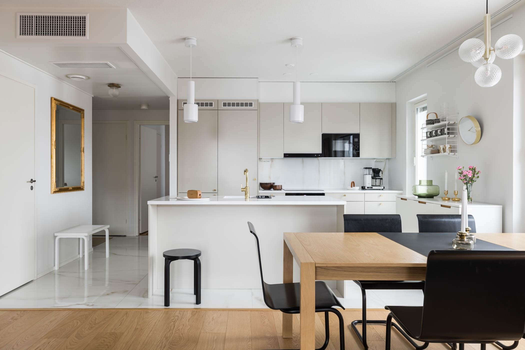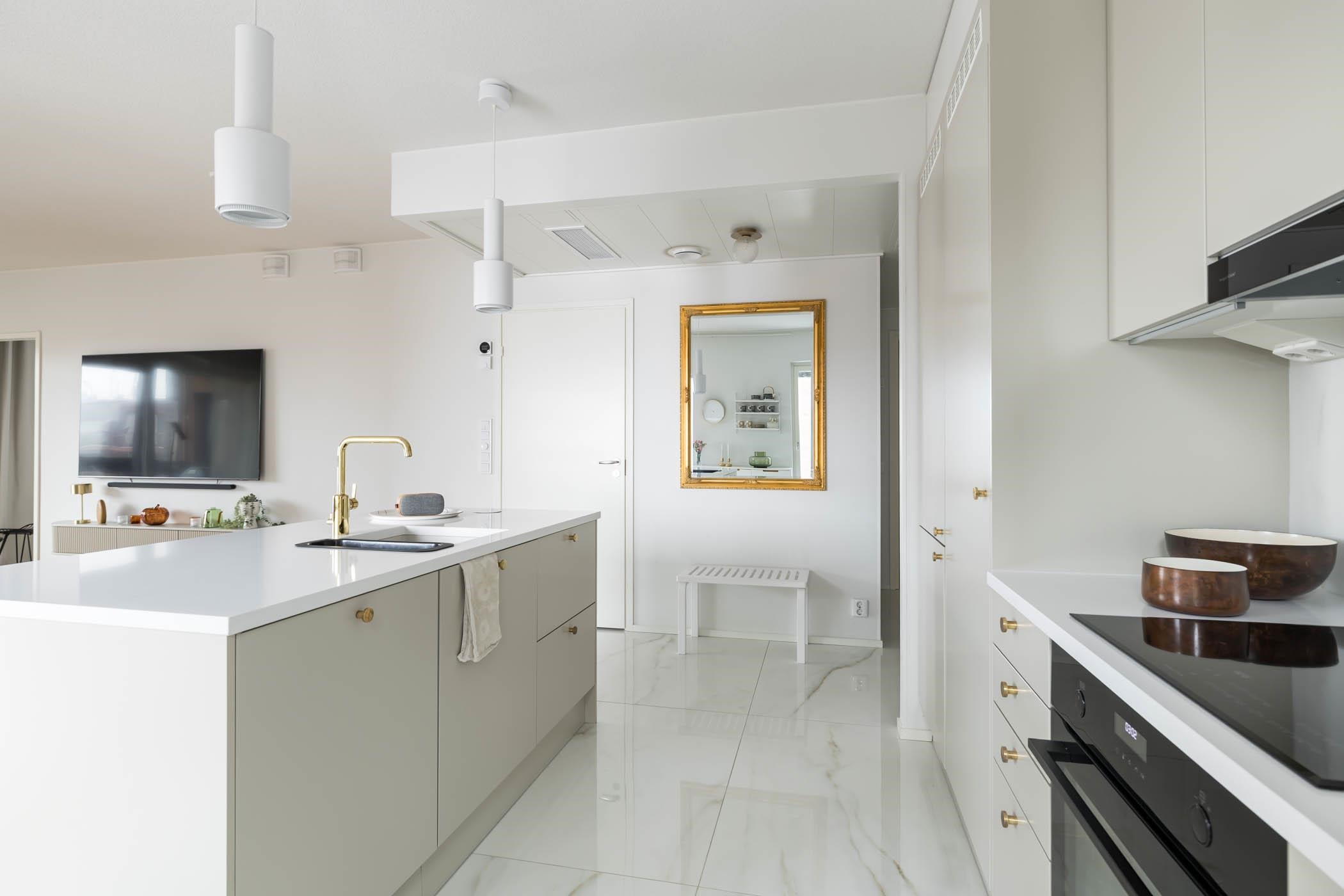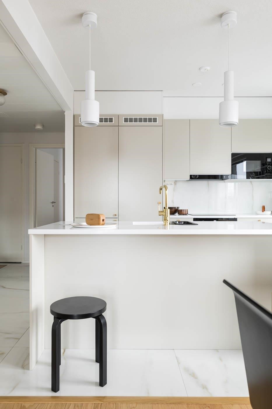 - Harmonisen tyylikäs keittiötila yhdistyy olohuoneen kanssa avaraksi kokonaisuudeksi. Reilunkokoinen saareke toimii mainiosti tilanjakajana ruokailutilalle. Novartin eittiössä on integroidut jää- ja pakastinkaappi, erillisuuni ja induktioliesitaso, liesituuletin, ingetroidut mikroaaltouuni ja astianpesukone. Reilunkokoisessa saarekkeessa on kaunis valkoinen pesuallas ja messinginvärinen tyylikäs hana. Saarekkeessa on säilytystilaa vetolaatikoissa ja baaripöytätasoa. Keittiöön on rakennusaikana tehty laadukkaita tasoparannuksia ja muutostöitä.