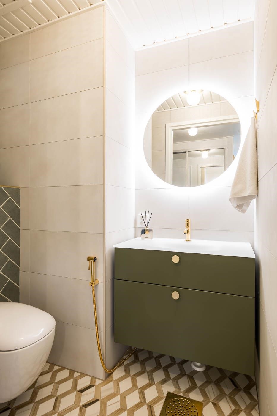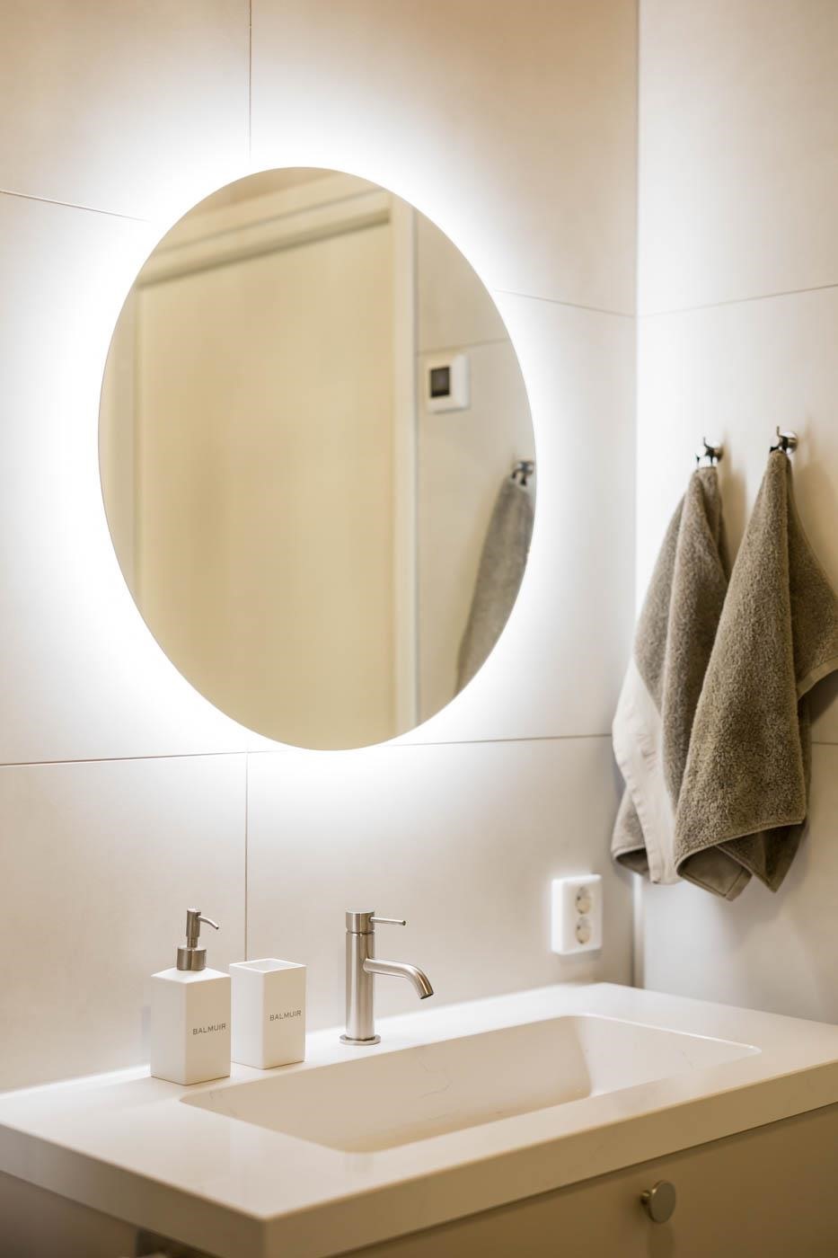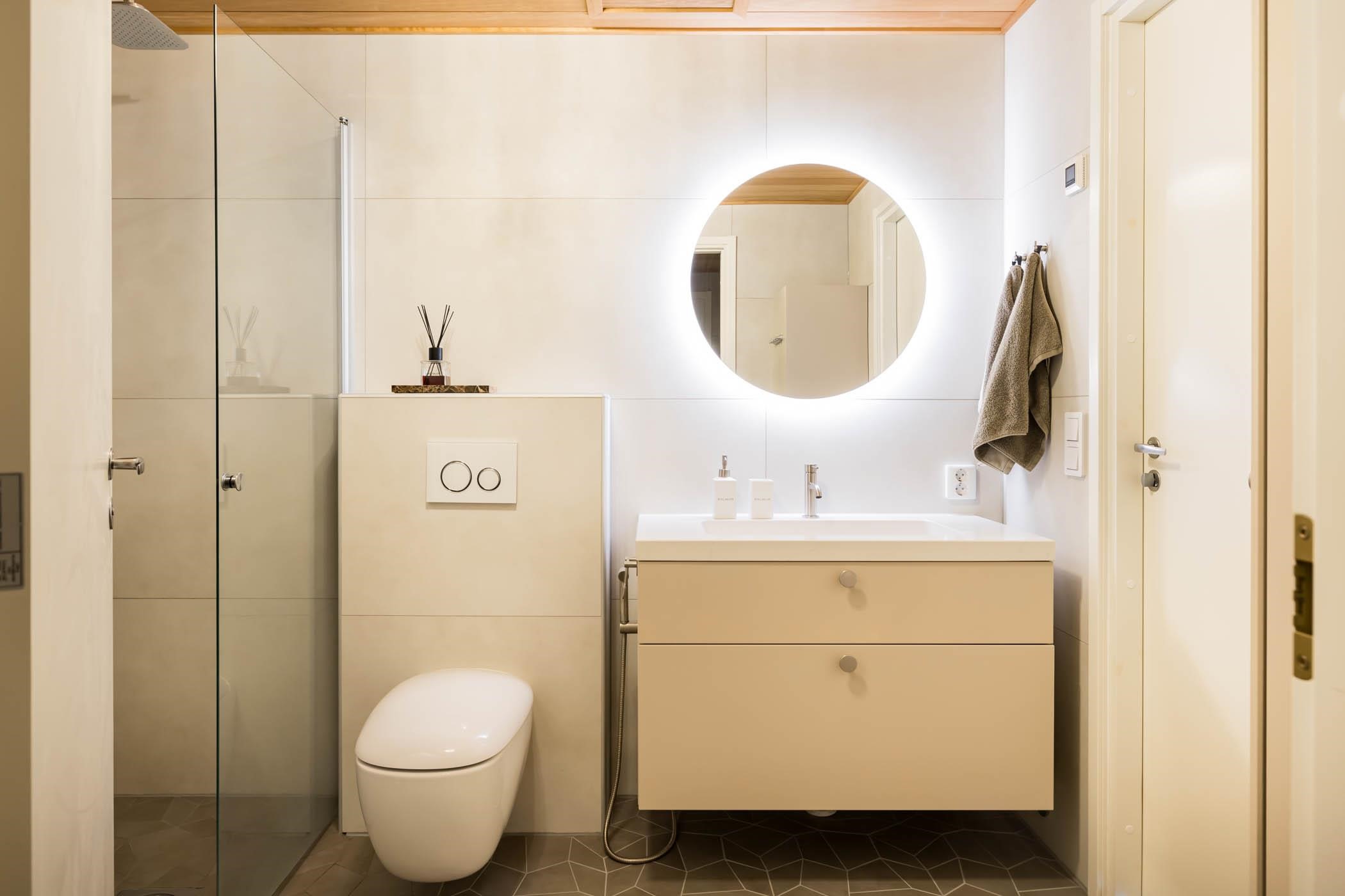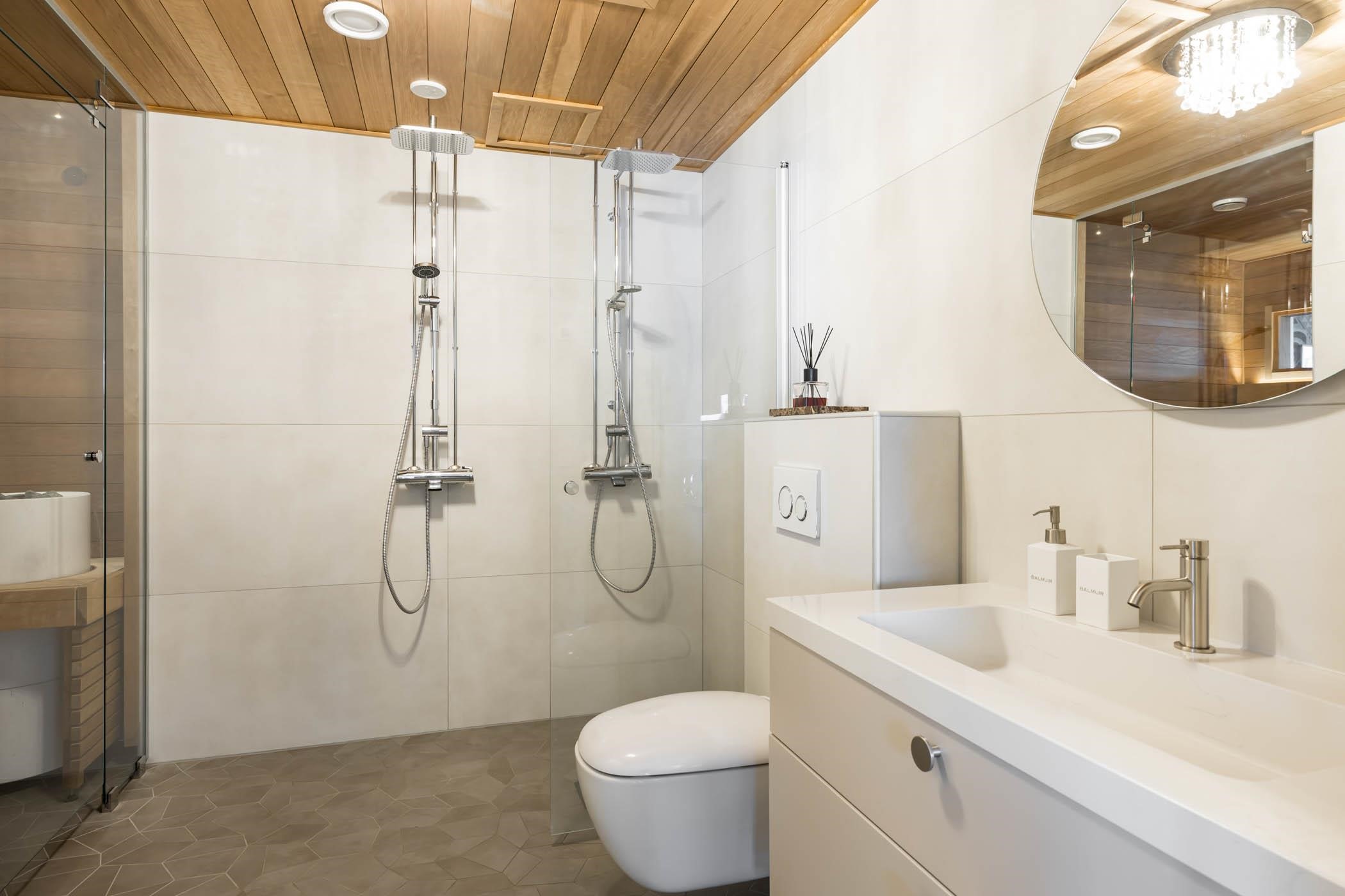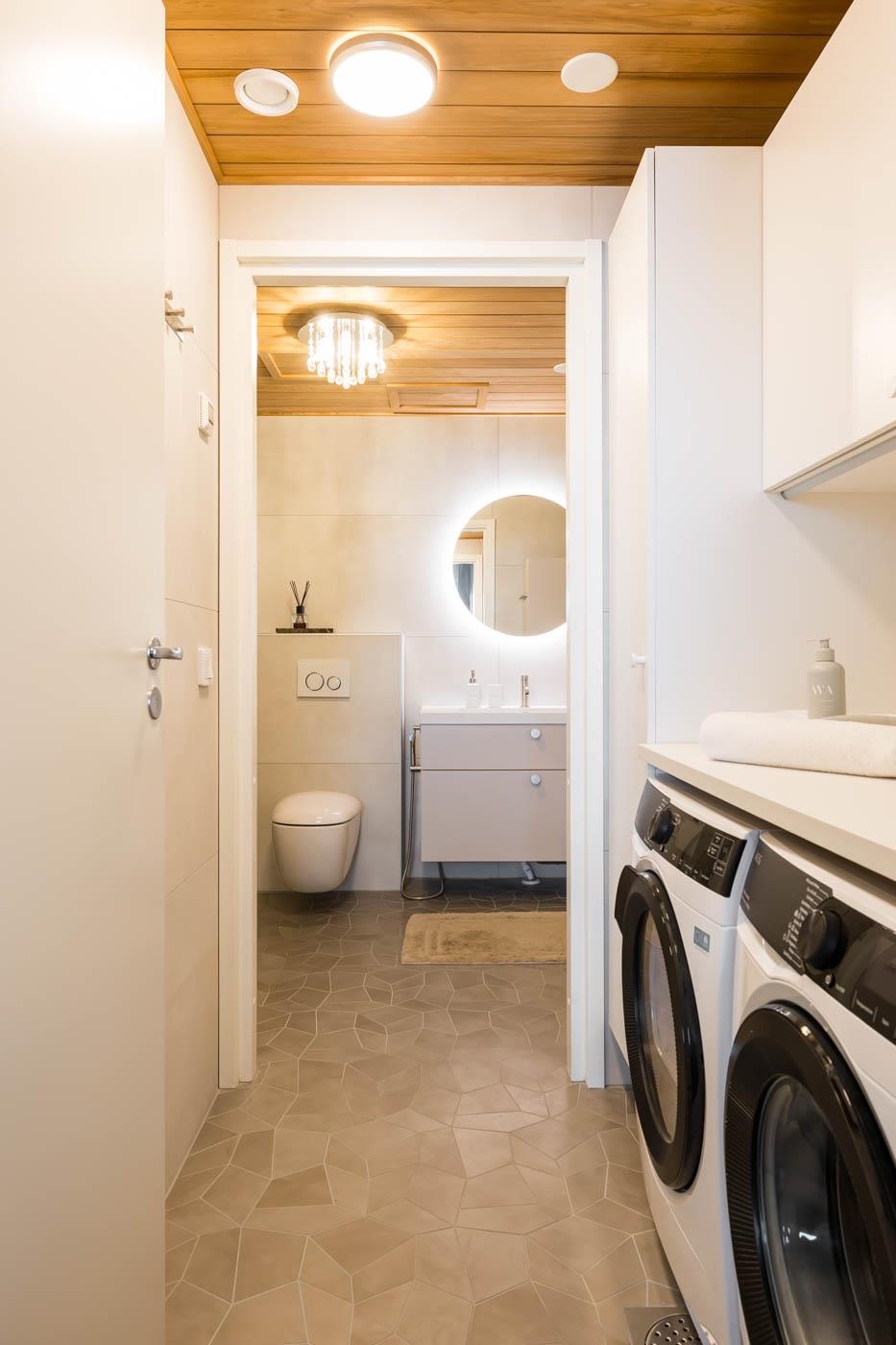 - Tunnelmallisessa saunassa on lämpökäsiteltyä haapaa ja lisätyönä tehty valoa tuova ikkuna. Sauna lämpiää Tulikiven Kuuran laadukkaalla kiukaalla. Saunassa on linear valotanko (led-valaisua). Tyylikkäästi laatoitetussa kylpyhuoneessa on kaksi sadesuihkua ja kääntyvä suihkuseinä. Kylpyhuoneessa on allaskaapisto, valopeili ja seinä-wc. Kodinhoitohuoneessa on kaapistot, työtasoa ja pesukoneliitäntä (pesukone ja kuivausrumpu mahtuvat vierekkäin). Makuuhuoneesta on kulku kodinhoitohuoneen kautta kylpyhuoneeseen.