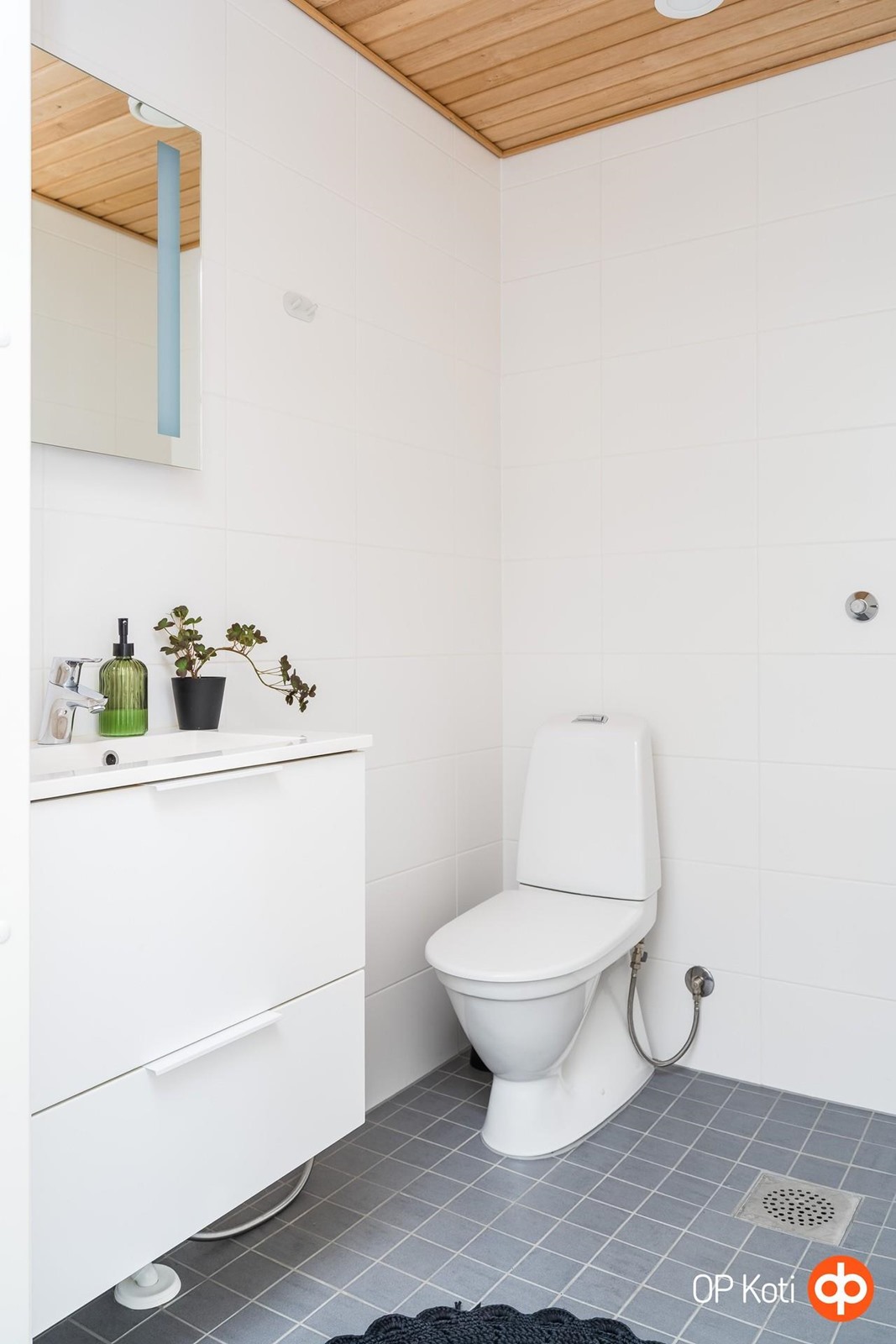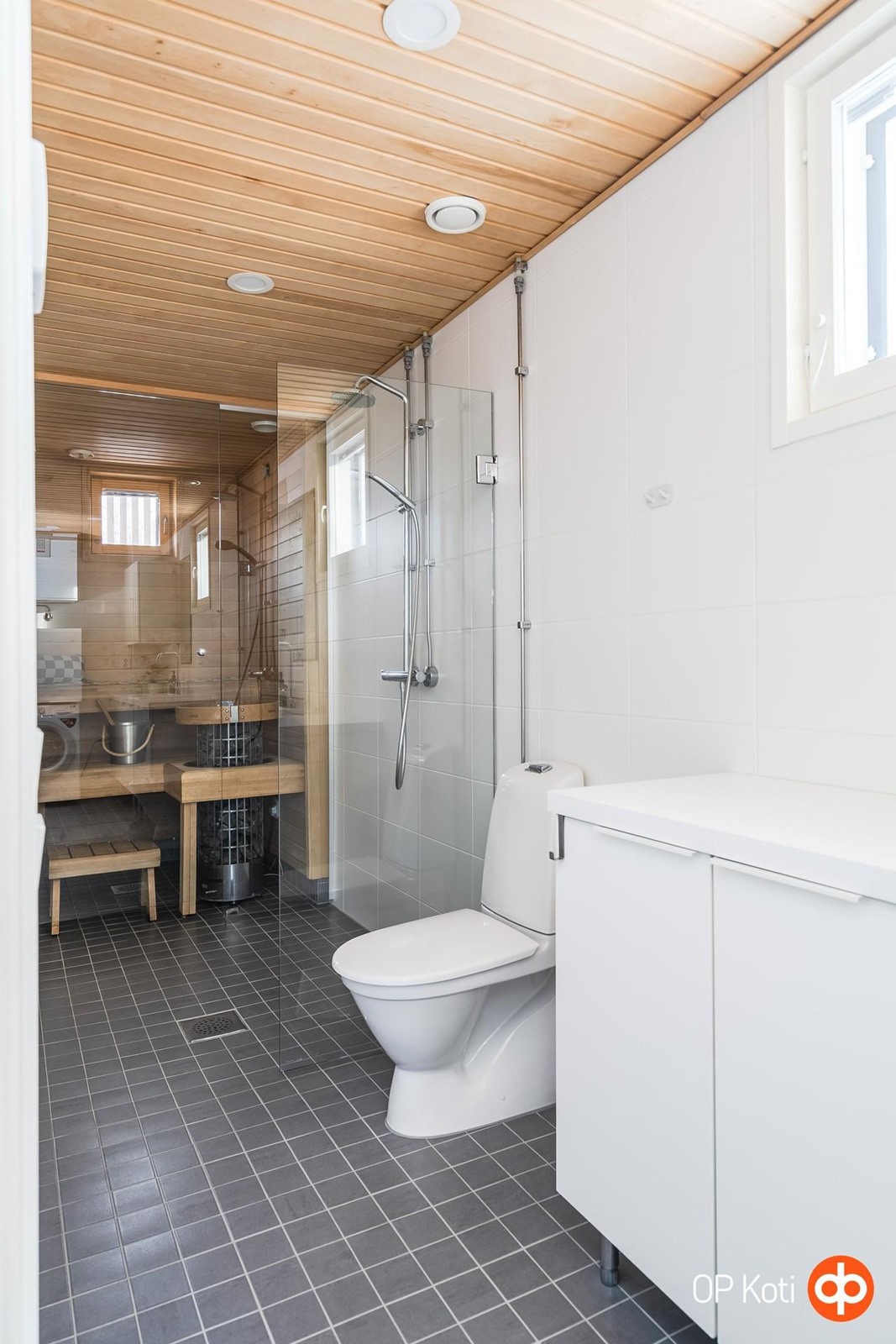 - Yläkerran tyylikäs kylpyhuone ja alakerrassa sijaitseva erillinen wc-tila tarjoavat arkeen viihtyisyyttä, toimivuutta ja laadukkaita ratkaisuja. Rentouttavat saunahetket syntyvät Harvian integroidulla sähkökiukaalla, joka on tyylikkäästi upotettu alalauteeseen ja luo tilaan modernin, viimeistellyn ilmeen. Kylpyhuoneessa on käytännöllinen suihku ja suihkuseinä, jotka pitävät tilan siistinä ja helppohoitoisena. Peili- ja säilytyskaapit tuovat runsaasti tilaa arjen tarvikkeille, ja pesukoneliitäntä tarjoaa joustavuutta kodinhoitoon. Vesikiertoinen lattialämmitys tuo miellyttävää lämpöä ja tekee tilasta mukavan vuoden ympäri. Tunnelman ja käytännöllisyyden viimeistelevät kiinteät valaisimet tuoden tiloihin tasaisen ja miellyttävän valon. Erillisessä wc-tilassa on allaskaappi ja peili. Tilassa on suihkuvaraus, joka tarjoaa mahdollisuuden muuntaa tila tarvittaessa toiseksi kylpyhuoneeksi.