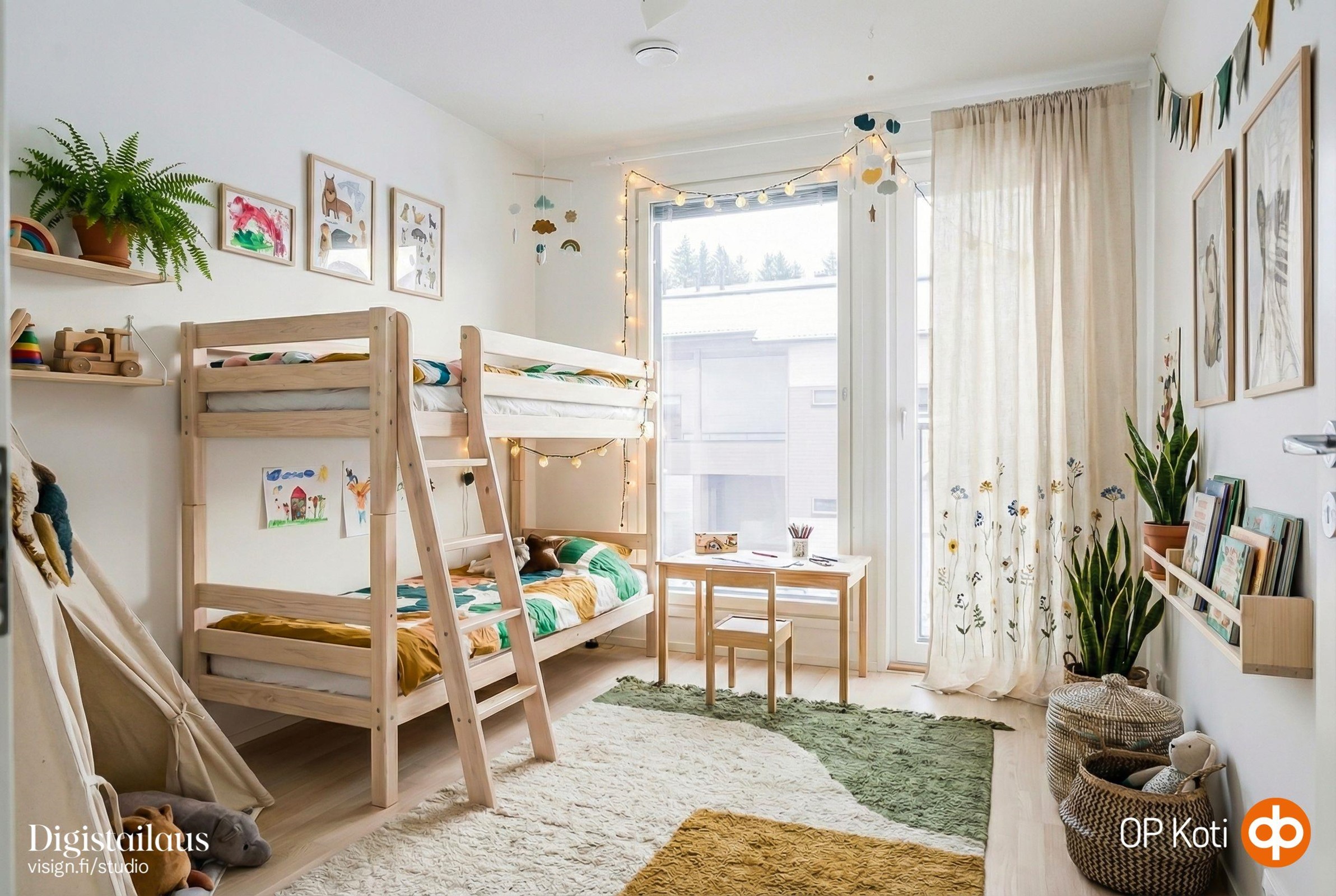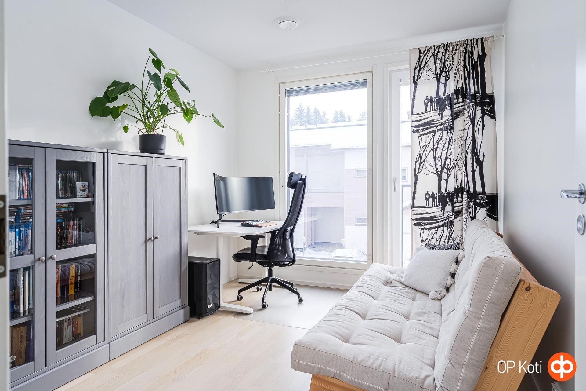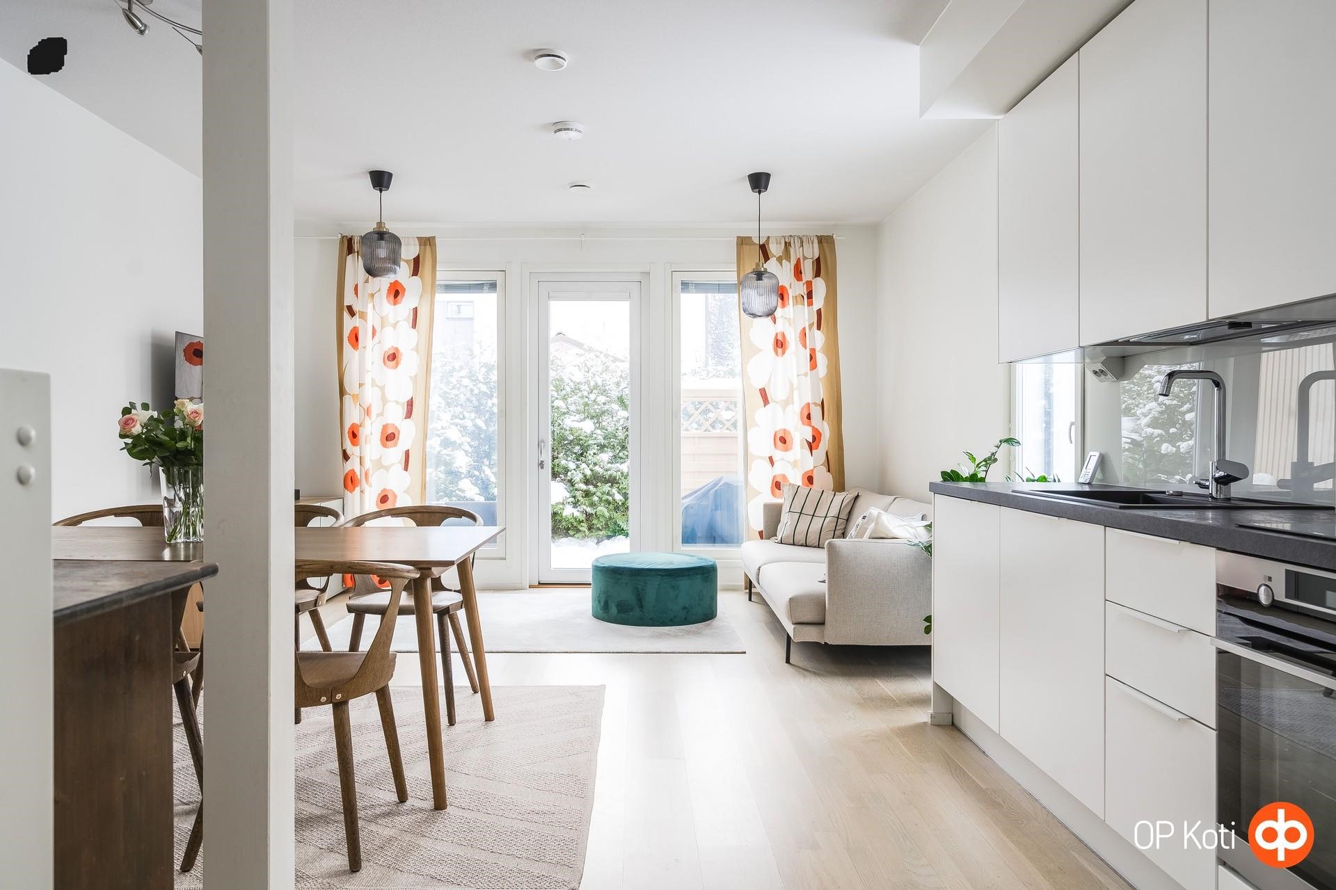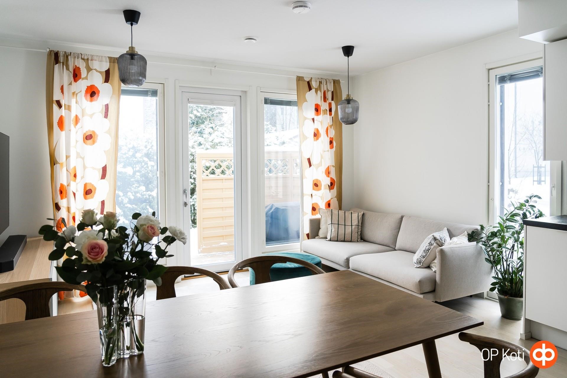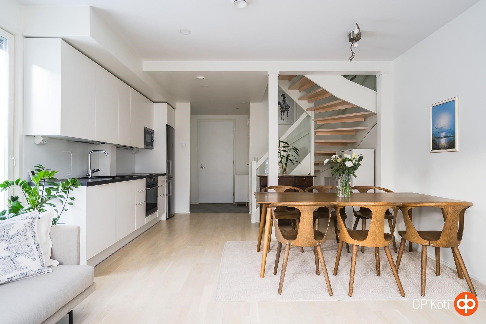 Tämä Jokiniemessä sijaitsevan rivitalon päätyhuoneisto on paikka, johon on helppo ihastua. Se tuntuu kodilta heti kynnyksellä - lämpimältä, selkeältä ja rauhoittavalta. Pohjaratkaisu elää elämäsi mukana, muuntuu eri vaiheisiin ja tarjoaa arkeen sellaista sujuvuutta, jonka huomaa joka päivä, mutta arvostaa vielä enemmän kiireen keskellä.