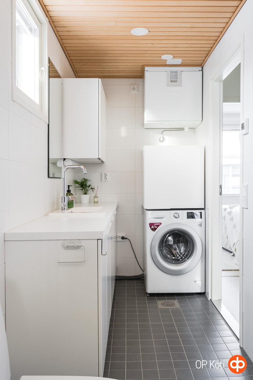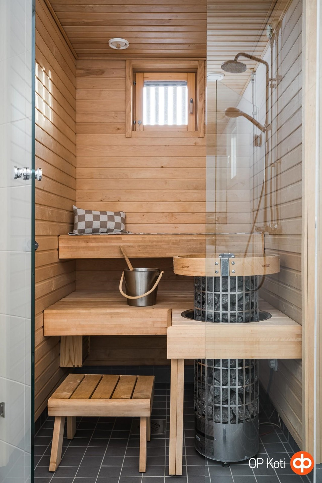 Yläkerran kylpyhuone hurmaa spa-henkisellä tunnelmallaan: kirkkaat lasiseinät tuovat avaruutta ja modernia ilmettä ja Harvian integroidun pilarikiukaan pehmeistä löylyistä nauttiminen on ollut nykyisille asukkaille todellinen arjen ylellisyys, erityisesti joenvarren lenkkien, ulkokuntosalitreenien tai talvisen hiihtolenkin jälkeen. Toimiva pyykinhoitopiste ja käytännölliset säilytysratkaisut tekevät arjesta mutkatonta.